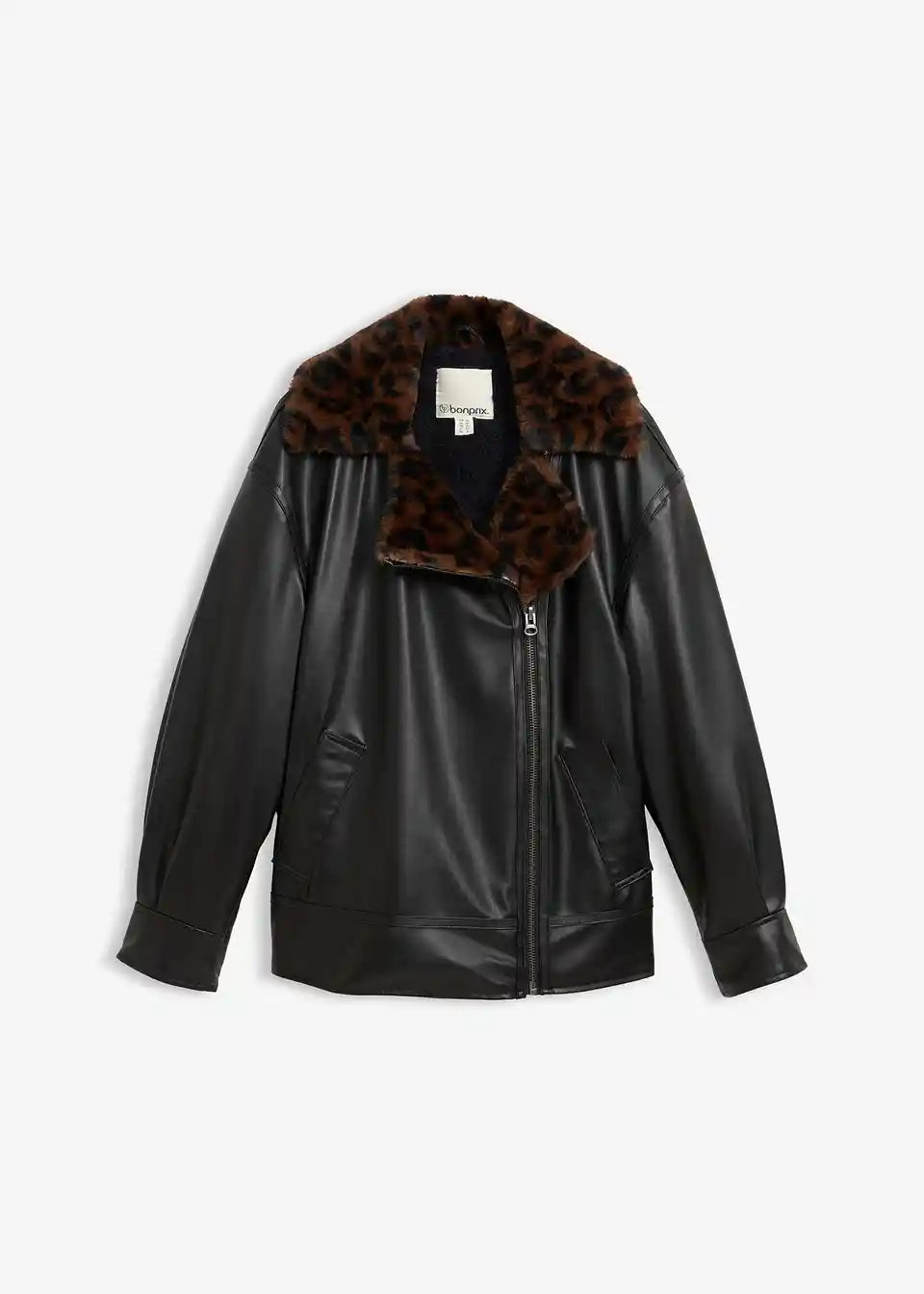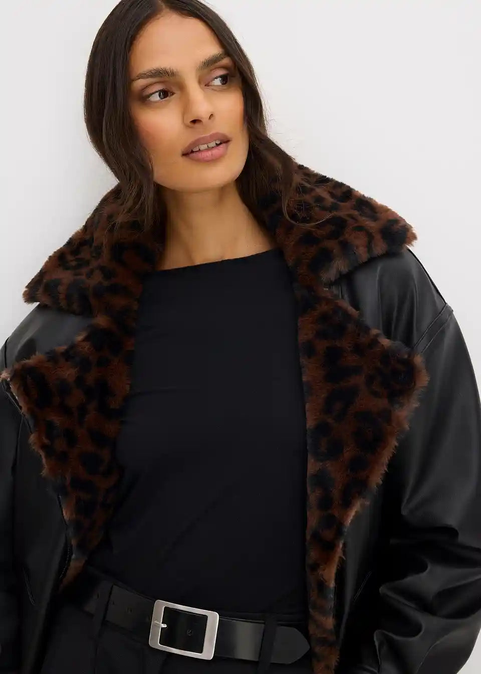 Jakna iz umetnega usnja z leopardjim umetnim krznom