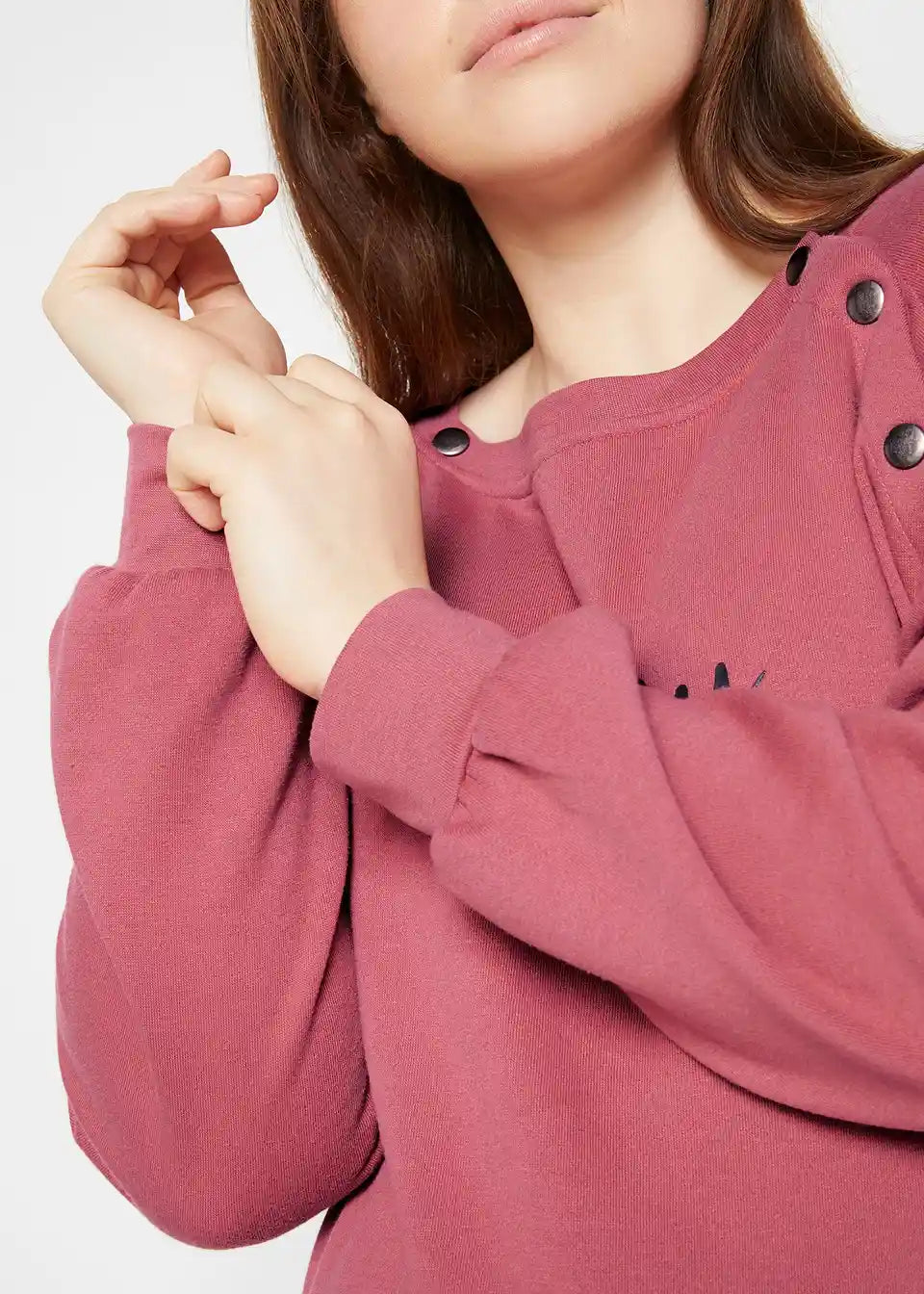 Udobna majica iz mehke mešanice bombaža z rahlo kosmateno notranjo stranjo. Pritrdilni pritiskači na zgornjem delu omogočajo enostavno in diskretno dojenje. Mehki rebrasti patenti na rokavih, robu in izrezu poskrbijo za prijetno udobje pri nošenju. Idealno za nosečnost in čas dojenja.
