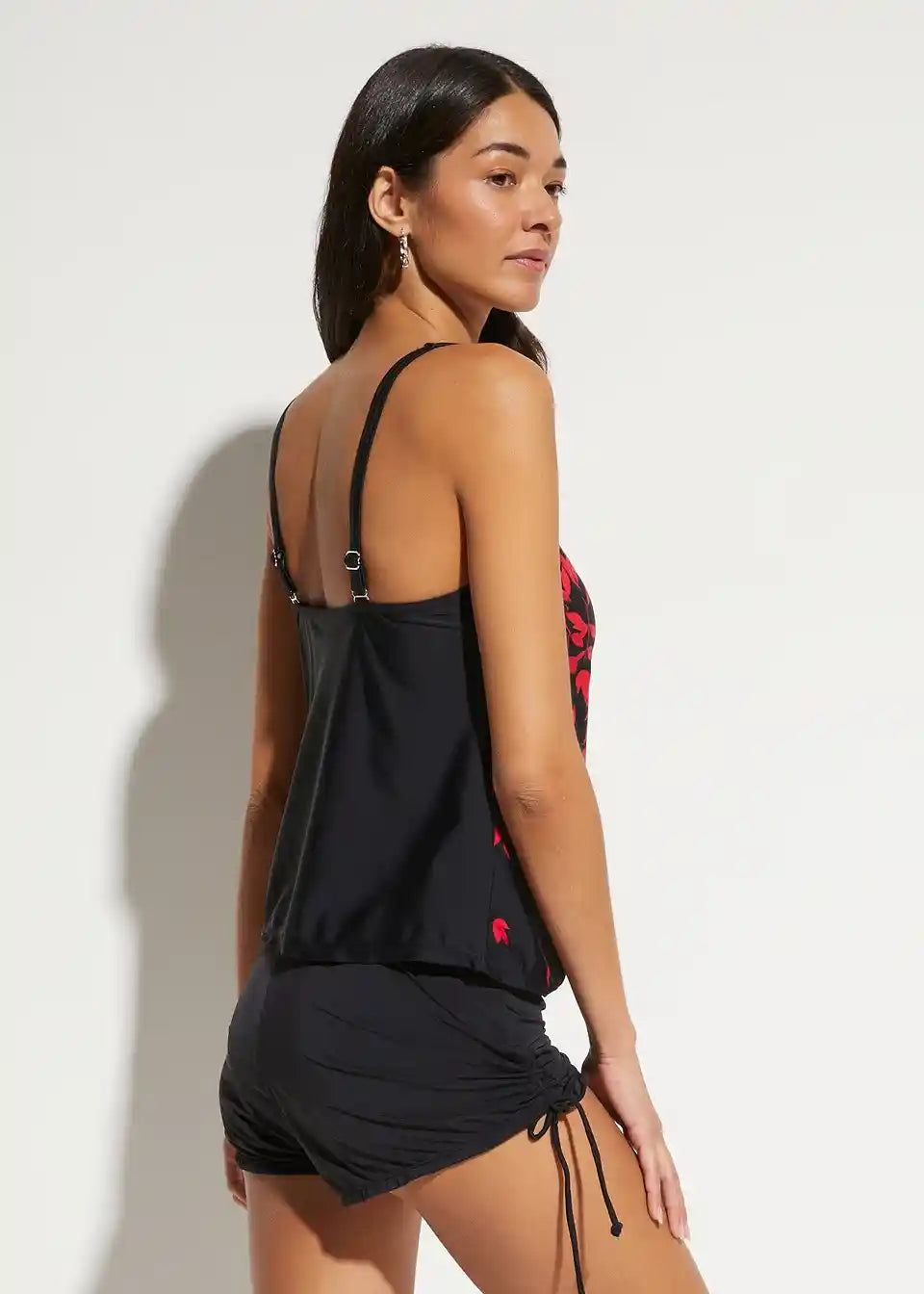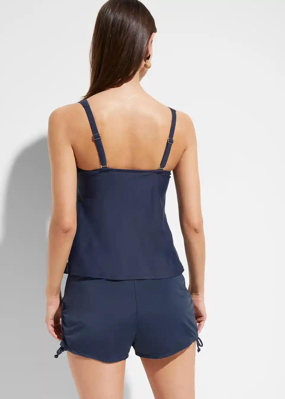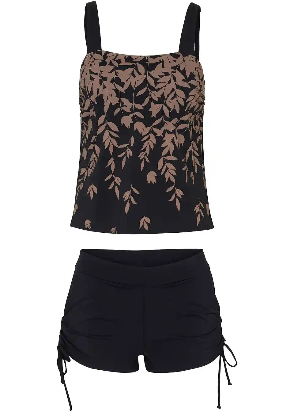 Z integriranimi mehko oblikovanimi košaricami, podlogo za prsi in spodnjim elastičnim trakom. Nastavljive naramnice. Bikini hlačke nastavljive s stranskimi trakovi za zavezovanje.