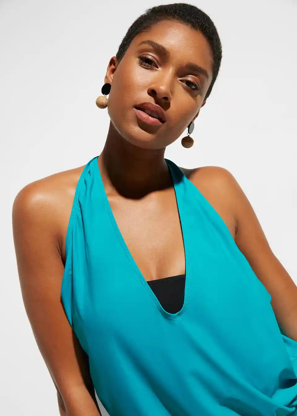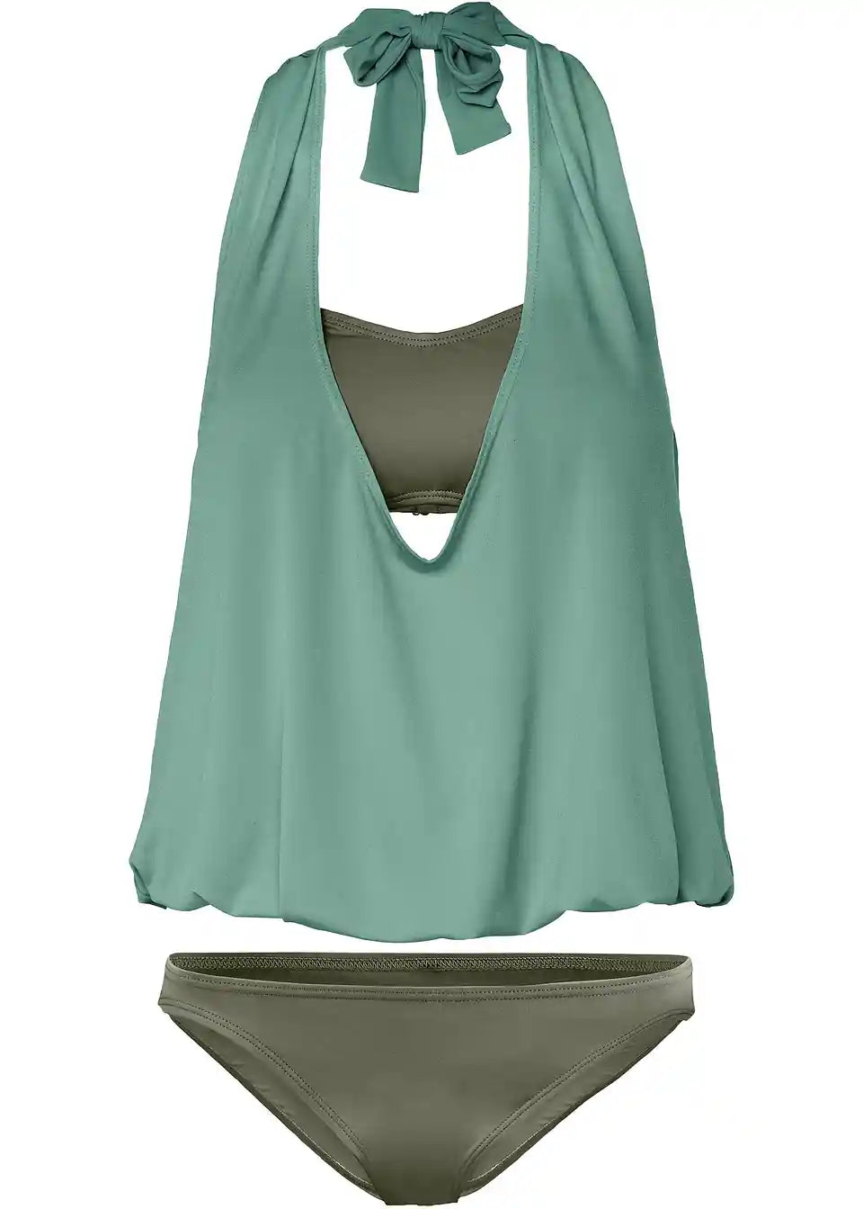 3-delni Tankini, sestavljen iz bustierja, tanktopa in bikini hlačk. Zgornji del je nekoliko širše krojen z V-izrezom v obliki vratnega traku. Bandeau zgornji del z podlogo za prsi in odstranljivimi mehkimi košaricami. Povsod elastična spodnja opora za prsi. Običajne bikini hlačke.