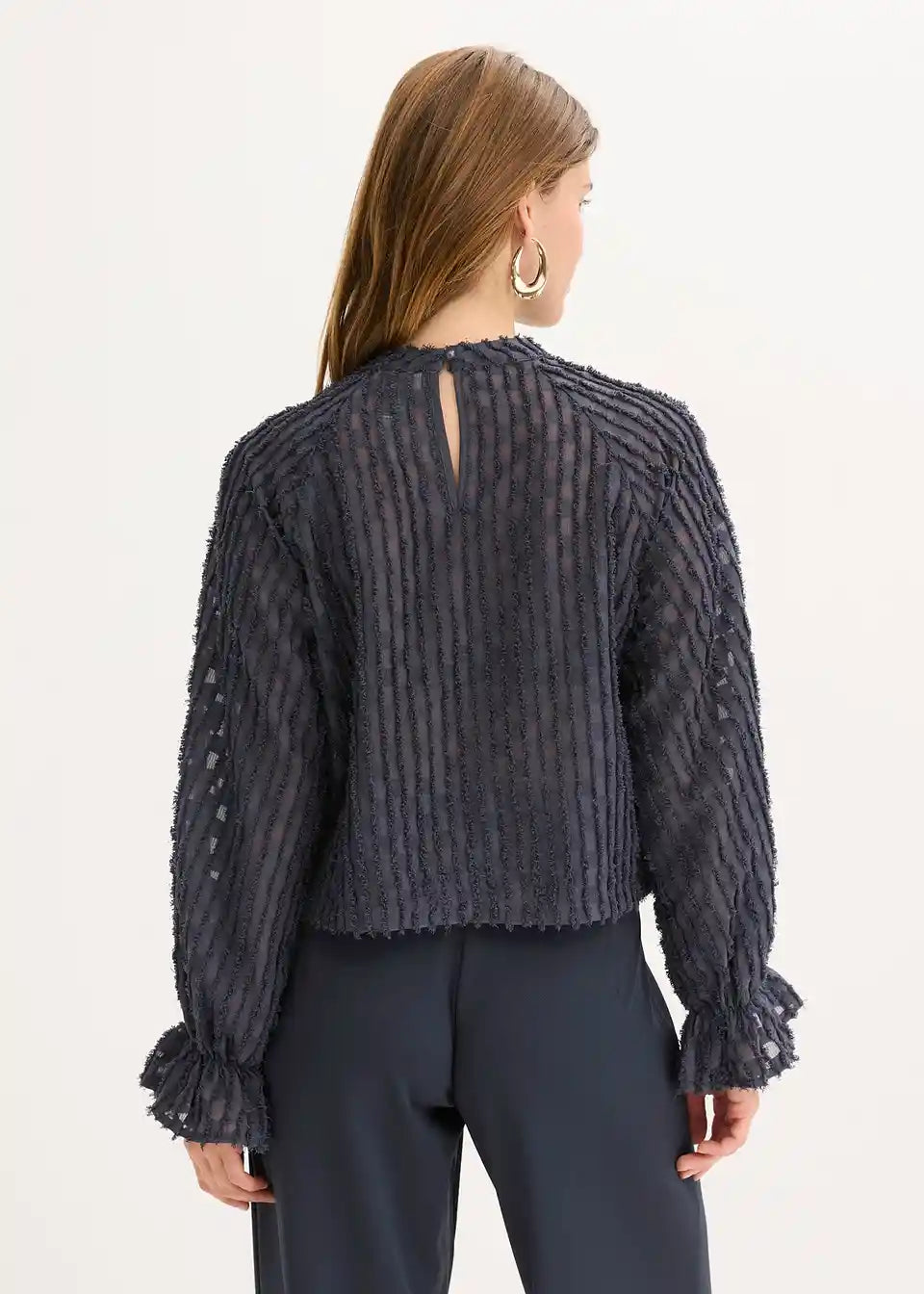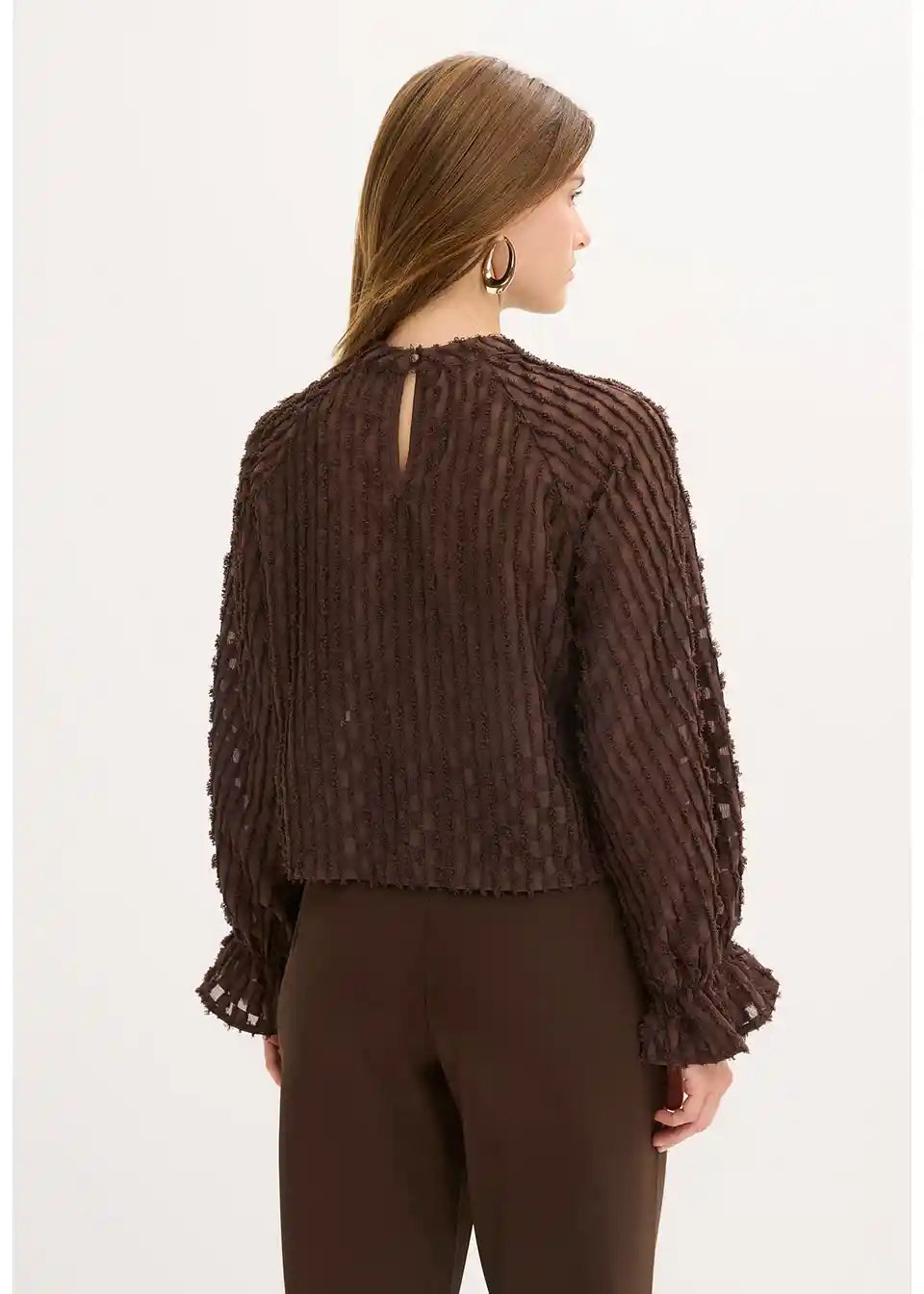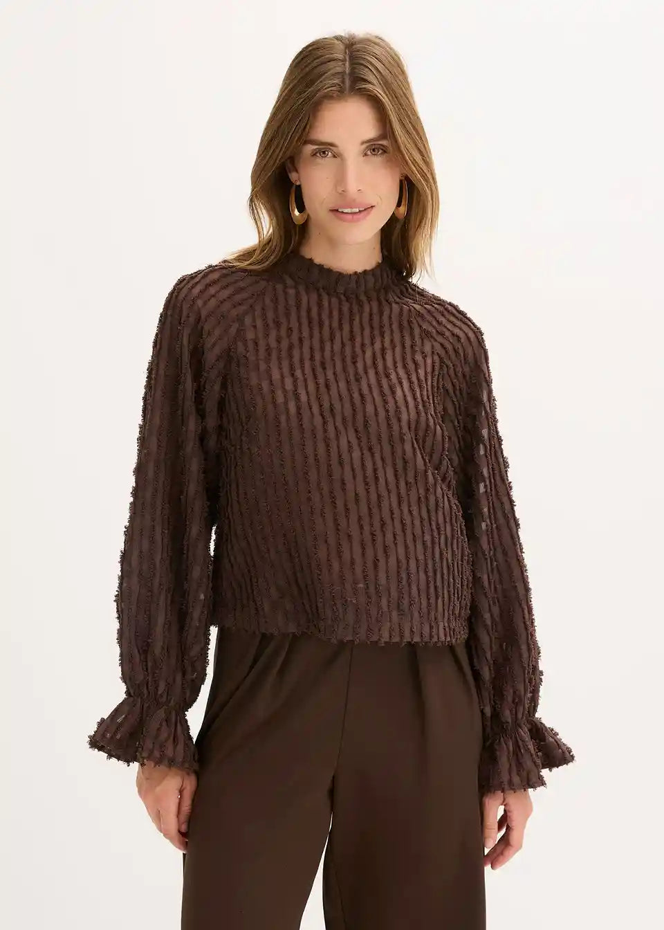 Bluzni top z majhnim pokončnim ovratnikom in elastičnem zaključkom z naborki na rokavih