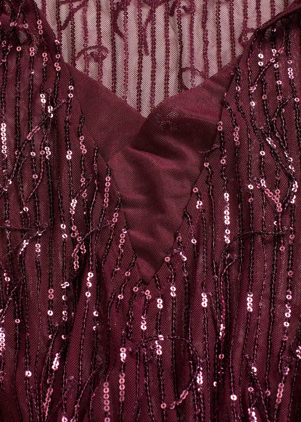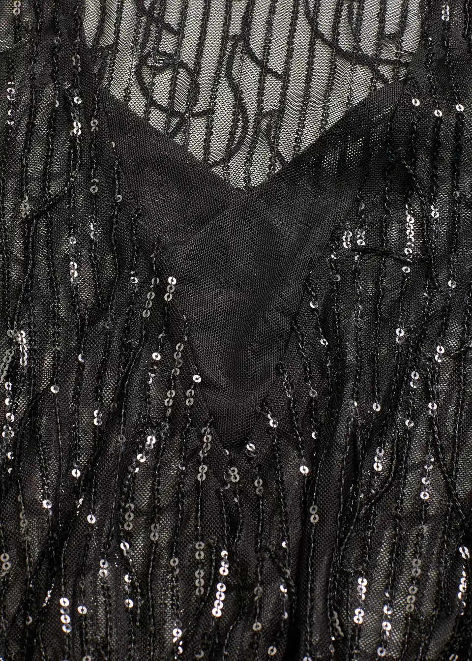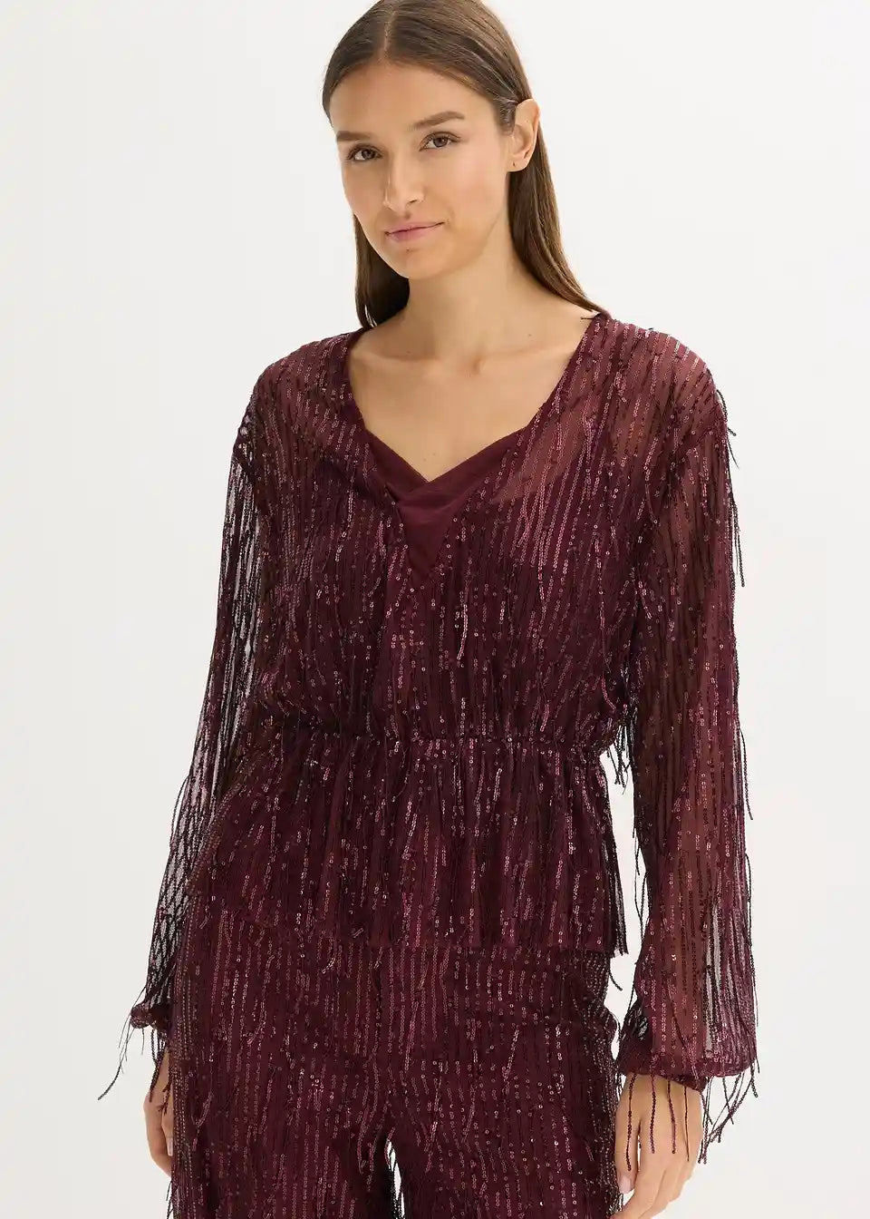 Sijoča bluza iz rahlo elastičnega materiala z bleščicami na resah in globokim izrezom spredaj. Brez podloge.