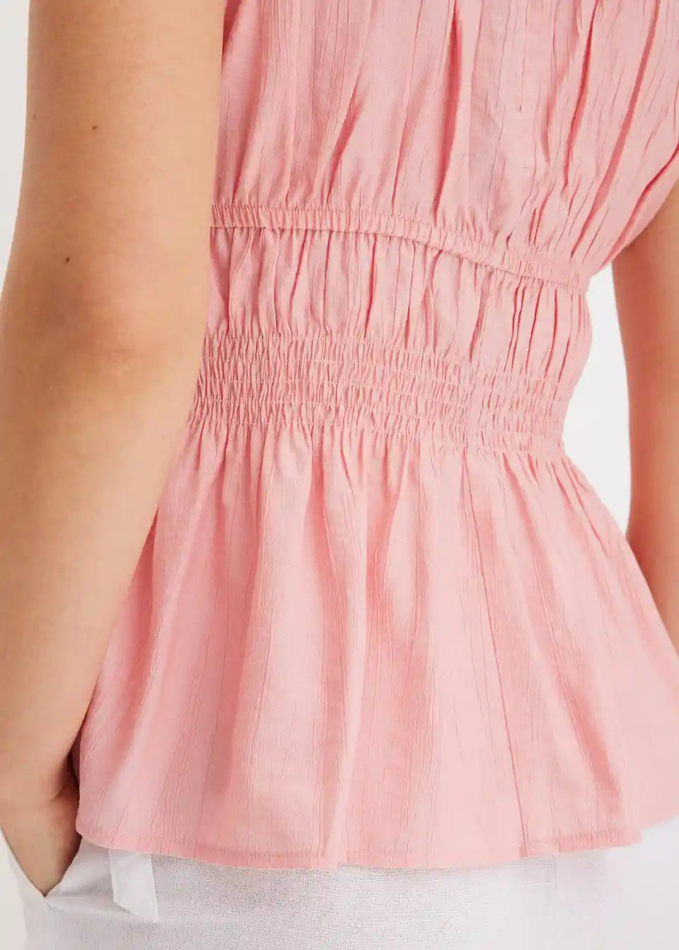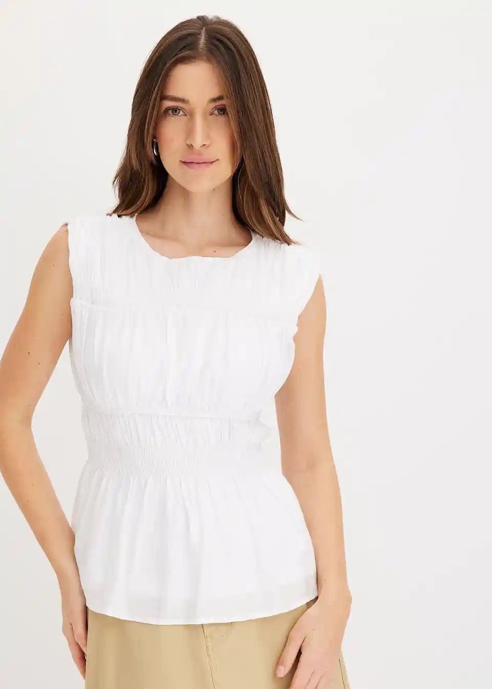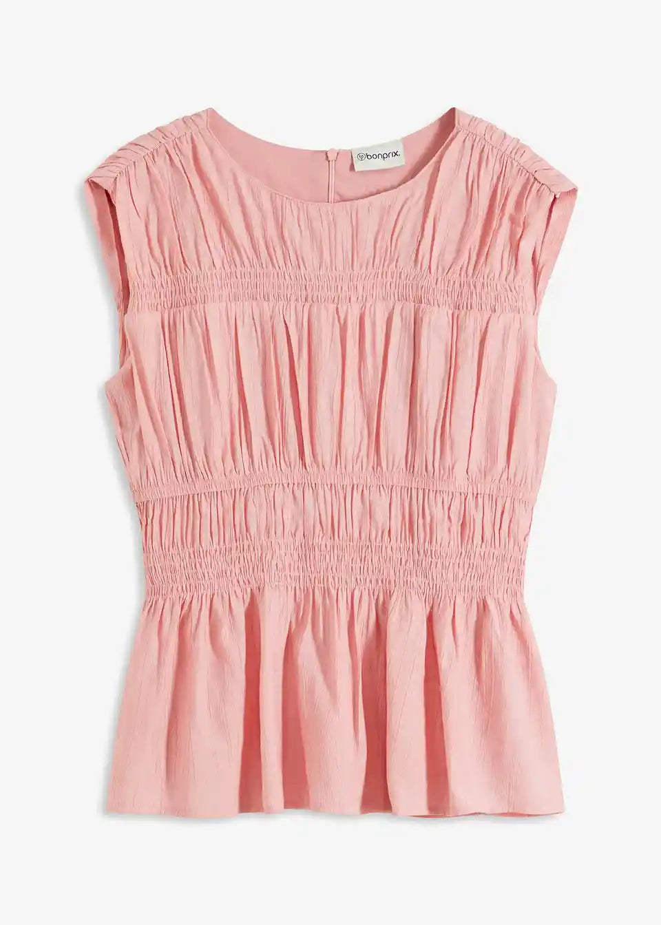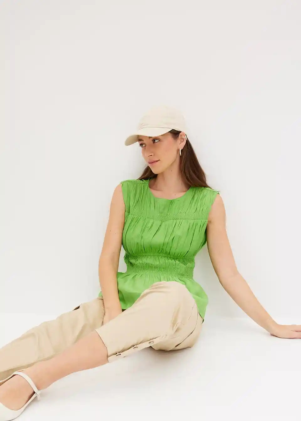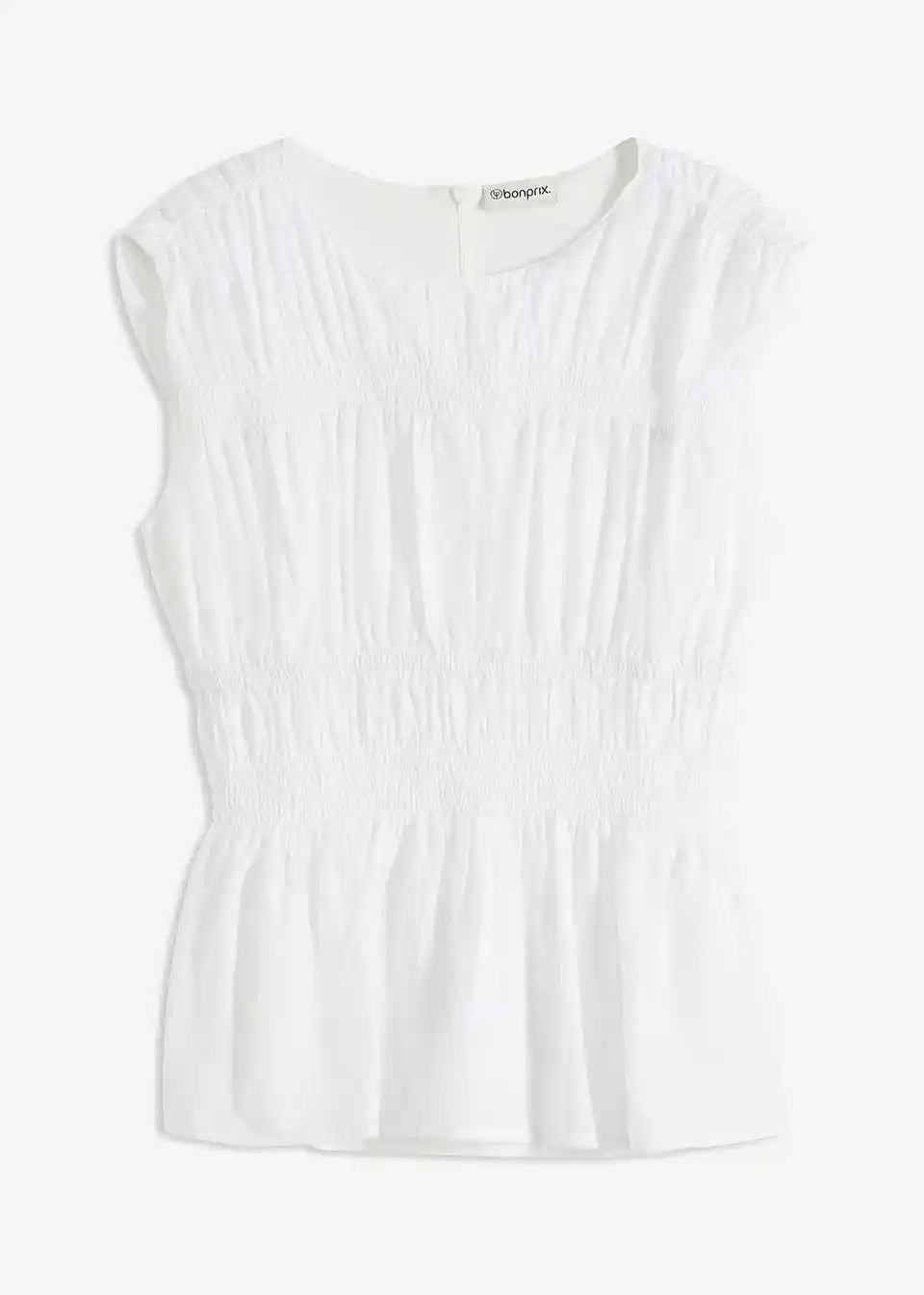 Bluzni top z okroglim izrezom in nabranimi detajli, ki sega do bokov