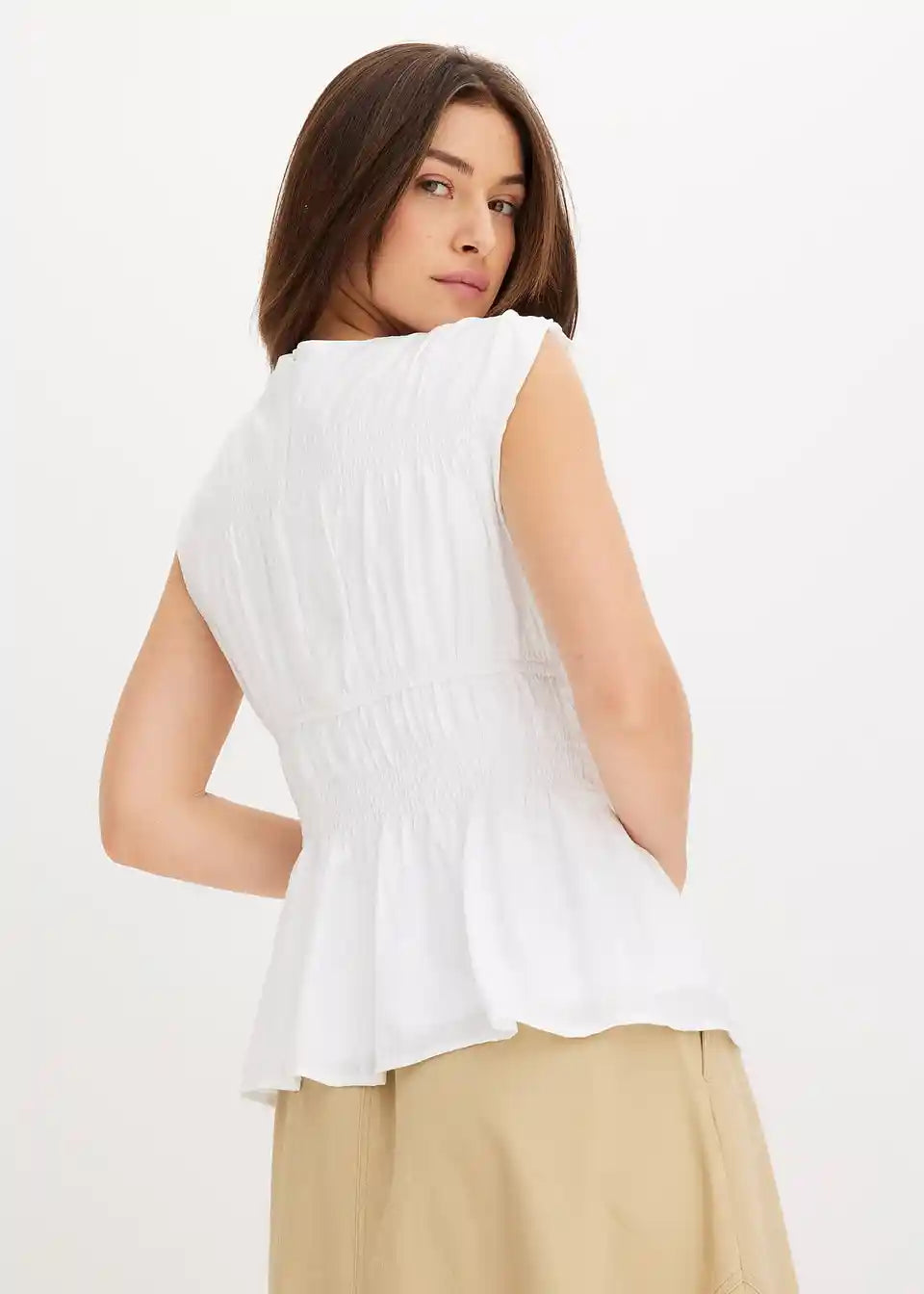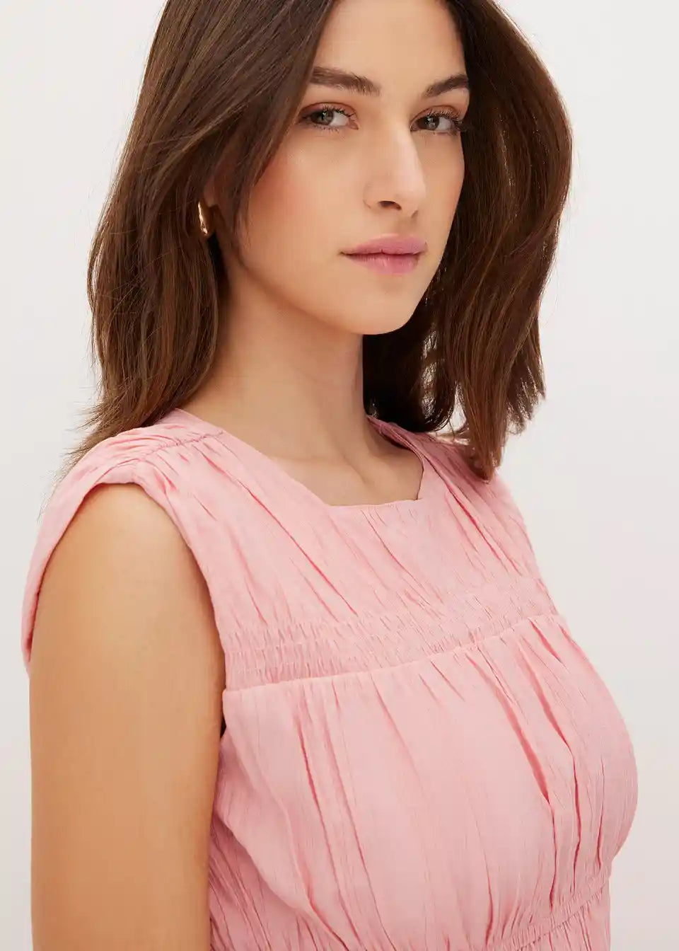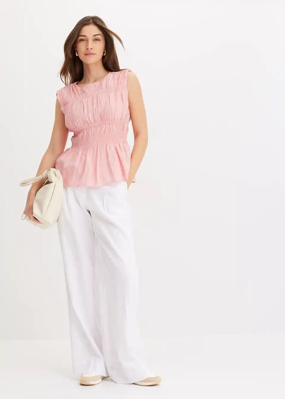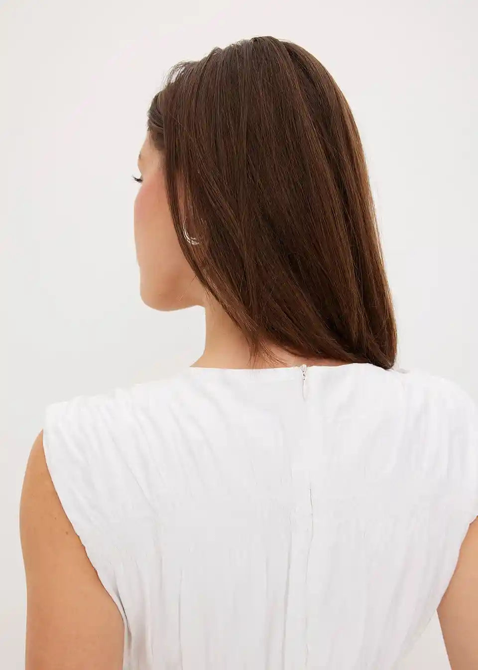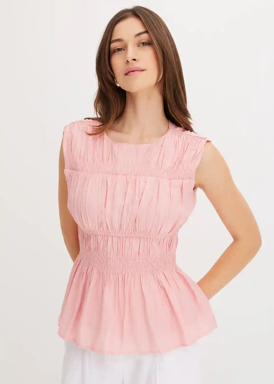 Bluzni top z okroglim izrezom in nabranimi detajli, ki sega do bokov