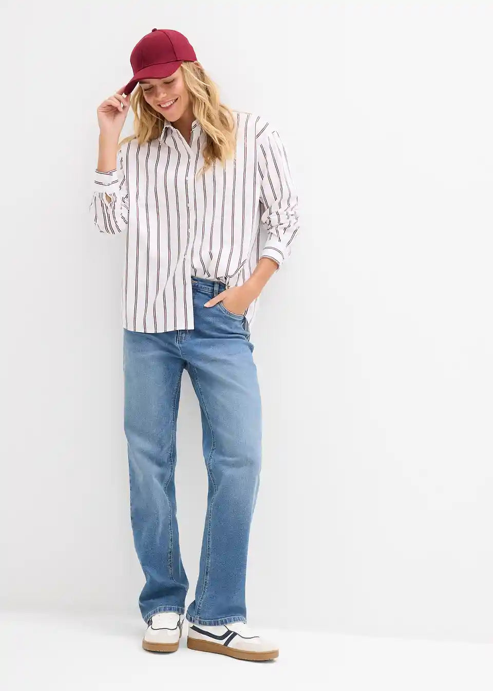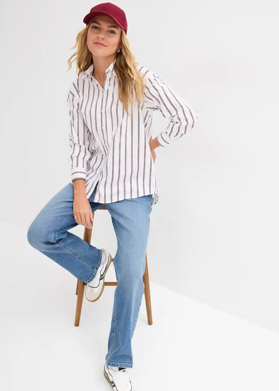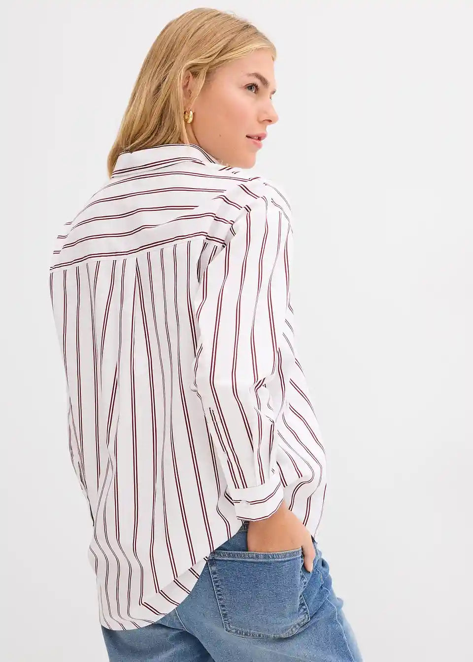 Ohlapna bluza iz bombaža z ovratnikom, z letvijo z gumbi, v rokave podaljšanimi ramami in dolgimi rokavi z manšetami z gumbi.