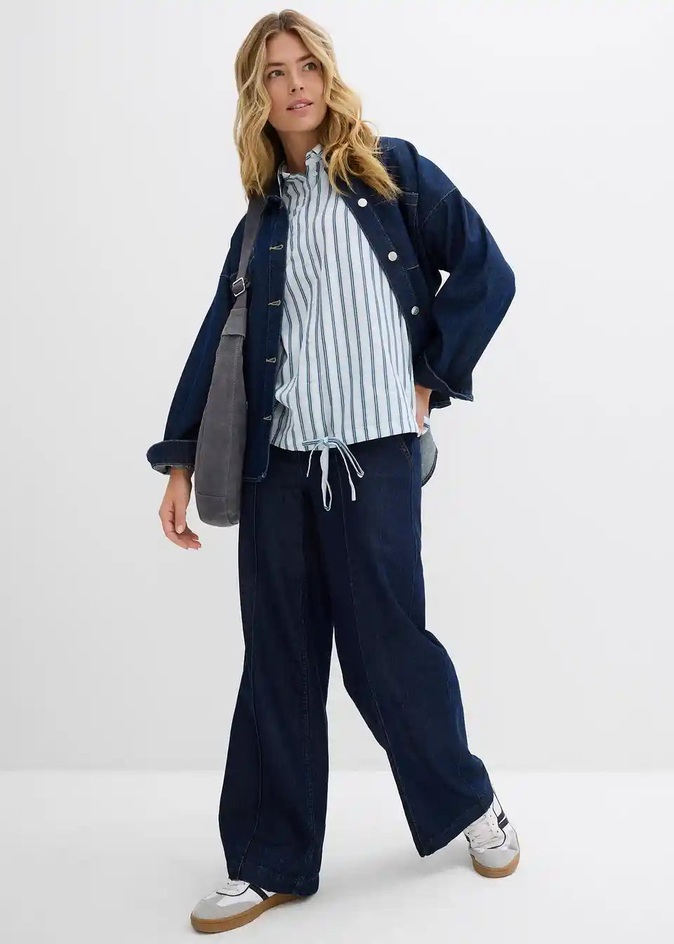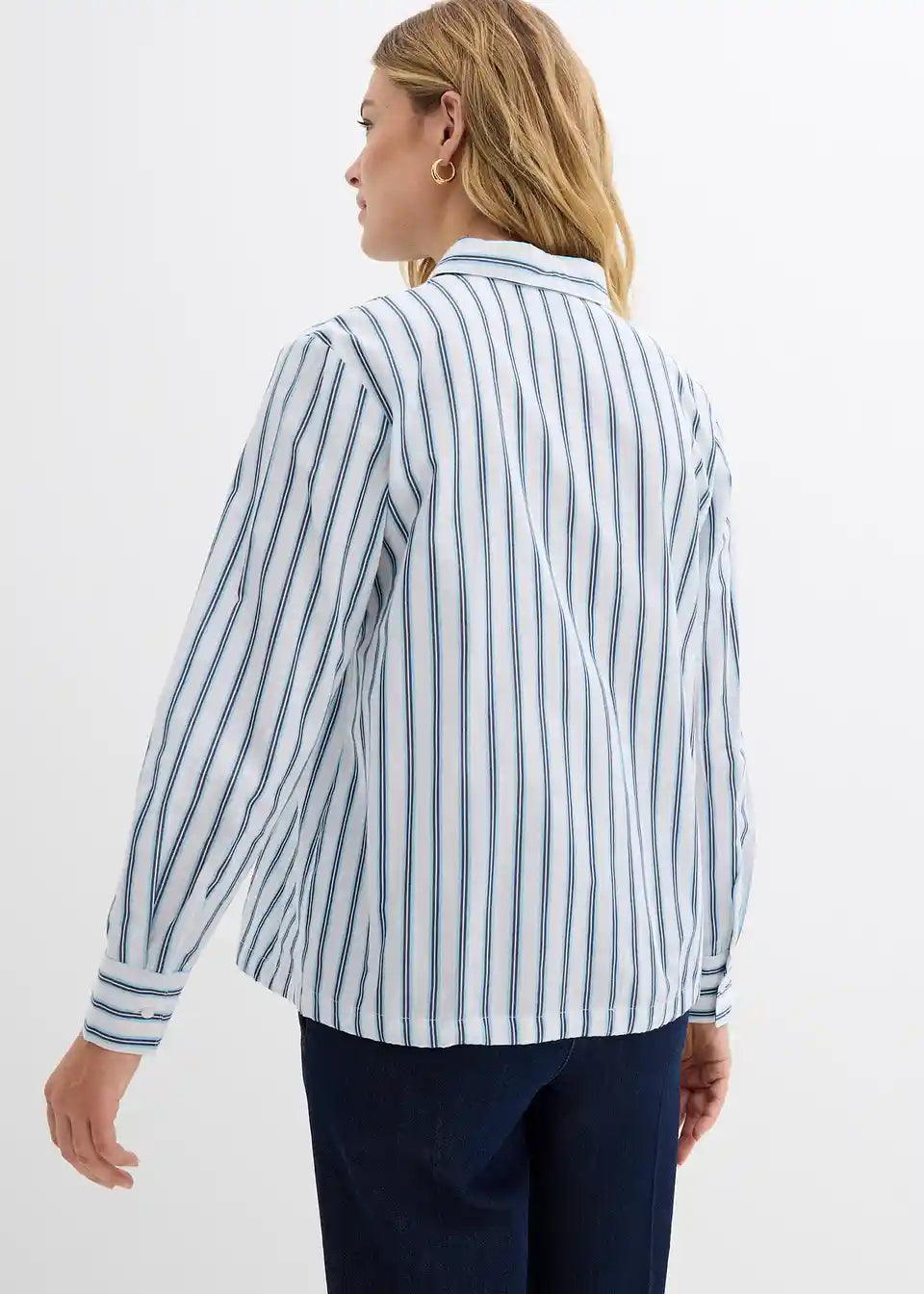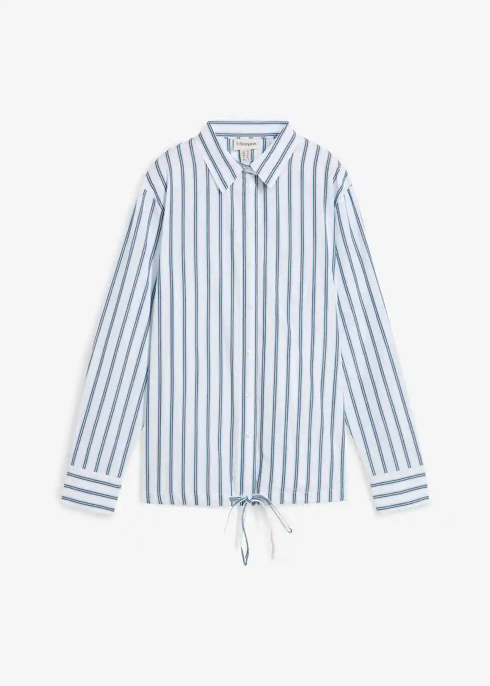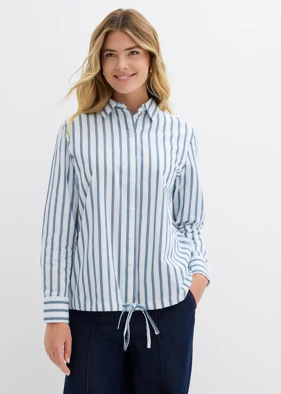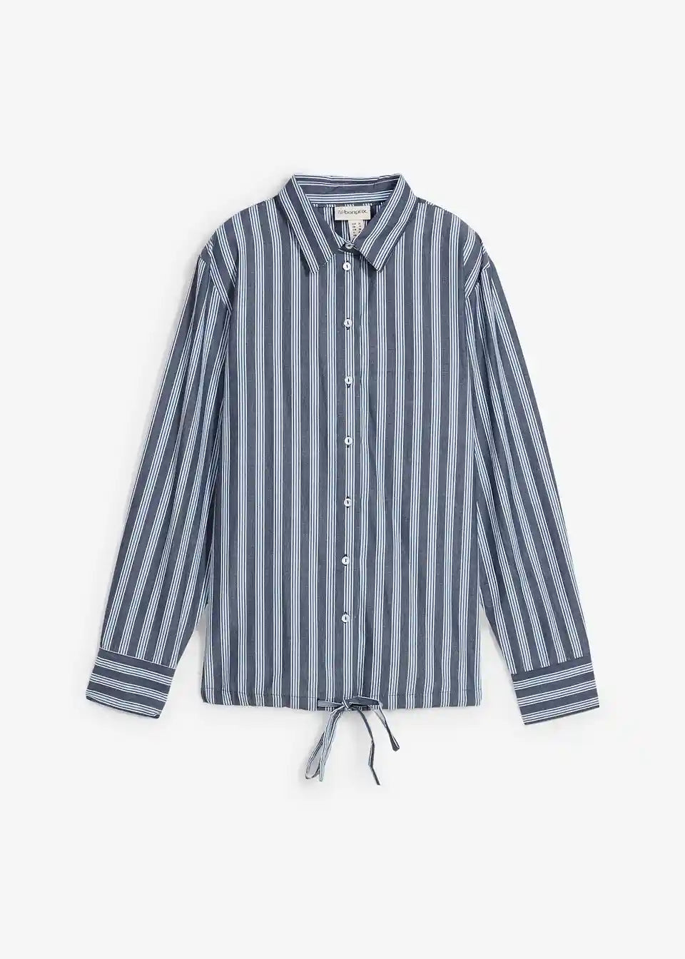 Črtasta bluza z letvijo za zapenjanje z gumbi spredaj in vpeljano vrvico na spodnjem robu.
