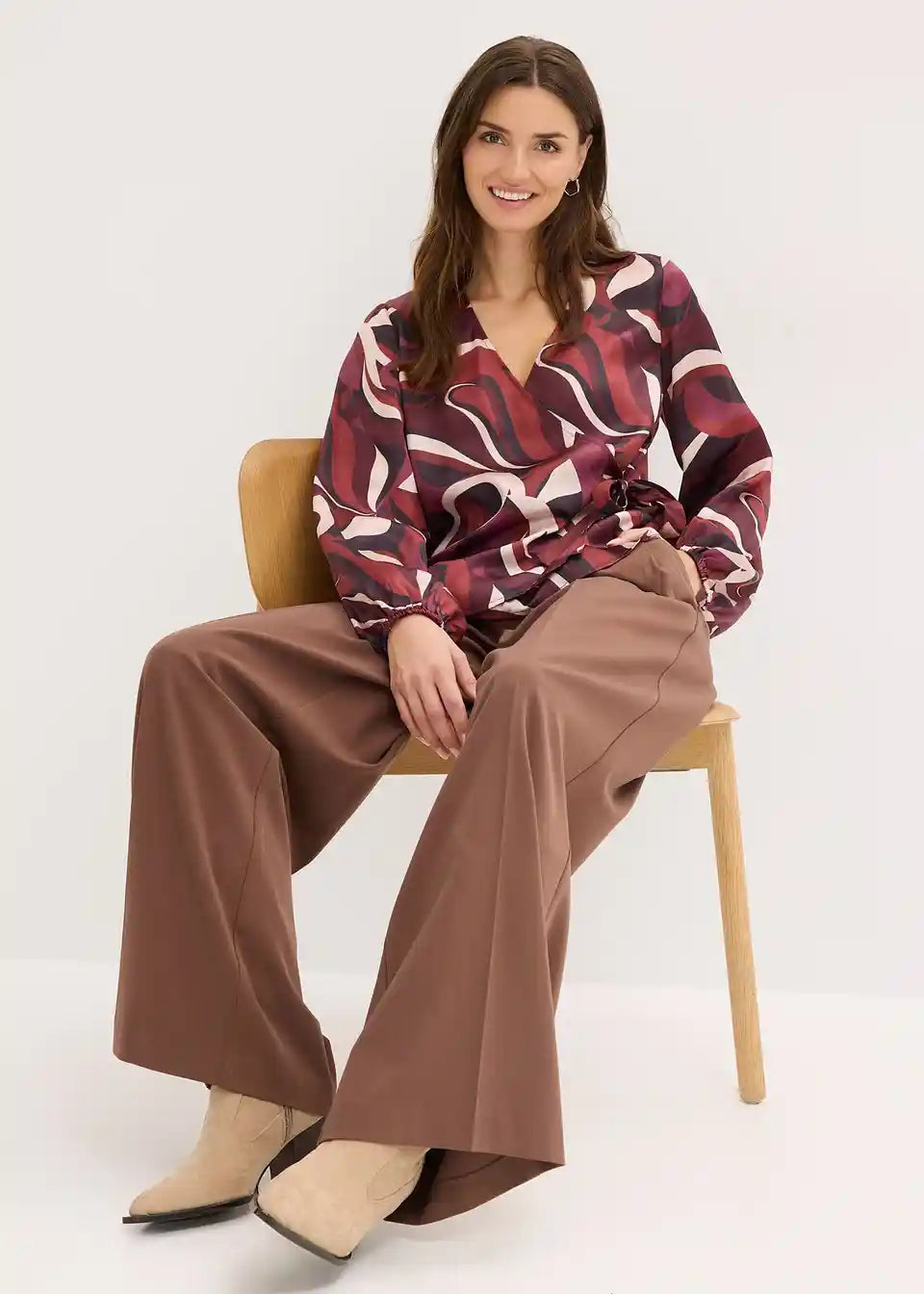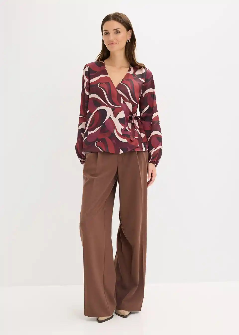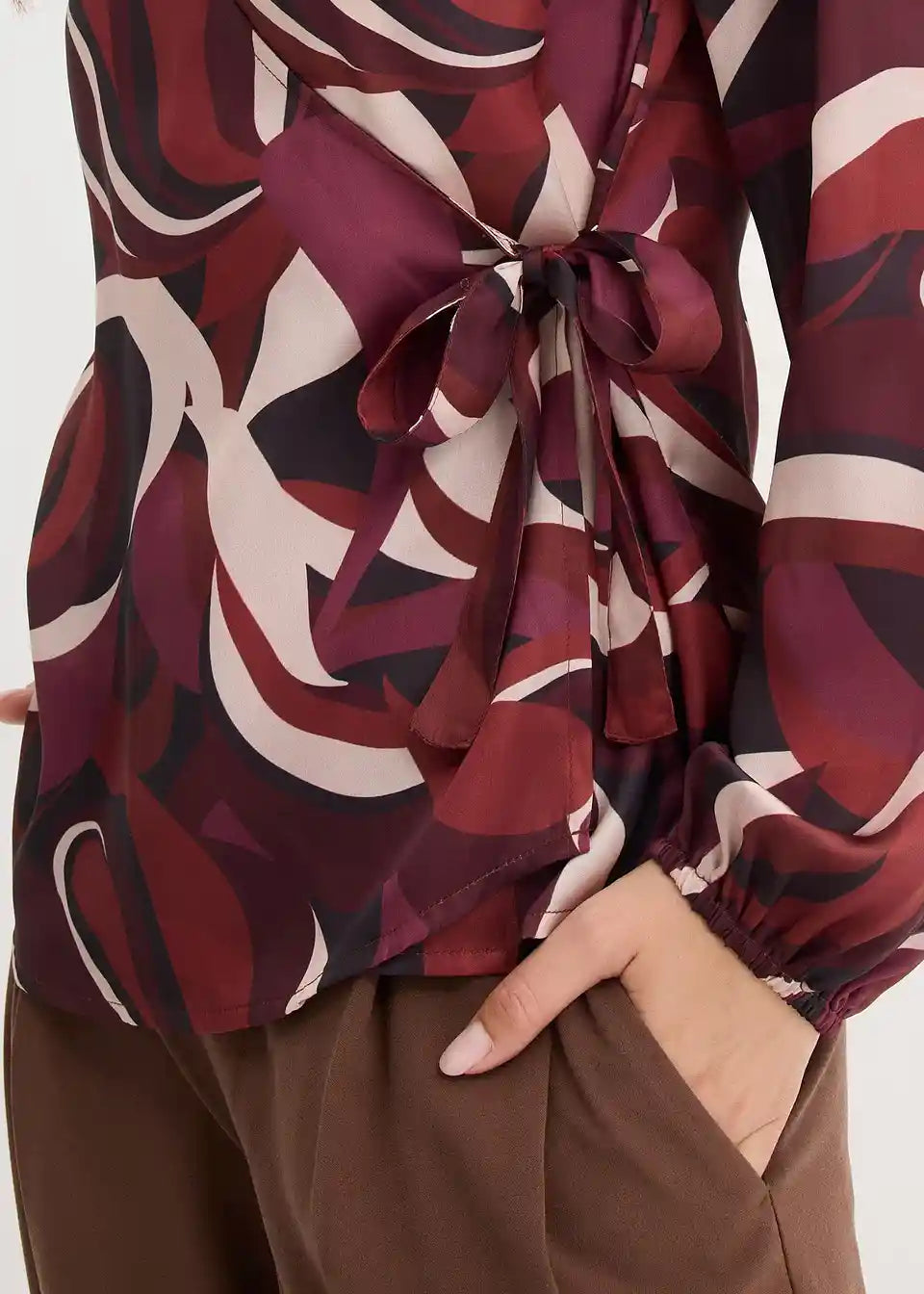 Modno potiskana ovita bluza iz padajočega satena s trakom za zavezovanje znotraj in zunaj