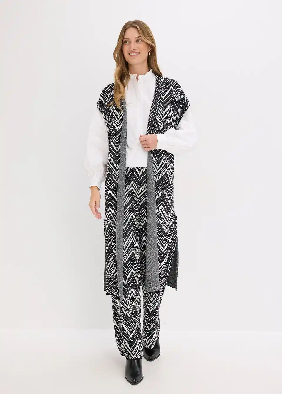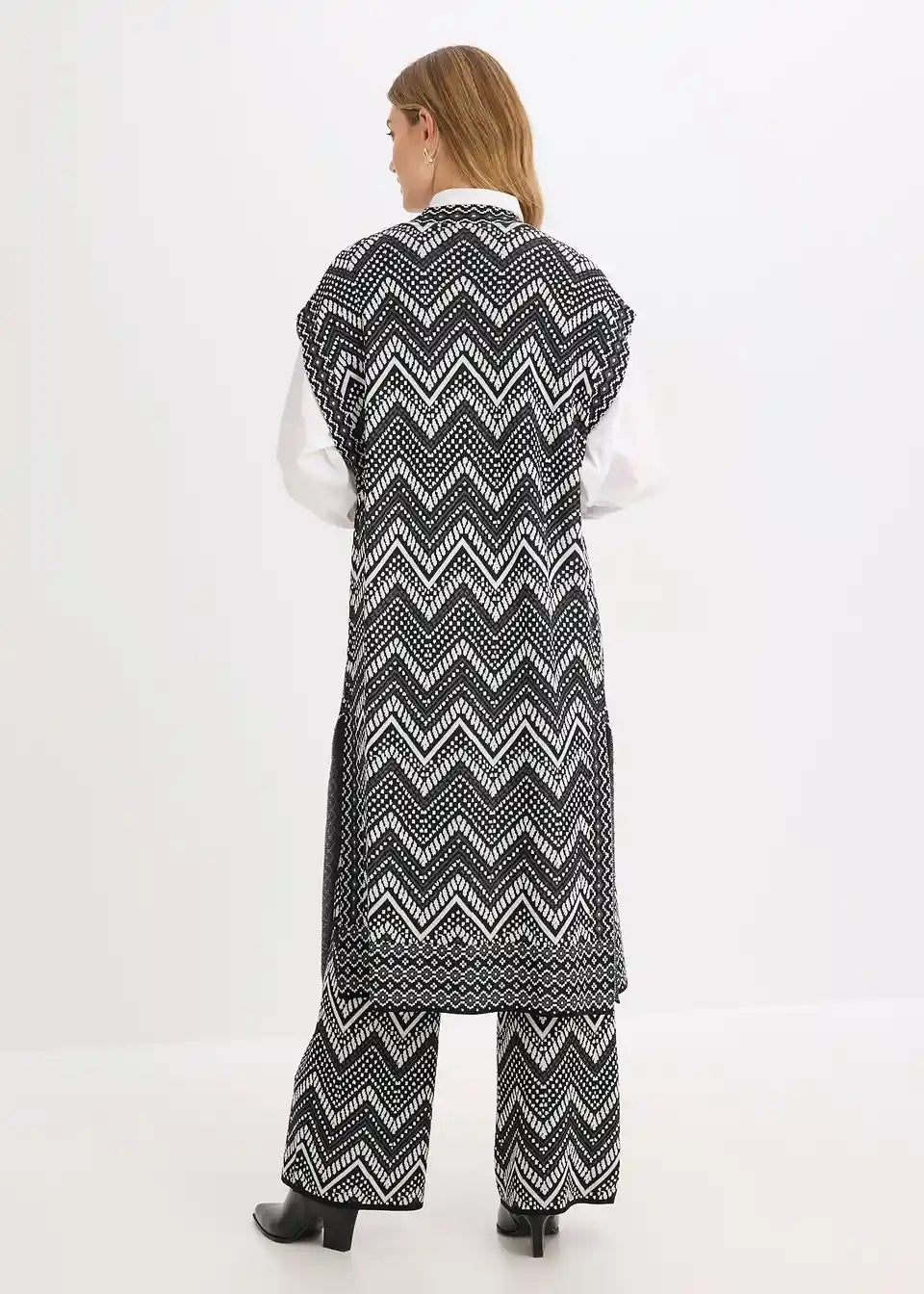 Modni telovnik iz žakarske pletenine s podaljšanimi ramami in stranskimi razporki
