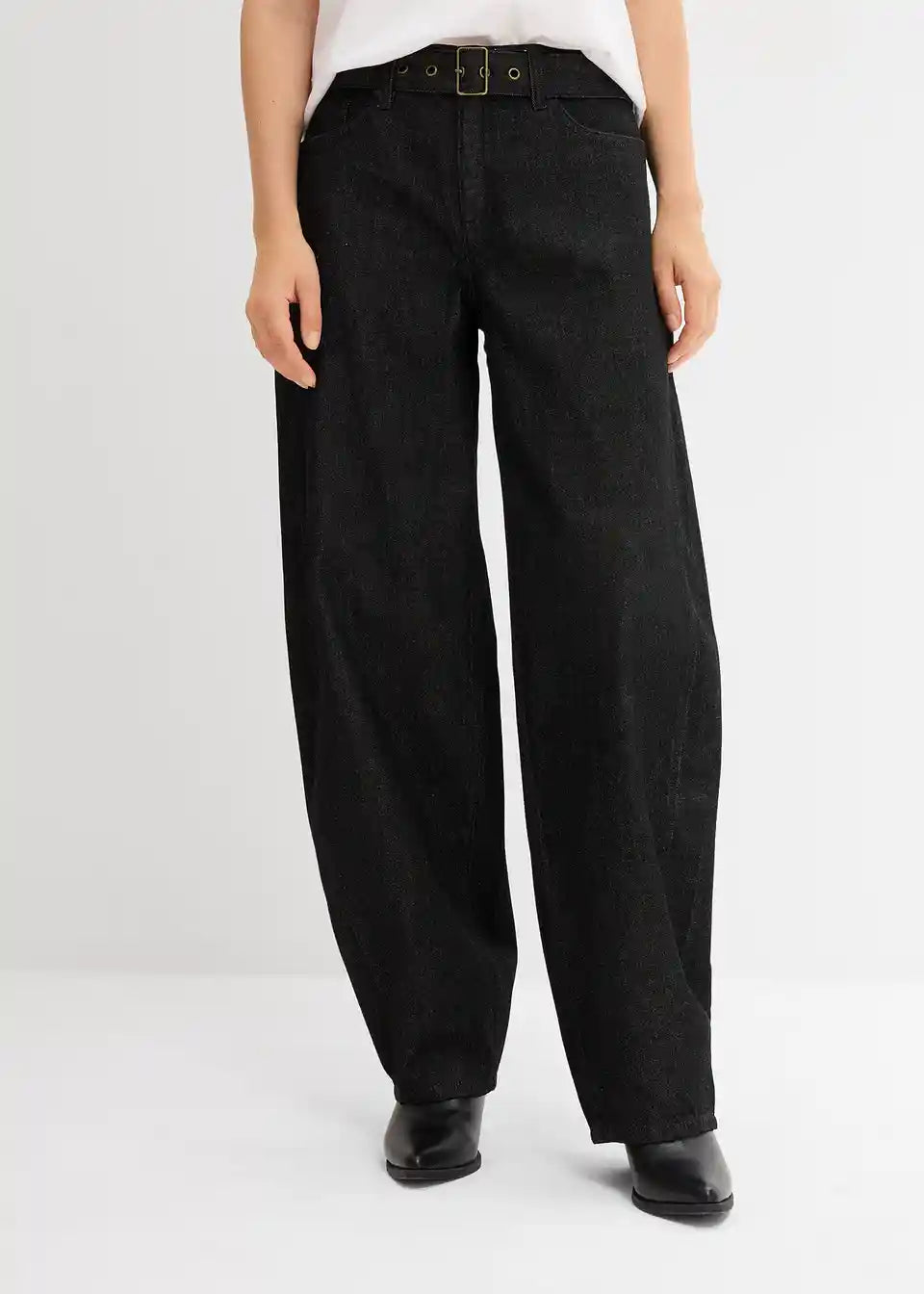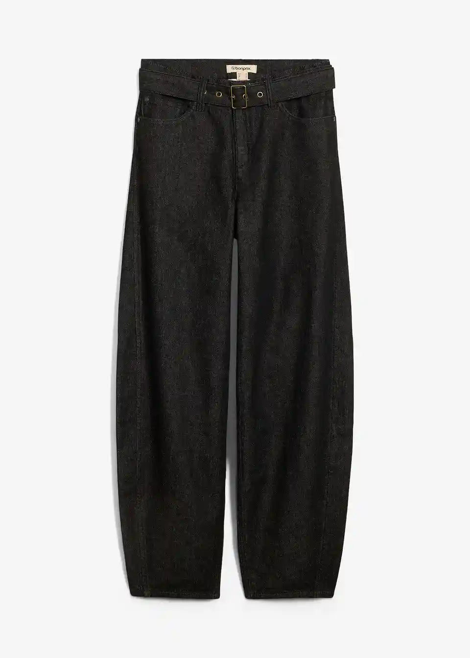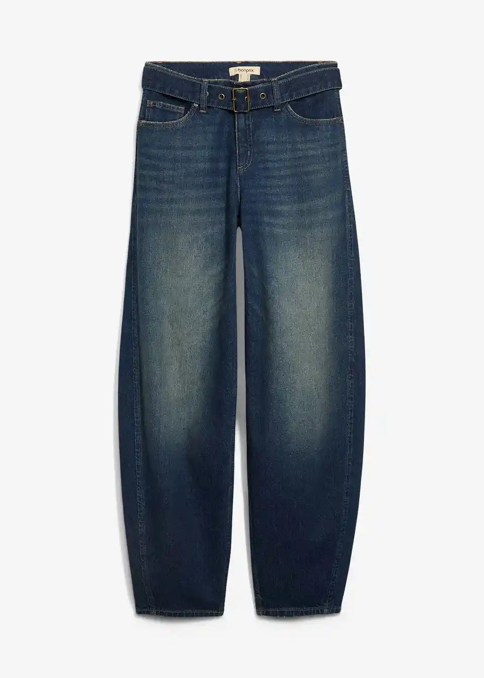 5-žepne kavbojke iz trpežnega bombažnega denima, ki je sprva nekoliko trd, z več nošenja pa postane mehkejši in bolj sproščen. Ohlapen kroj z voluminoznimi, zaobljenimi hlačnicami od boka do stegen in ožjim, zoženim krojem navzdol. Dolge hlače, ki na stopalu ustvarijo rahlo gubanje. Zaradi spranega videza imajo te kavbojke modni used učinek. Značilno za te kavbojke je rahlo puščanje barve med nošenjem in pranjem.