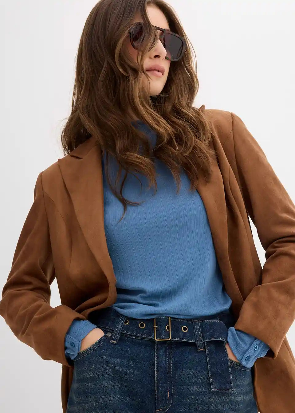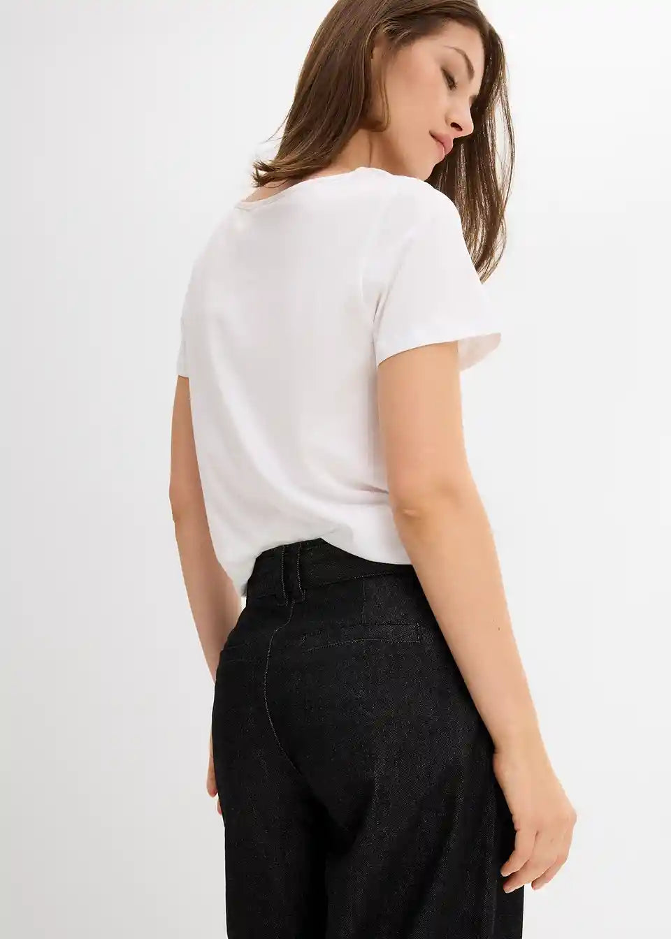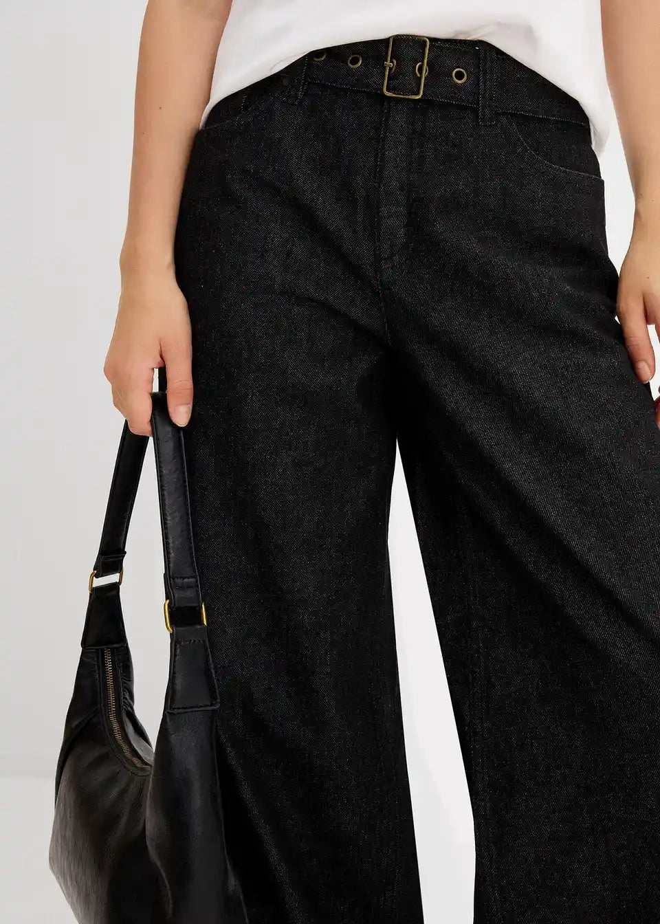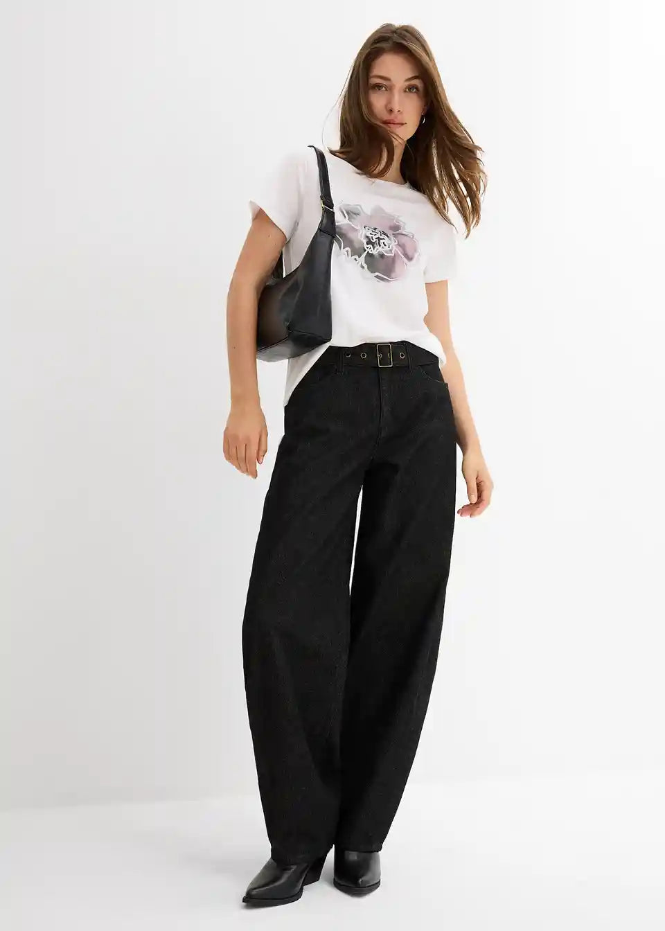 5-žepne kavbojke iz trpežnega bombažnega denima, ki je sprva nekoliko trd, z več nošenja pa postane mehkejši in bolj sproščen. Ohlapen kroj z voluminoznimi, zaobljenimi hlačnicami od boka do stegen in ožjim, zoženim krojem navzdol. Dolge hlače, ki na stopalu ustvarijo rahlo gubanje. Zaradi spranega videza imajo te kavbojke modni used učinek. Značilno za te kavbojke je rahlo puščanje barve med nošenjem in pranjem.