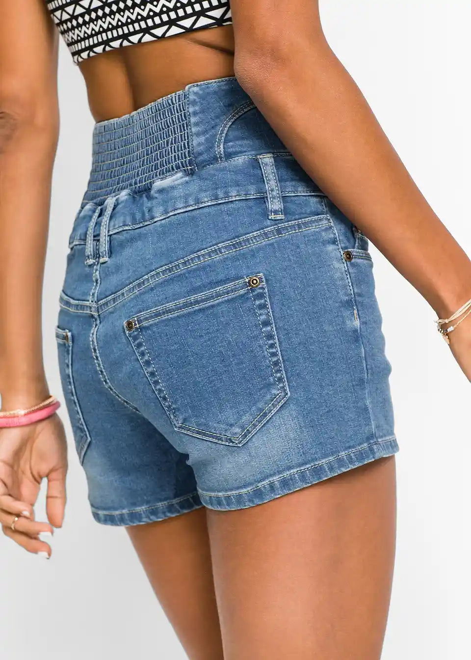 Vstavljen del okrašen s tremi gumbi spremeni osnovni izdelek v trendovski poudarek. Stranski šivi poudarjajo kul značaj modela. Zadnji dotik Highwaist-Jeans-Shorts dopolnjuje značilen 5-žepni videz s prešitim delom na zadnji strani. Bandeau-top in dolg jopič z mrežastim videzom dodatno izpostavljata Highwaist-Jeans-Shorts na moderen način. Za sproščen videz jih lahko kombinirate z Boxy-majico in supergami.