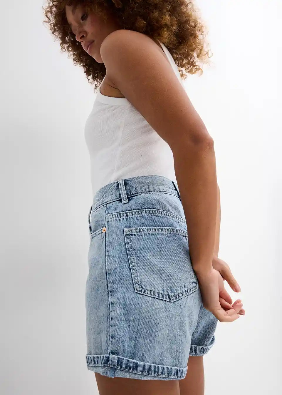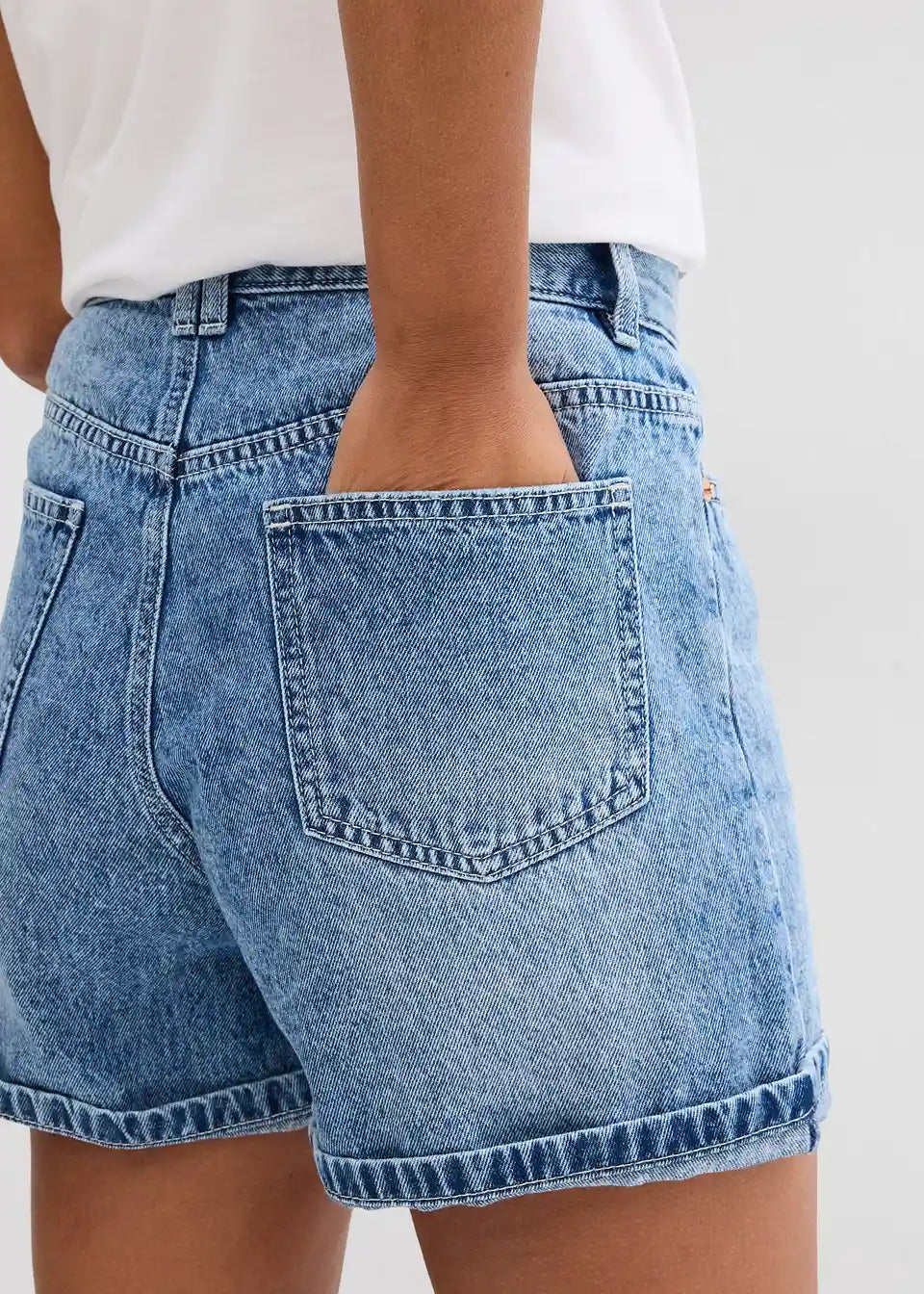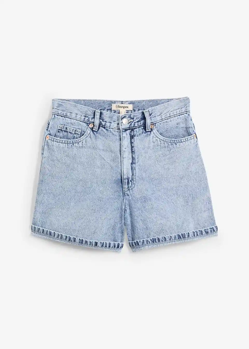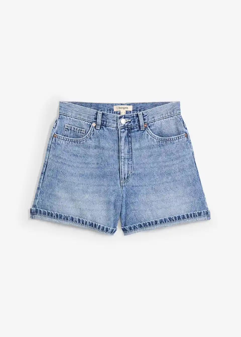 Ohlapne 5-žepne kratke hlače iz trdnega bombažnega denima, ki je sprva nekoliko tog, a postane z nošenjem mehkejši in bolj prožen. Visok pas z zadrgo in gumbom. Dvojno prepognjen rob. Dolžina notranjega dela hlačnic v št. 42 cca 11,5 cm, pralno v pralnem stroju.