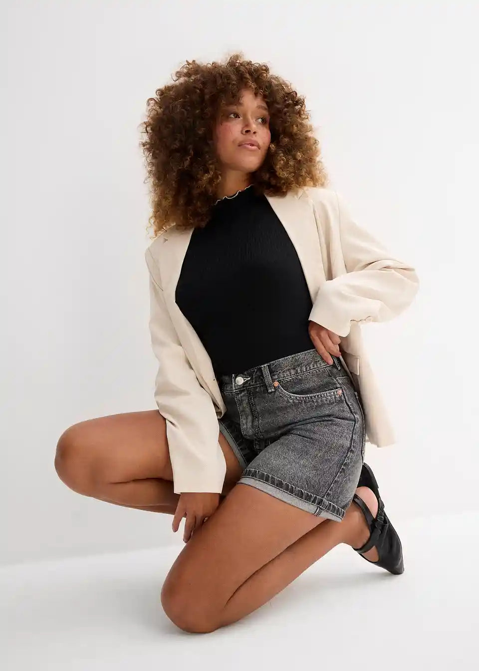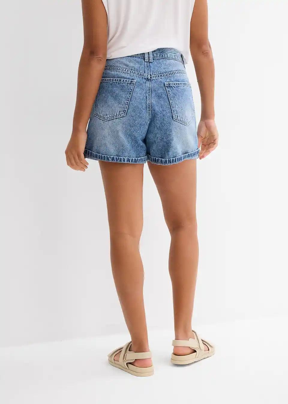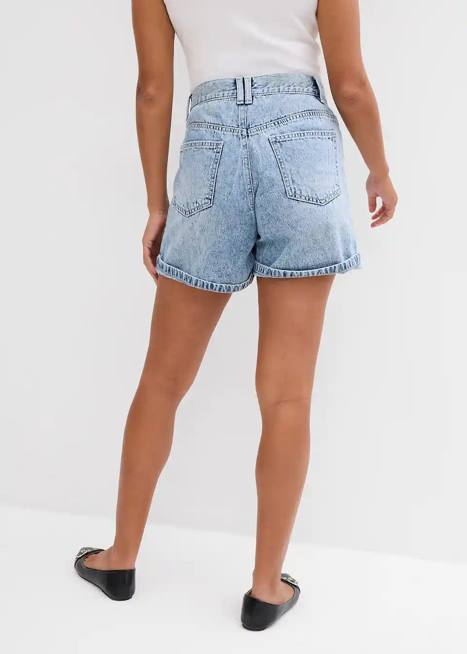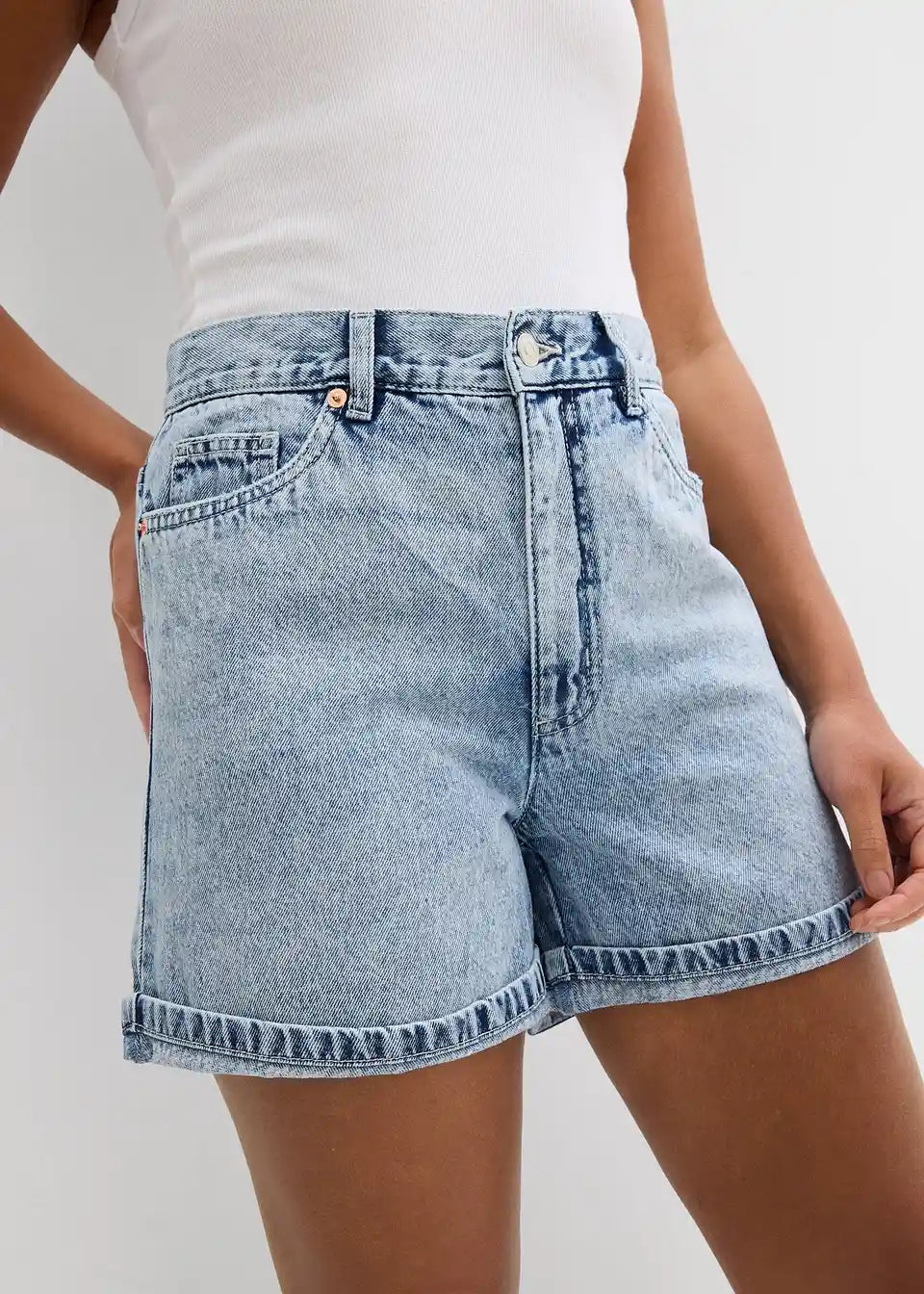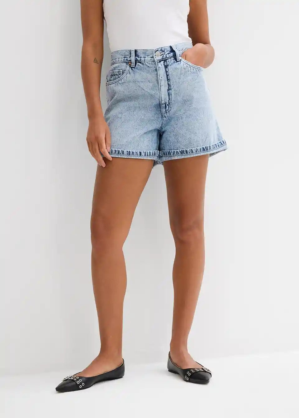 Ohlapne 5-žepne kratke hlače iz trdnega bombažnega denima, ki je sprva nekoliko tog, a postane z nošenjem mehkejši in bolj prožen. Visok pas z zadrgo in gumbom. Dvojno prepognjen rob. Dolžina notranjega dela hlačnic v št. 42 cca 11,5 cm, pralno v pralnem stroju.