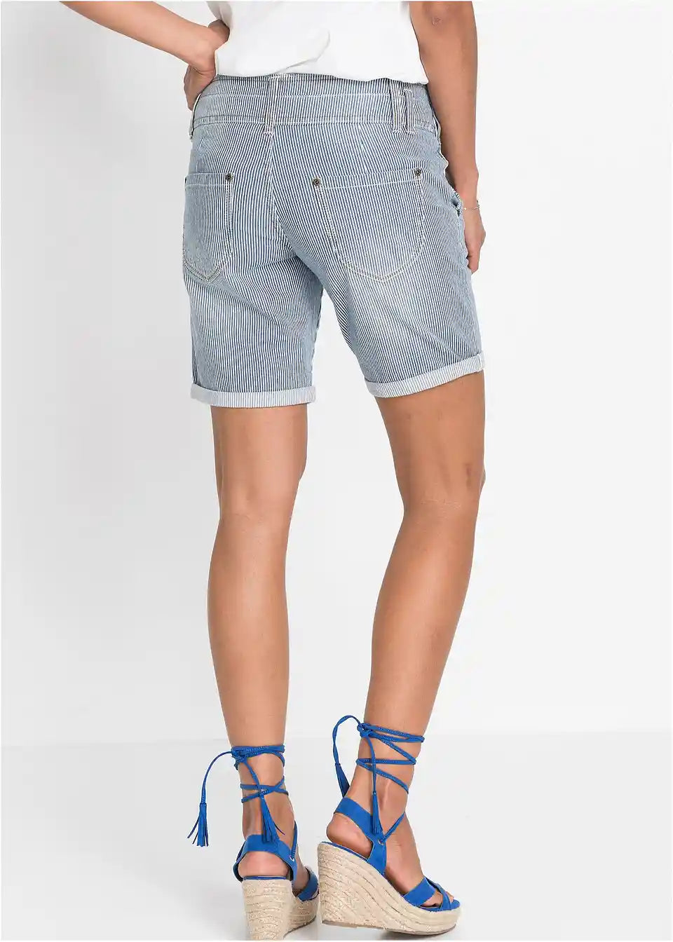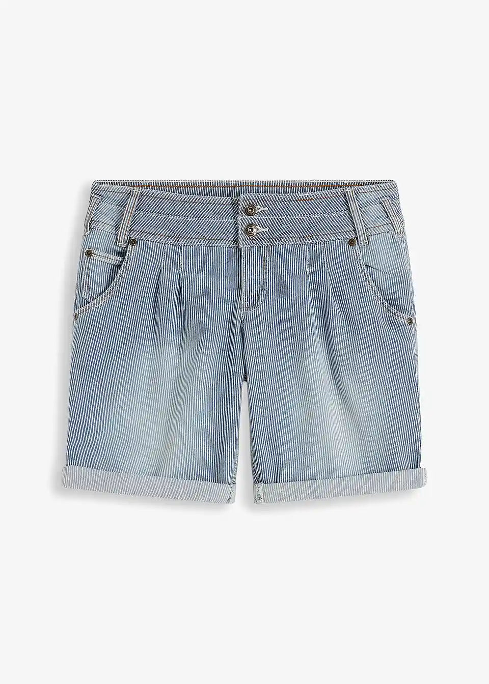 Visok pas z dvojnim zapenjanjem gumbov je v središču pozornosti pri teh jeansshortsih. Naguban pas spodaj daje poseben poudarek. Poševni vstavljeni žepi v chinos videzu in privihan rob dopolnjujejo trendovski model z efekti obrabe. Za nezahteven slog poskrbita rebrast vrh in natikači. Romantična bluza z rožnim potiskom in balerinke jeansshortse trendovsko dopolnjujejo.
