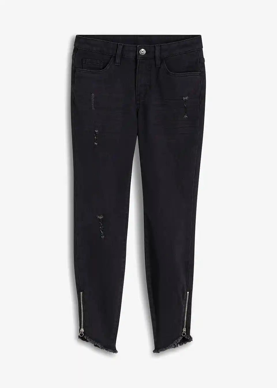 Moderne kavbojke znamke BODYFLIRT. Kavbojke z asimetričnim robom so dodatno okrašene z zadrgo. Notranja dolžina hlačnice pri št. 38 je približno 71,5 cm.