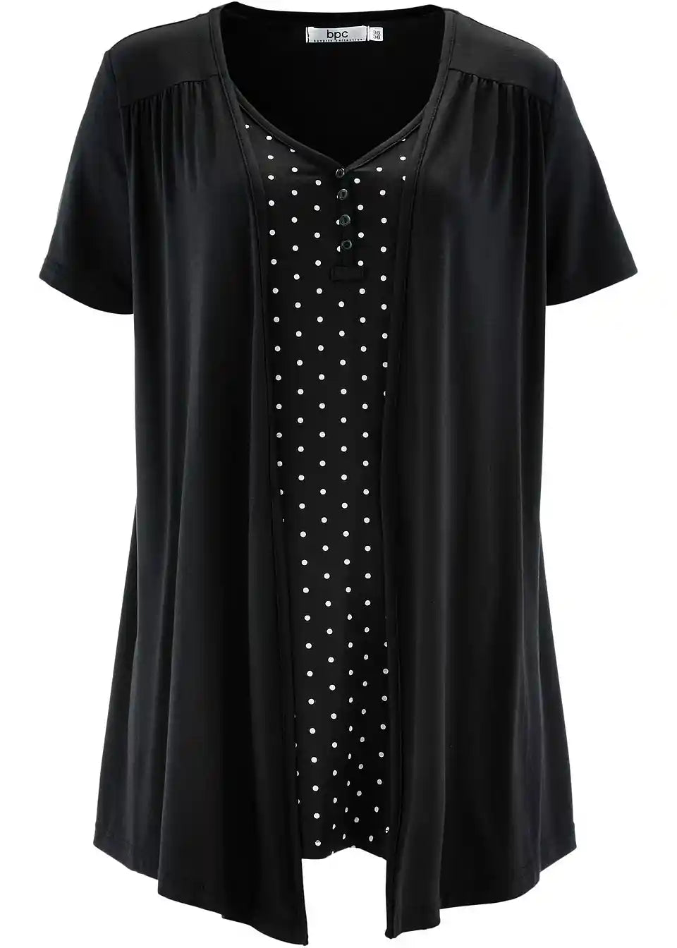 Figurno ohlapna dvodelna majica znamke bpc navdušuje z mnogimi modnimi detajli. Na videz deluje kot majica z jopico. V resnici ima samo hrbtni del, sprednji del pa je dvojno obdelan. Spodnja majica je ožje krojena in ima lep pikčast vzorec. Pri izrezu ima dekorativni okrasni zapenjalni trak. Zgornja majica prosto pada v majhnih gubah preko tega in ima modno daljše robove. Majica omogoča številne kombinacije. Spodnjo majico lahko nosite zataknjeno za pas ali pa oba dela prosto padejo preko ozkih pajkic.