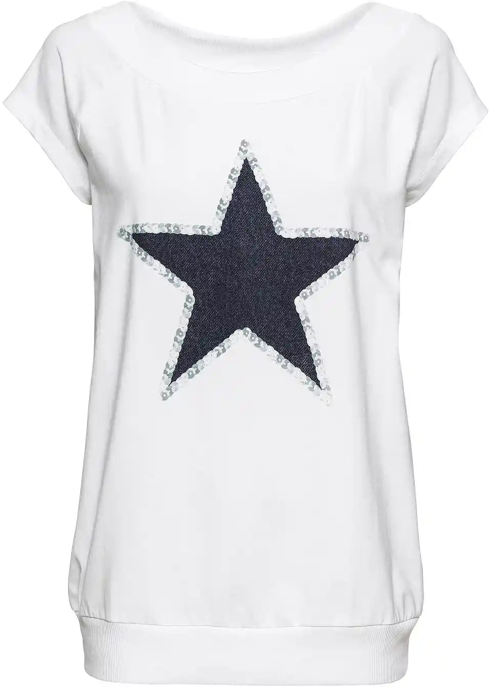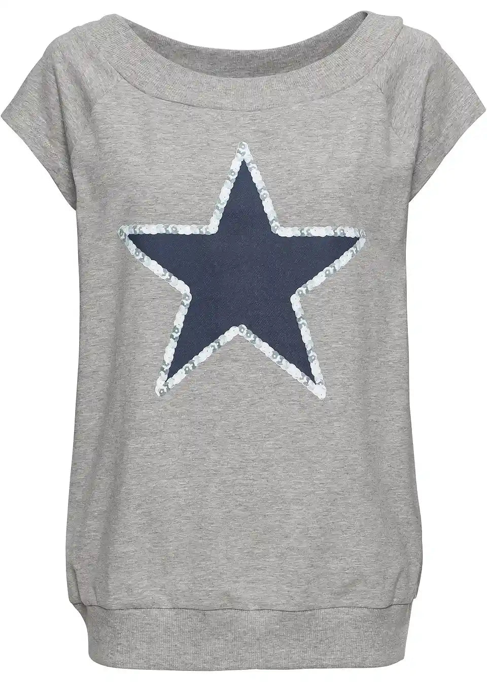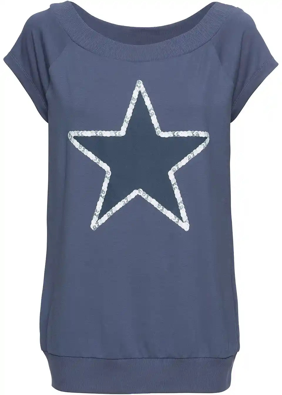 Ta majica, ki je navdih črpala iz dizajna puloverjev, poskrbi za kul videz. Širok izrez v obliki čolna z rebrasto teksturo se odlično ujema s kratkimi raglan rokavi. Elastičen raven rob je prav tako rebrast. Majica s potiskom zvezd se odlično ujema z oprijetimi kavbojkami ali pajkicami. Prav tako je odlična izbira z kratkimi hlačami ali mini krili.