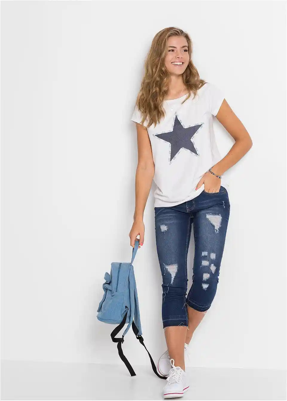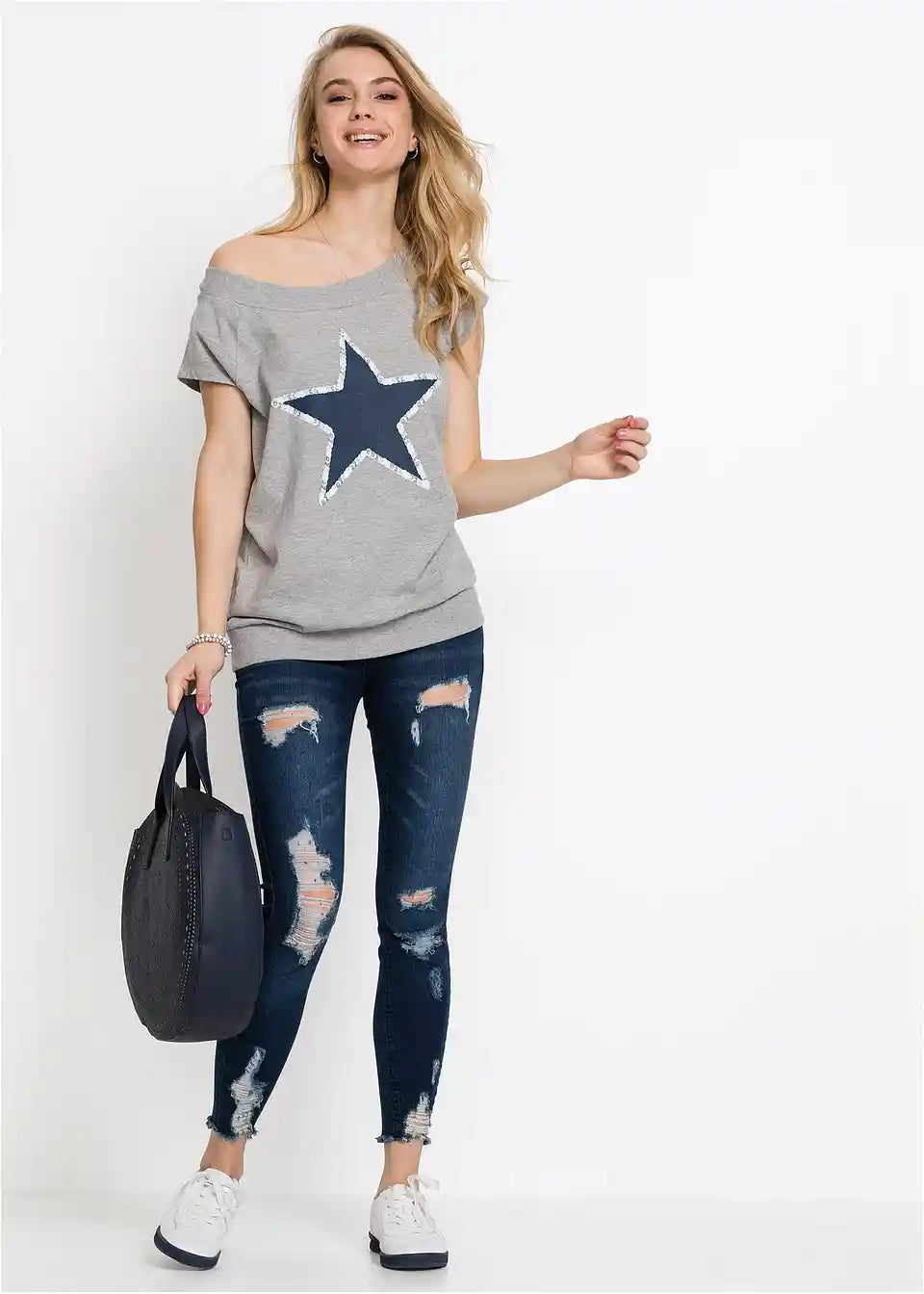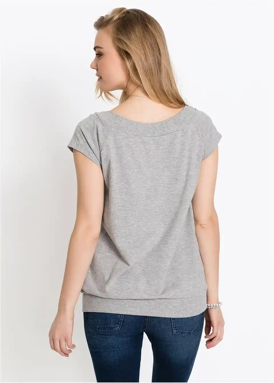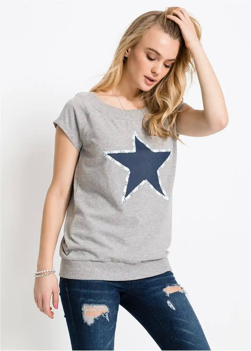 Ta majica, ki je navdih črpala iz dizajna puloverjev, poskrbi za kul videz. Širok izrez v obliki čolna z rebrasto teksturo se odlično ujema s kratkimi raglan rokavi. Elastičen raven rob je prav tako rebrast. Majica s potiskom zvezd se odlično ujema z oprijetimi kavbojkami ali pajkicami. Prav tako je odlična izbira z kratkimi hlačami ali mini krili.