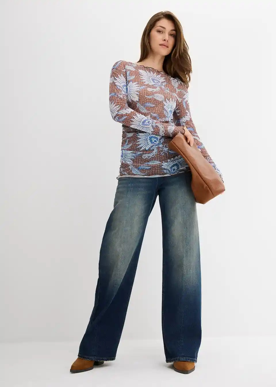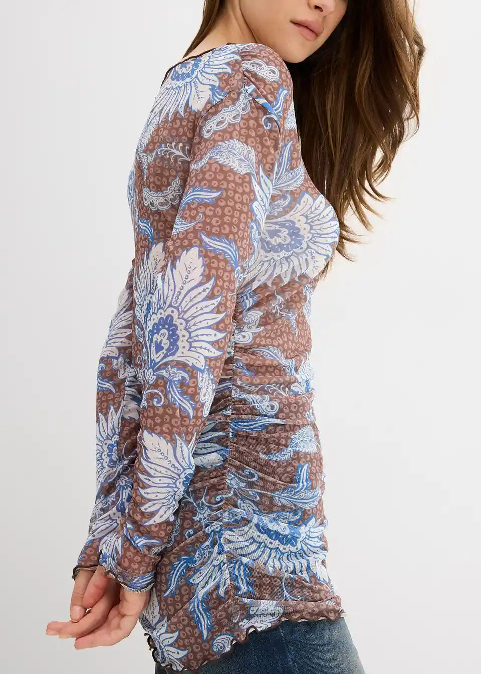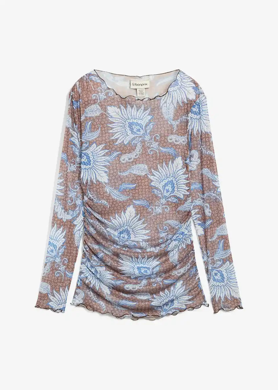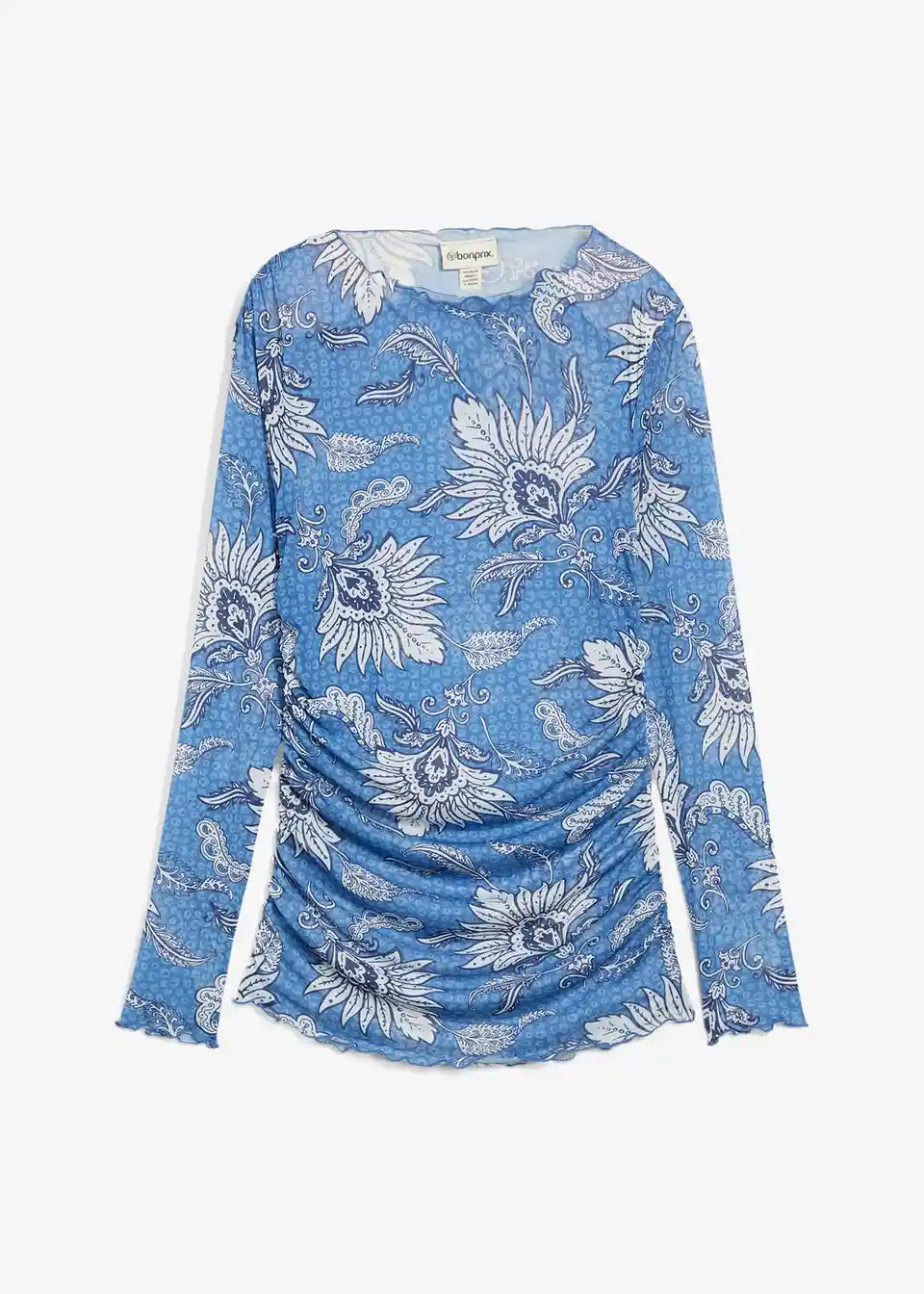 Tiskana majica z dolgimi rokavi iz fine mrežice s gubami