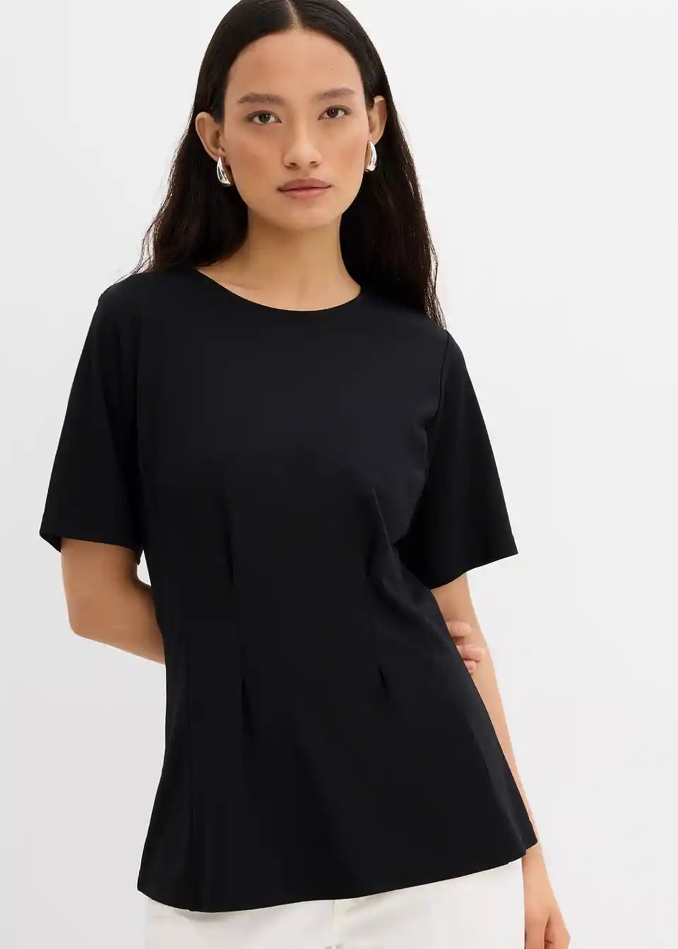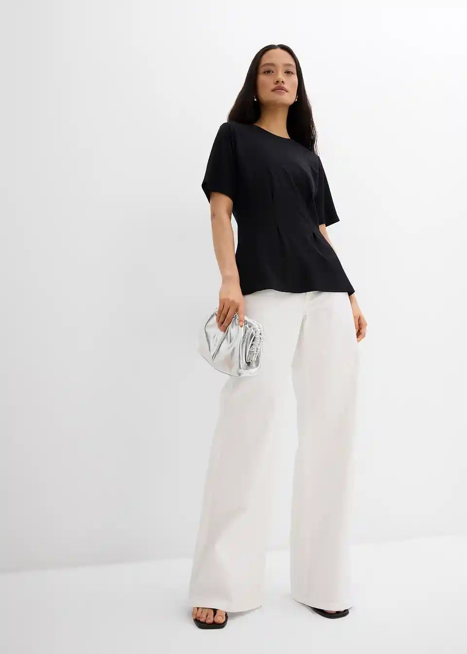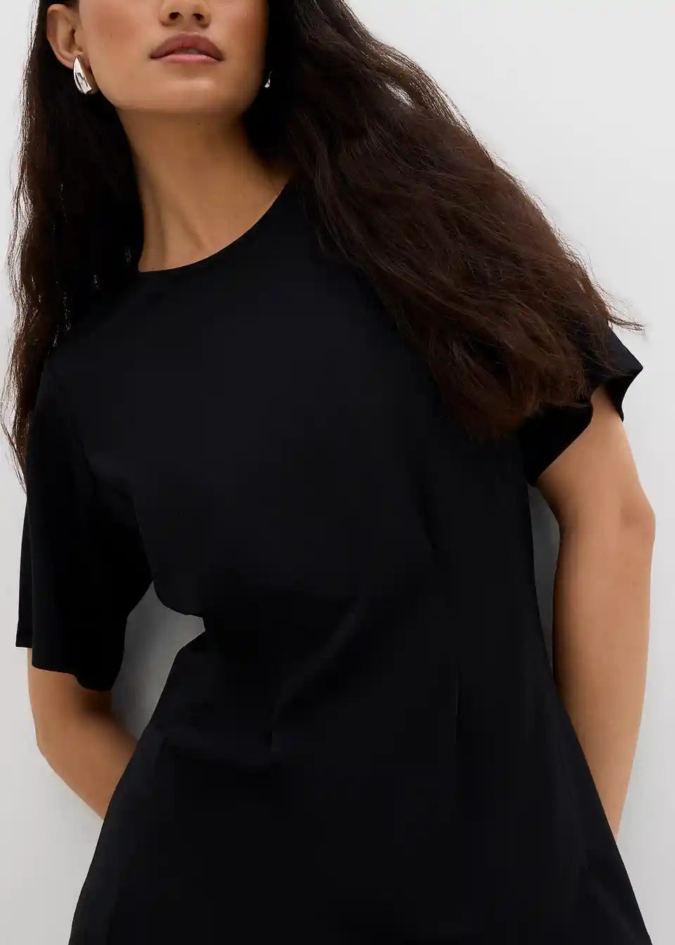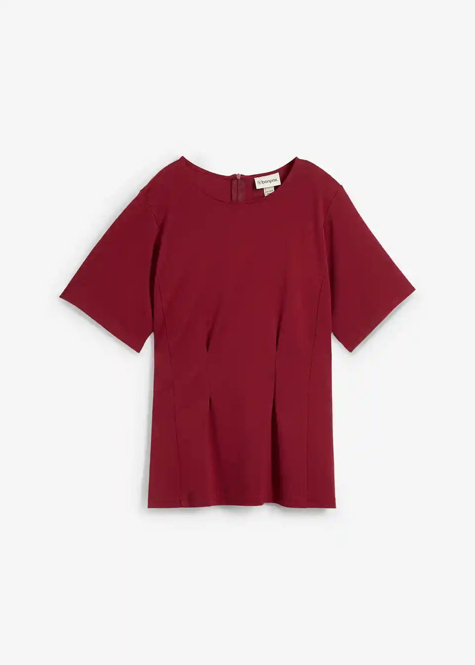 Oprijeta majica s peplum zaključkom na robu in skritim zadrgo na hrbtni strani.
