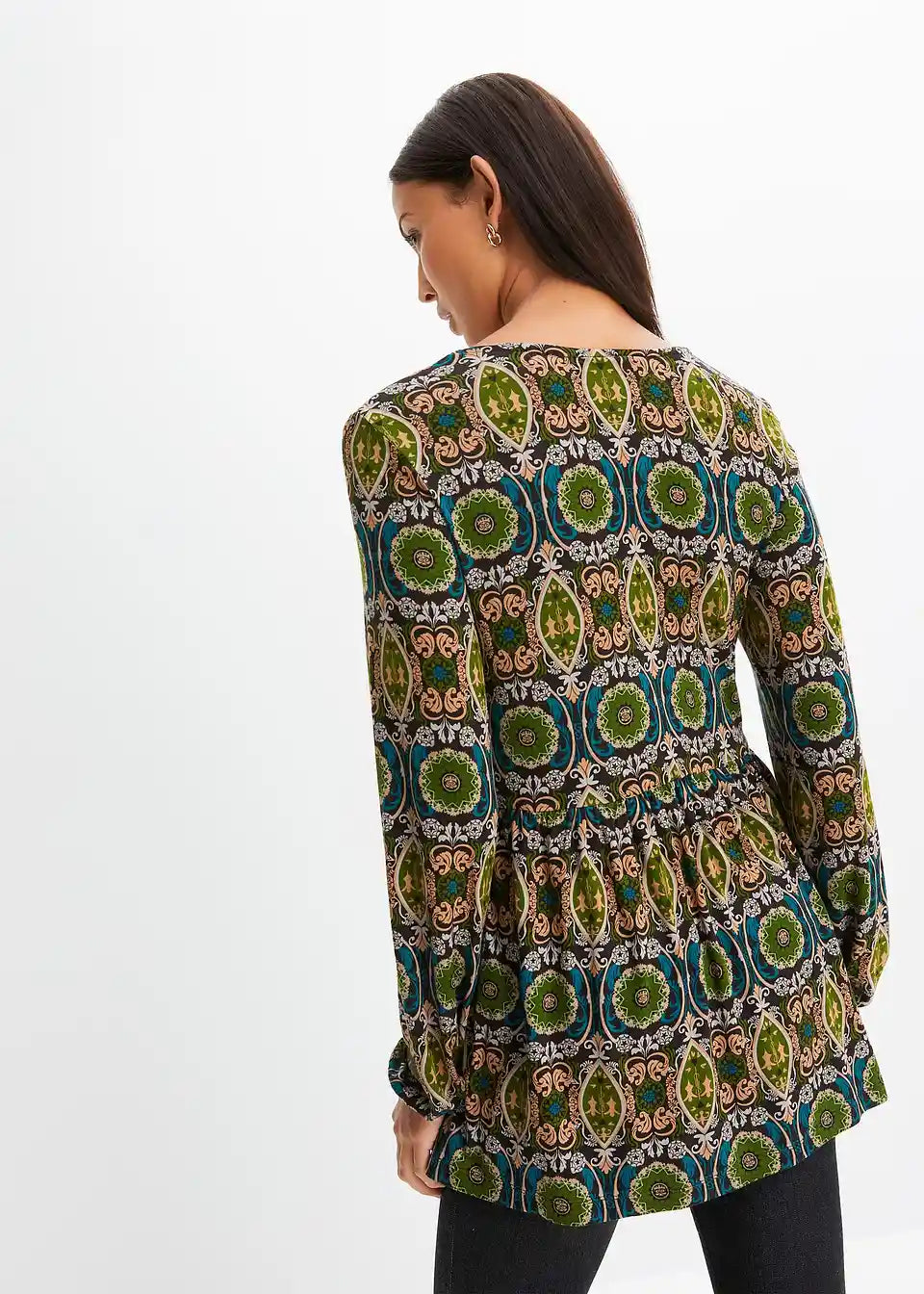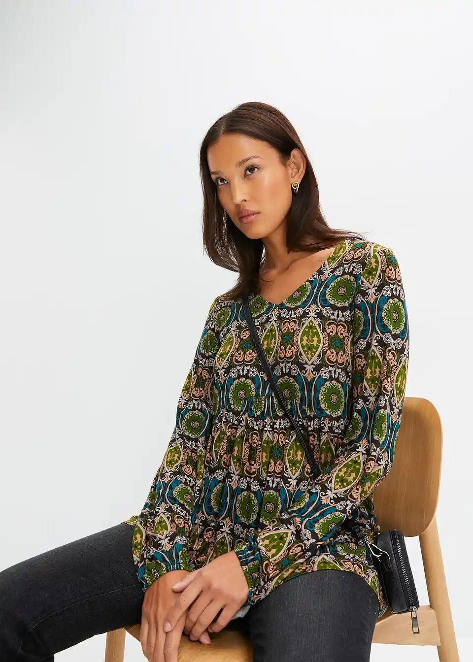 Ohlapna srajčna bluza z V-izrezom in jesenskim potiskom