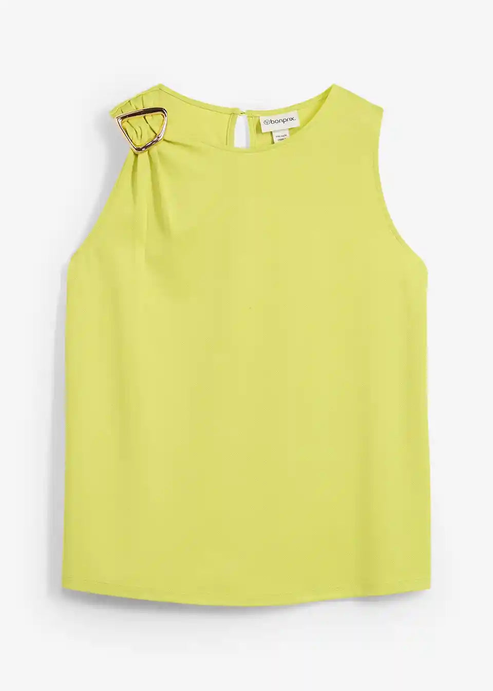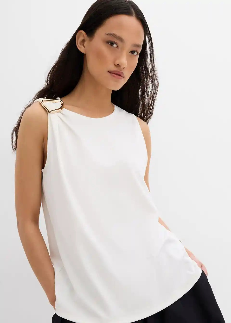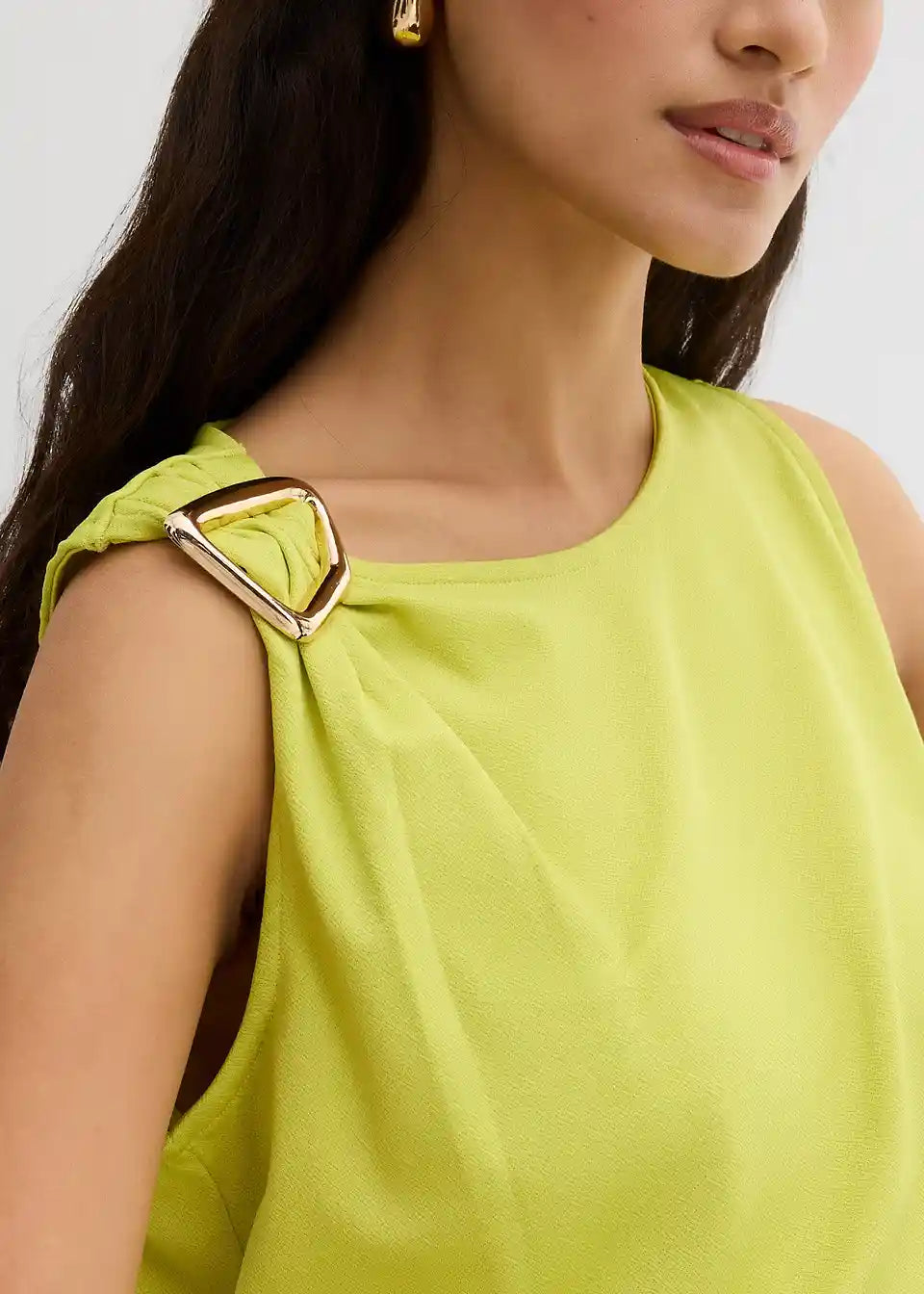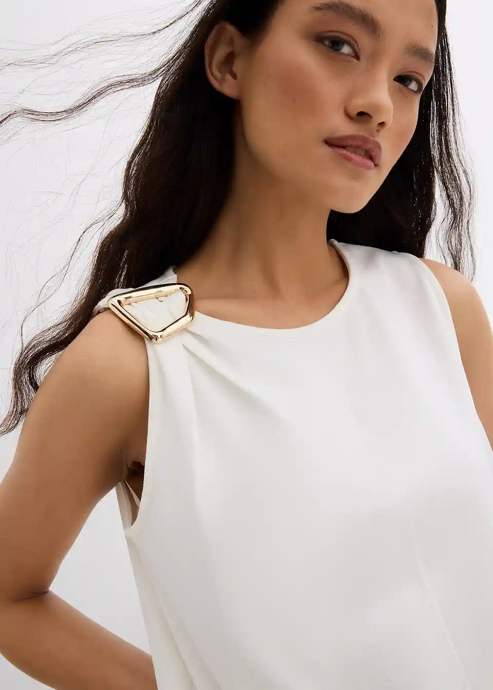 Ležeren top brez ramen z drapiranim materialom ter kovinsko zaponko na rami