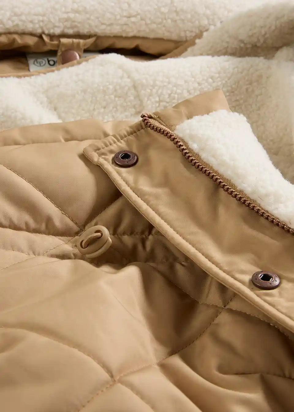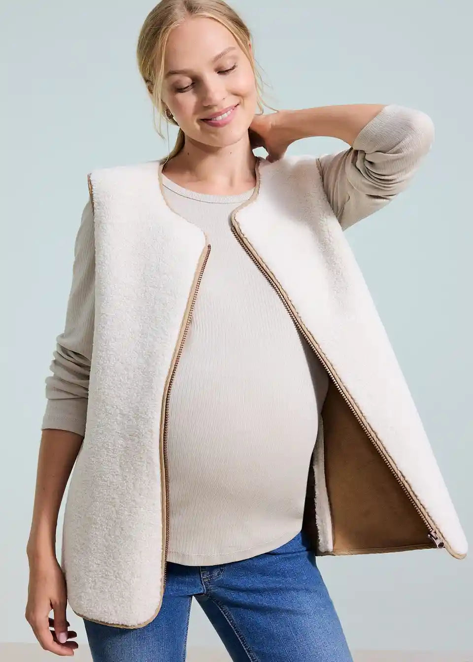 Lahko podložena nosečniška jakna z različnimi možnostmi nošenja. Ima dva vložka: razširitveni vložek za trebuh med nosečnostjo in nosilni vložek za dojenčka. Jakno je mogoče nositi z ali brez plišastega telopvnika, zato je popolna tako za prehodno obdobje kot za zimo. Telovnik lahko nosite tudi ločeno kot samostojen kos oblačila. Jakna ima mehek ovratnik iz pliša, veliko kapuco in našite sprednje žepe.