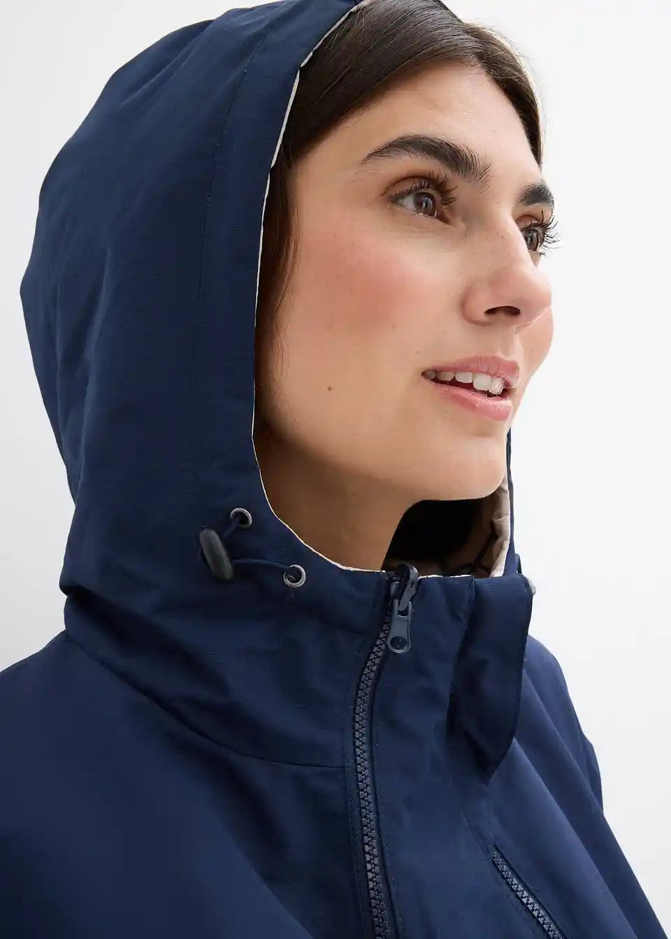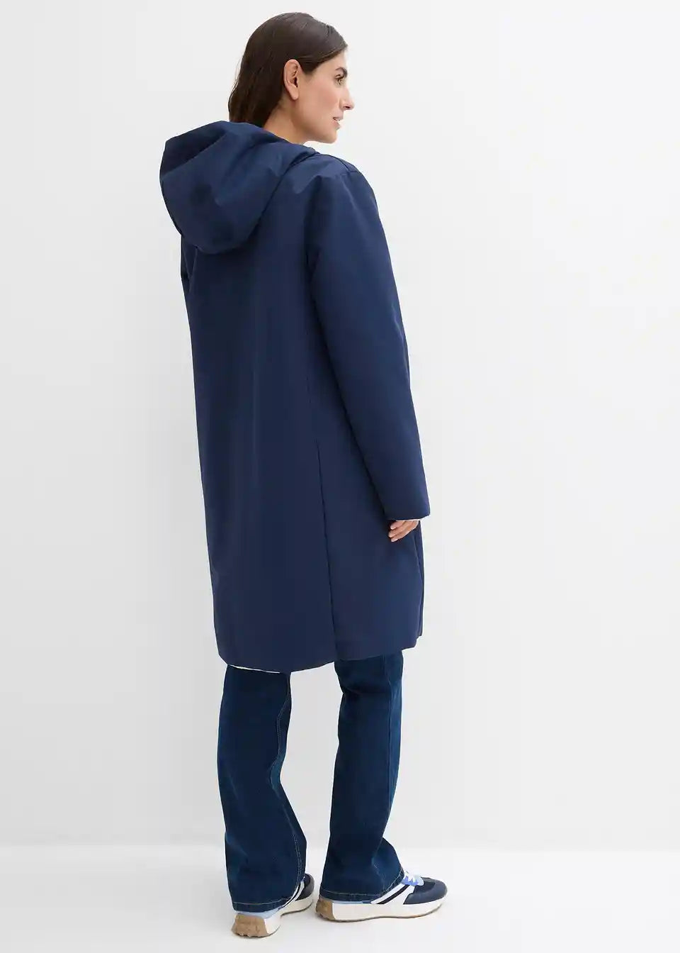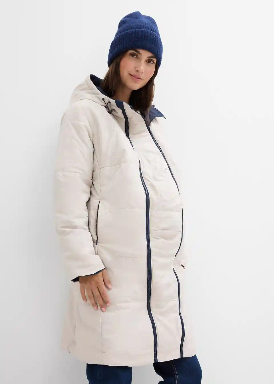 Ta vsestranski obojestranski plašč je popoln za nosečnost in obdobje po njej. Ena stran je iz vetro- in vodoodbojnega materiala, druga stran je prešita in rahlo podložena za prijetno toplino in prilagodljivost v vsakdanjem življenju. Plašč ima dva vložka: razširitveni vložek za nosečnost in vložek za nošenje dojenčka. Vložek za nošenje je oblikovan tako, da prijetno greje materin vrat, ima skrite pritiskače ter kapuco za dojenčka z nastavljivo vrvico. Velika kapuca za mamo nudi zanesljivo zaščito pred vetrom in vremenom. Obe strani imata praktična žepa z zadrgo.