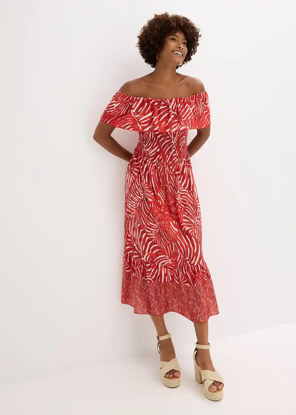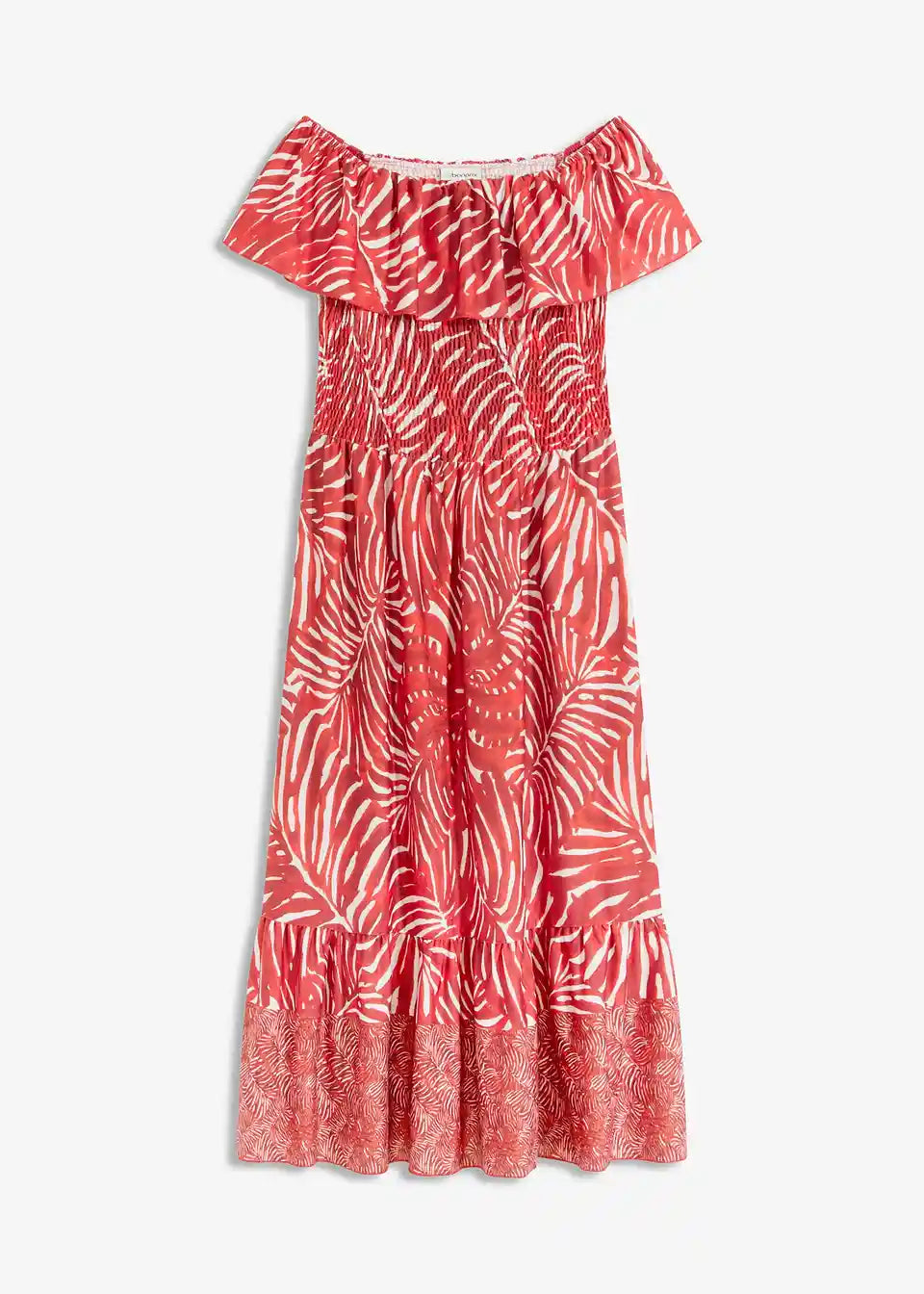 modno potiskana jerseyeva Carmen obleka s smock detajlom na zgornjem delu in z volančkom na izrezu ter robu