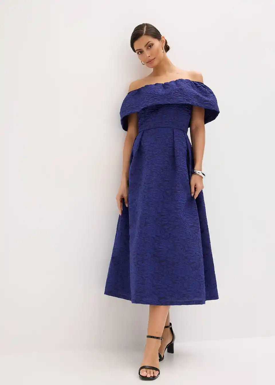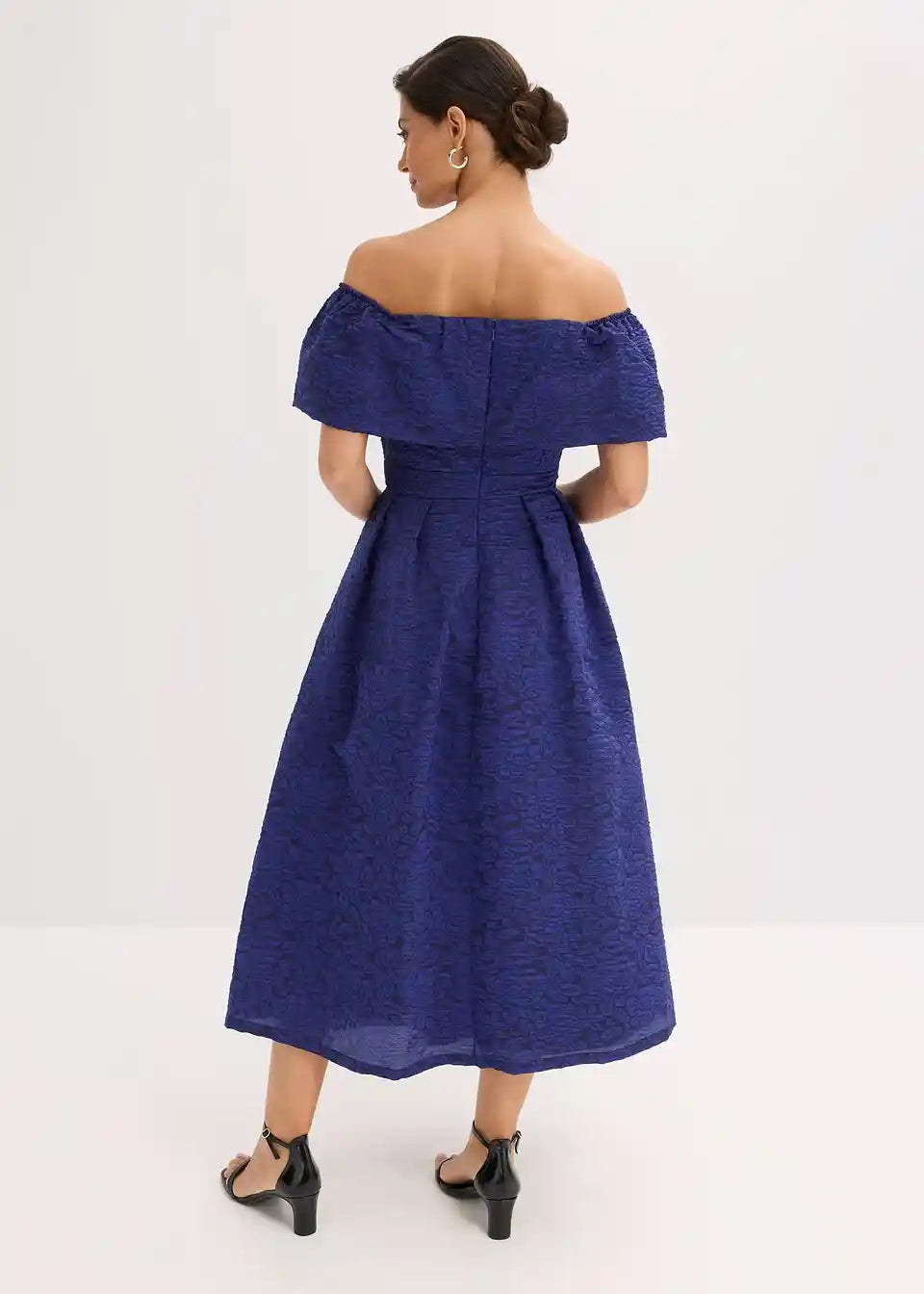Moderna in ženstvena: Carmen obleka srednje dolžine iz bleščečega žakarda