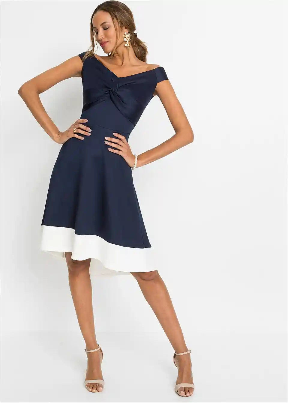 Obleka s carmen izrezom z detajlom vozla