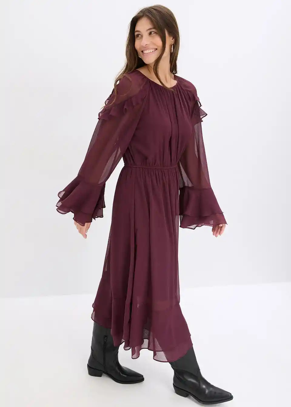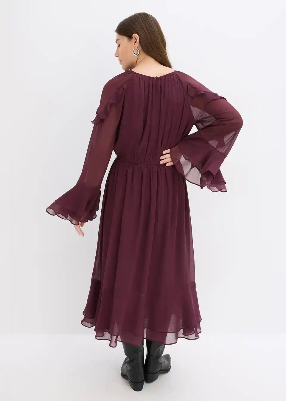 Moderna obleka iz šifona v midi dolžini z volani na rokavih in na robu krila