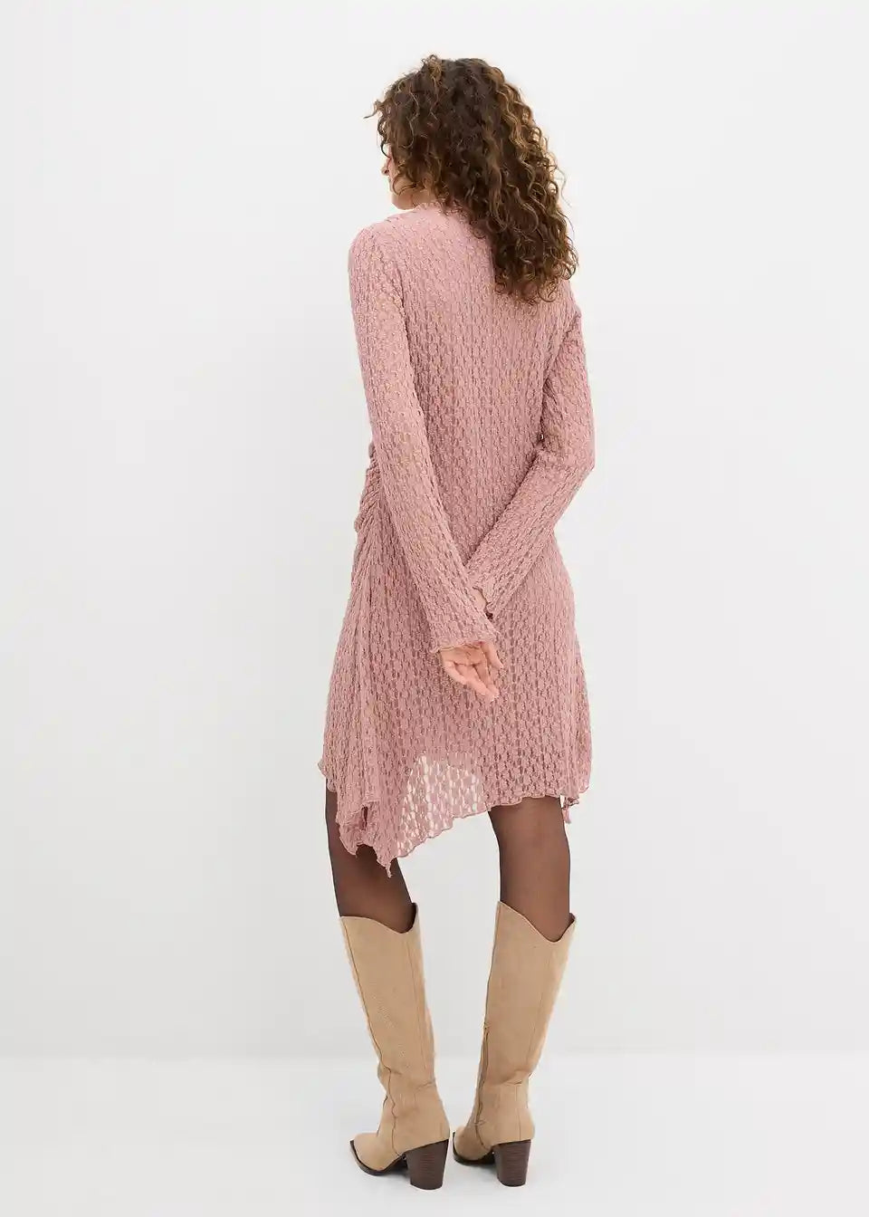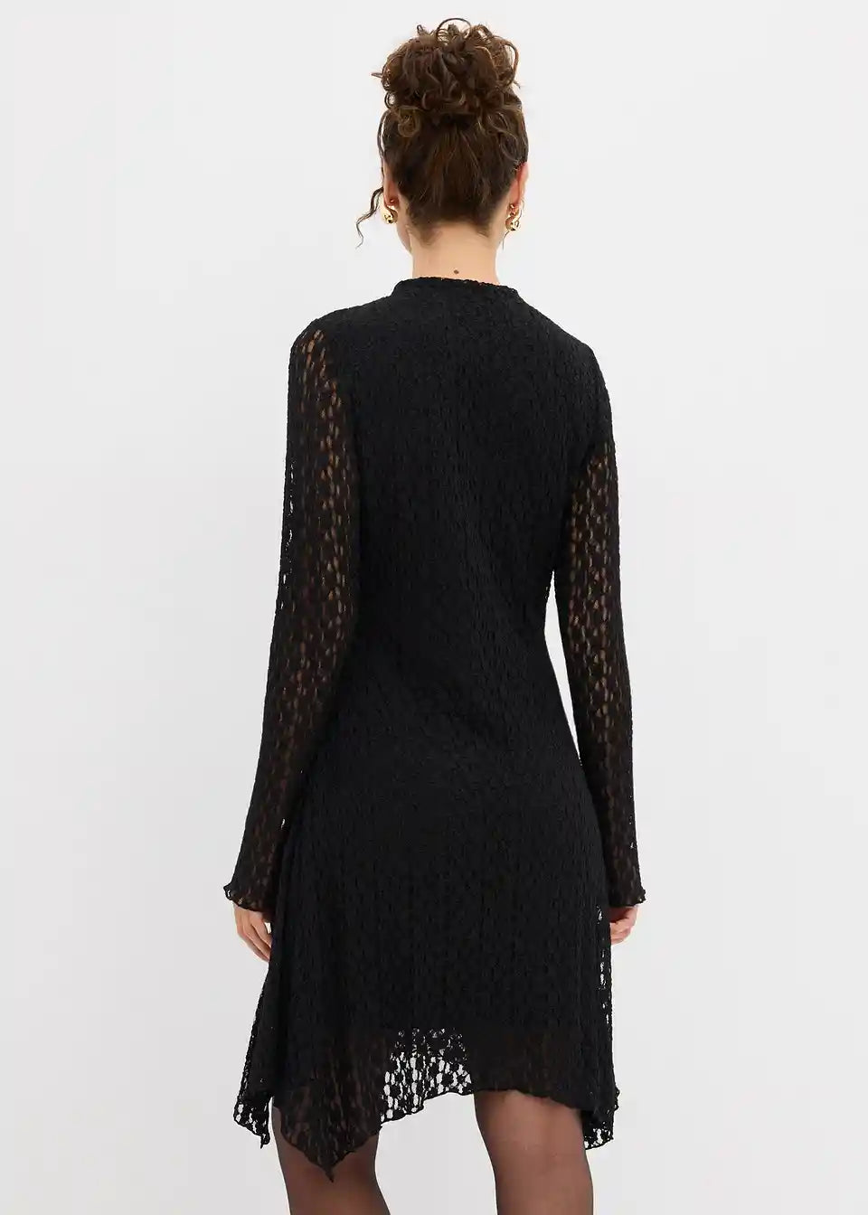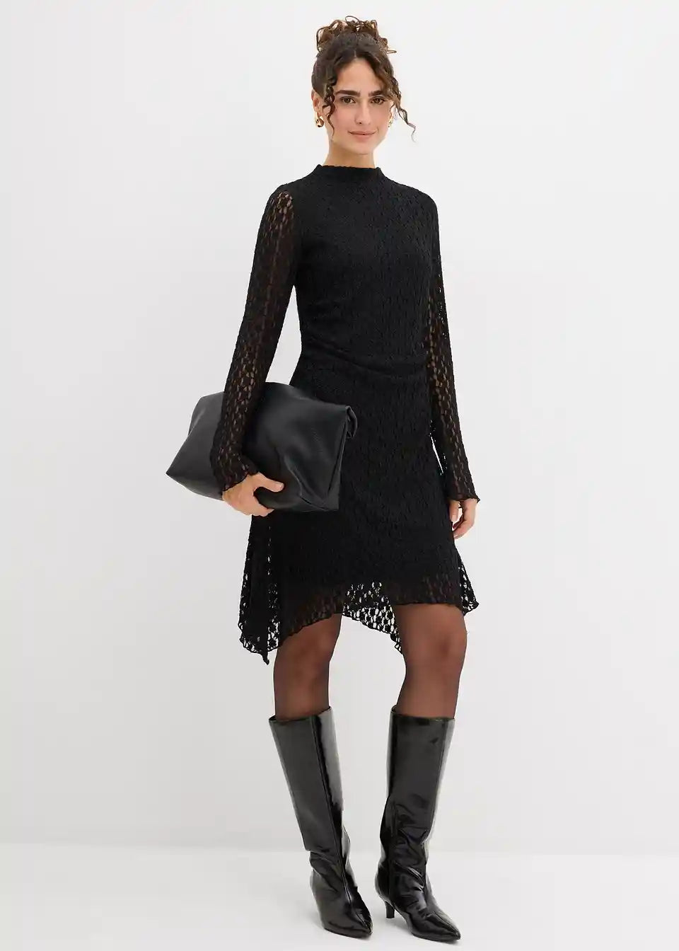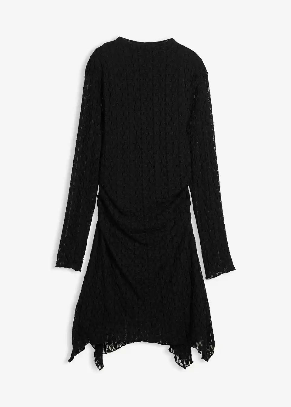 Oprijeta obleka s čipko, koničastim robom in stranskimi naborki