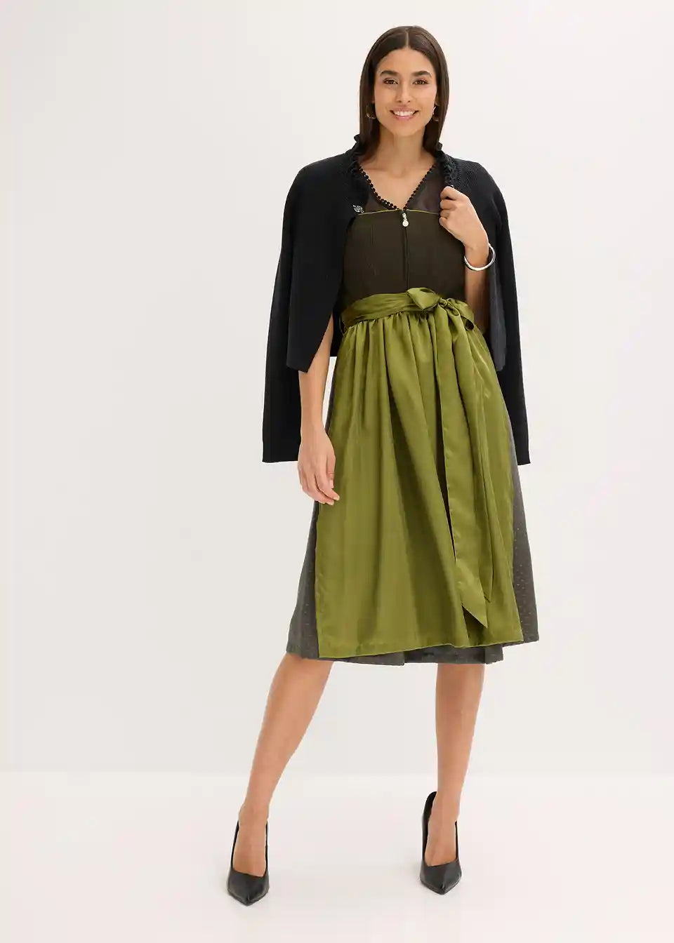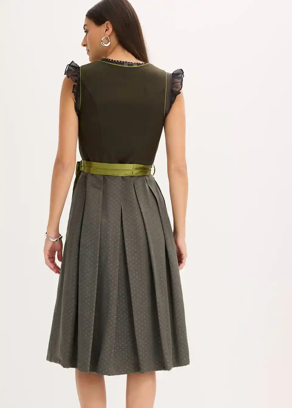 Moderen in ženstven: Dirndl z korzetom iz lanene mešanice in jacquard krilom ter predpasnikom iz sijočega satena.