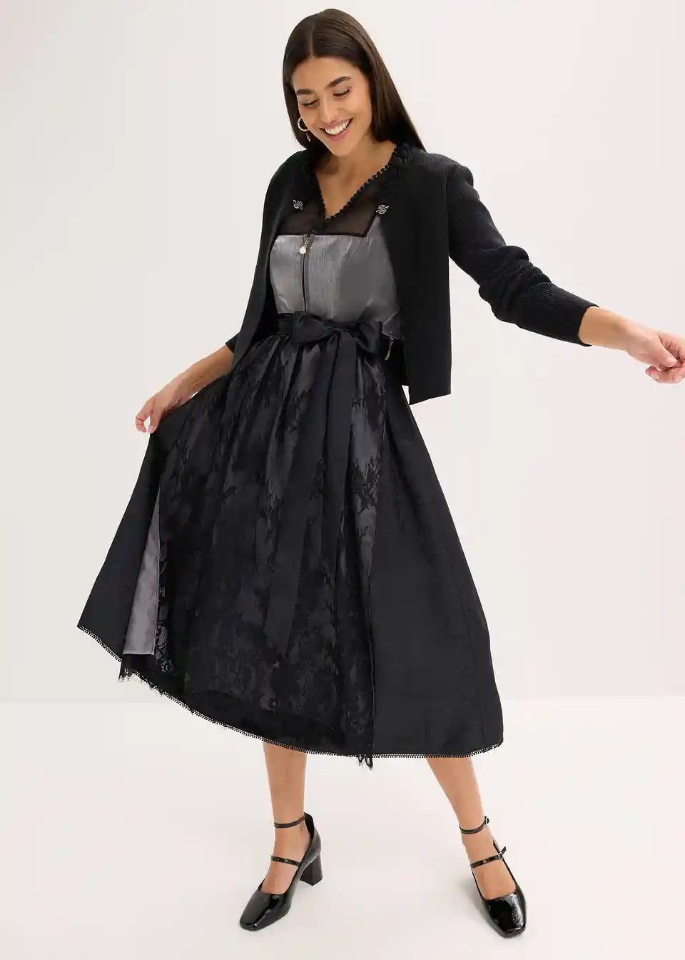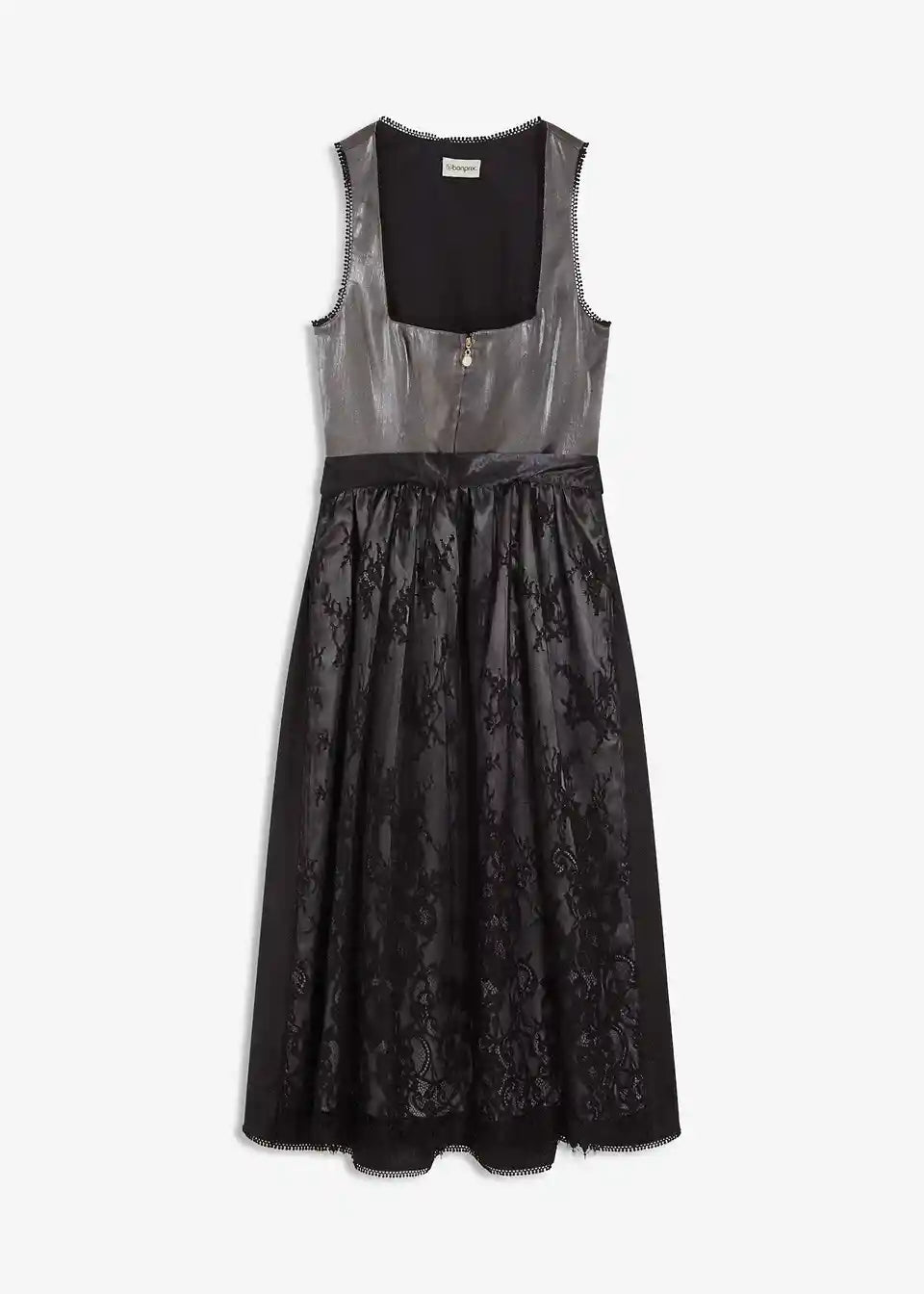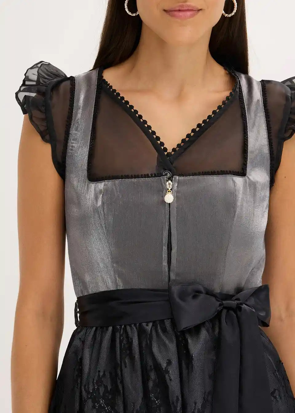 Moderen Dirndl z bleščečim korzetom in spreminjajočo se predpasnikom z čipko.
