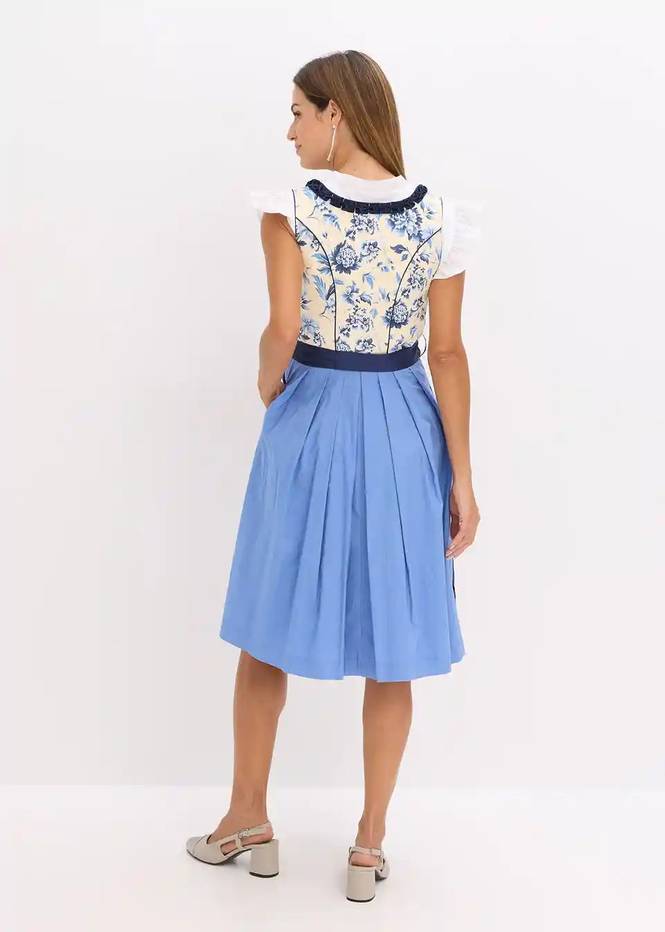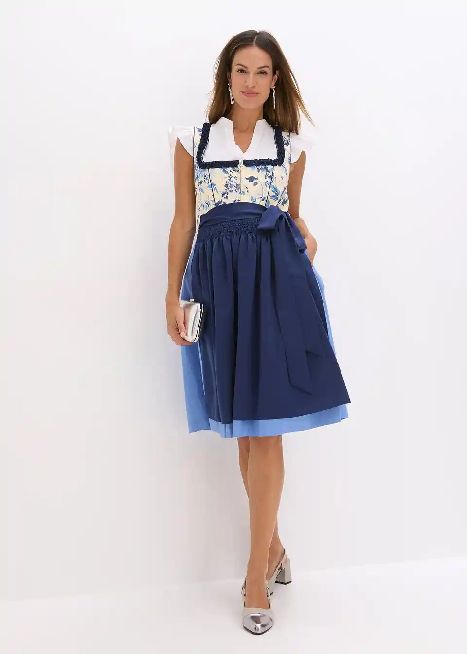 Moderno in ženstveno: Dirndl z obrobo in predpasnikom iz sijočega satena, z allover potiskom, zaradi katerega je vsak kos unikaten