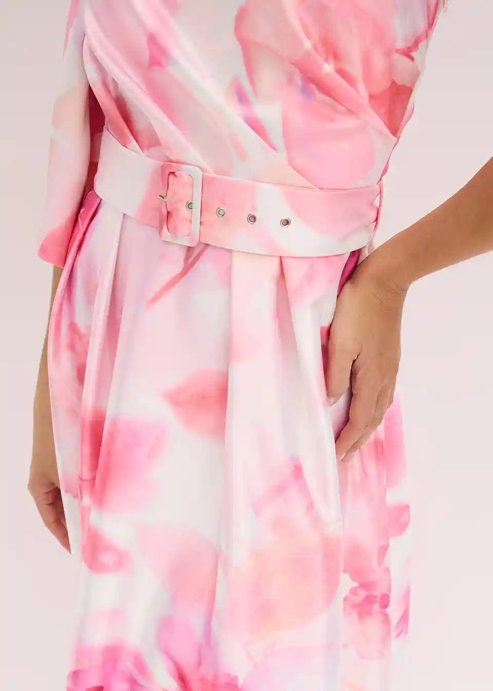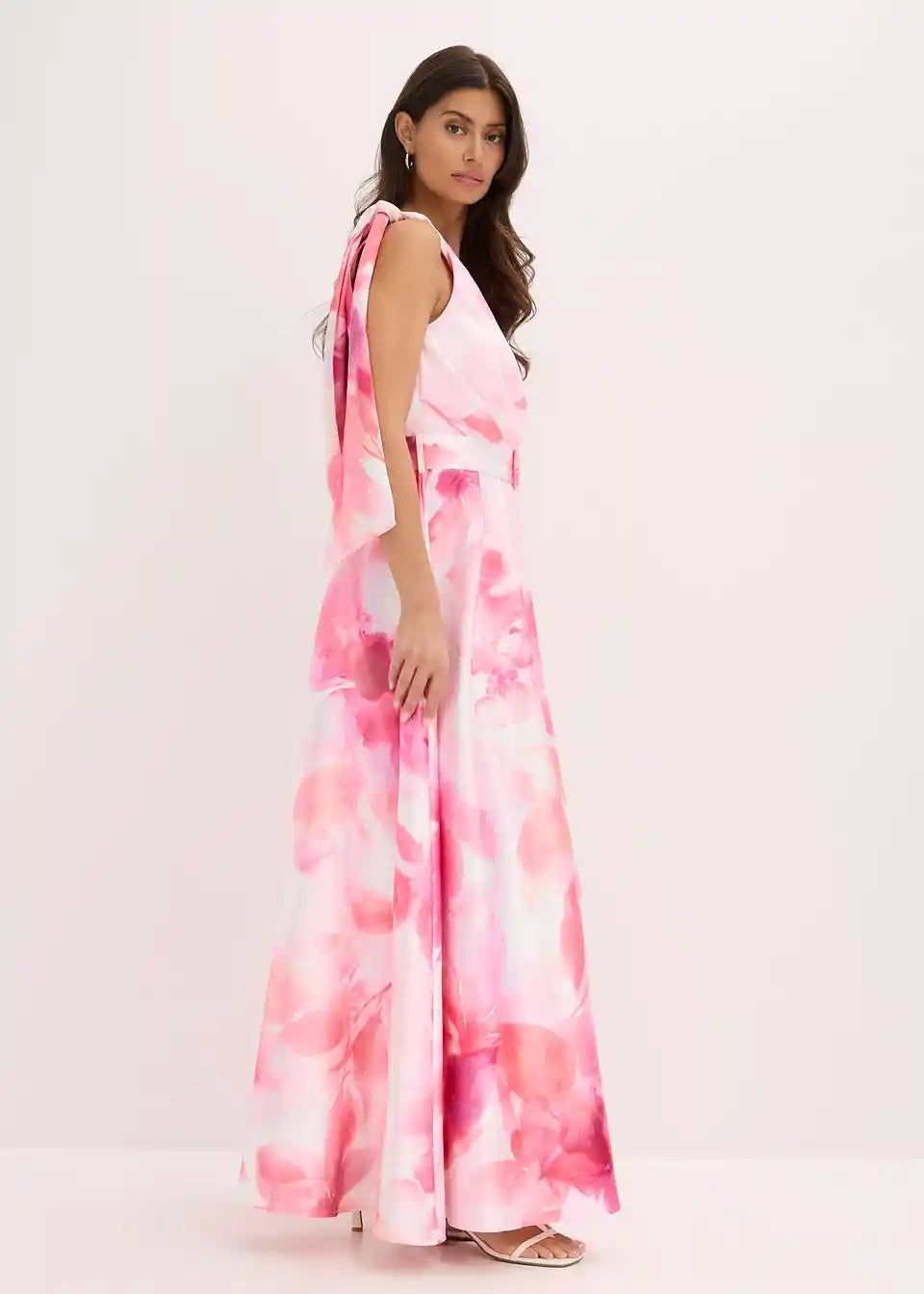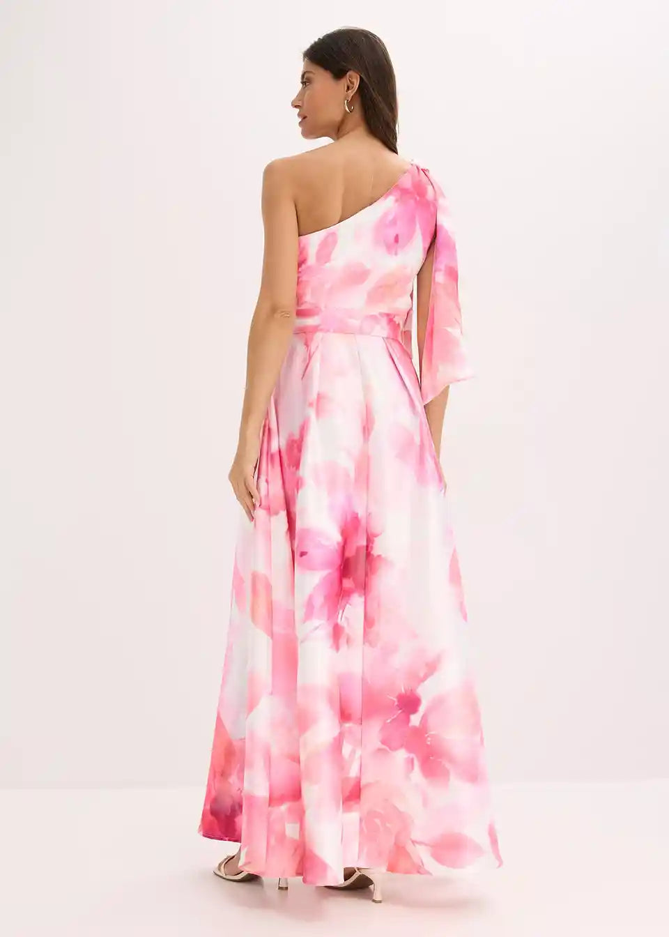 Moderna in ženstvena: enoramenska obleka v maksi dolžini iz sijočega satena z Allover potiskom, zaradi katerega je vsak kos unikat.