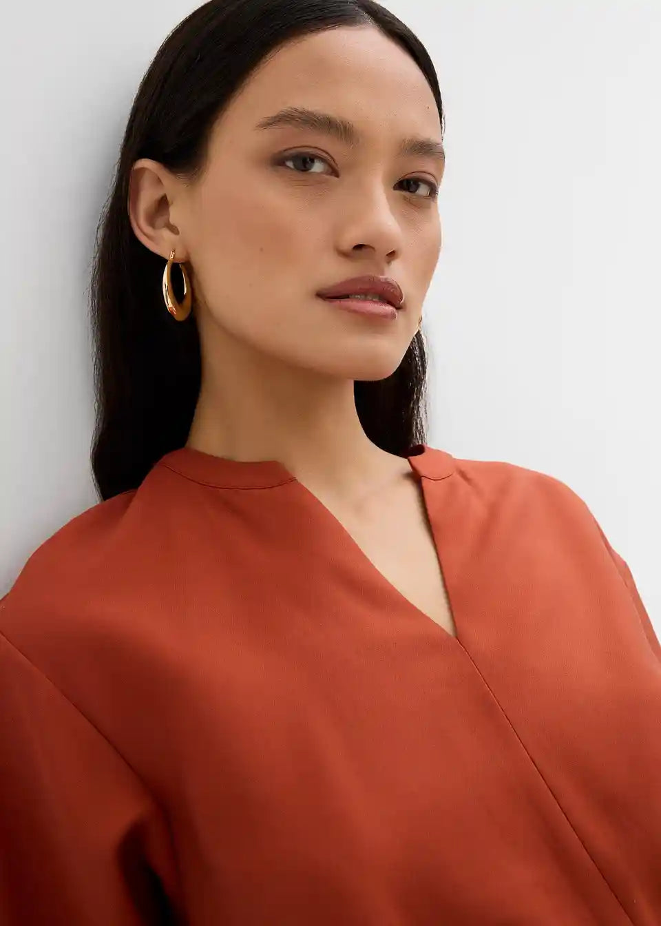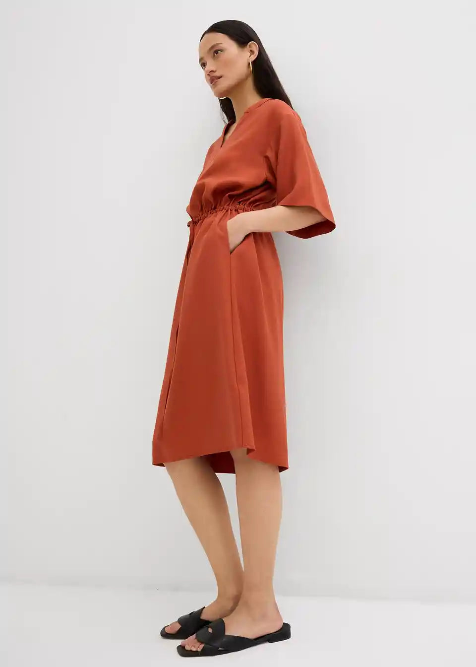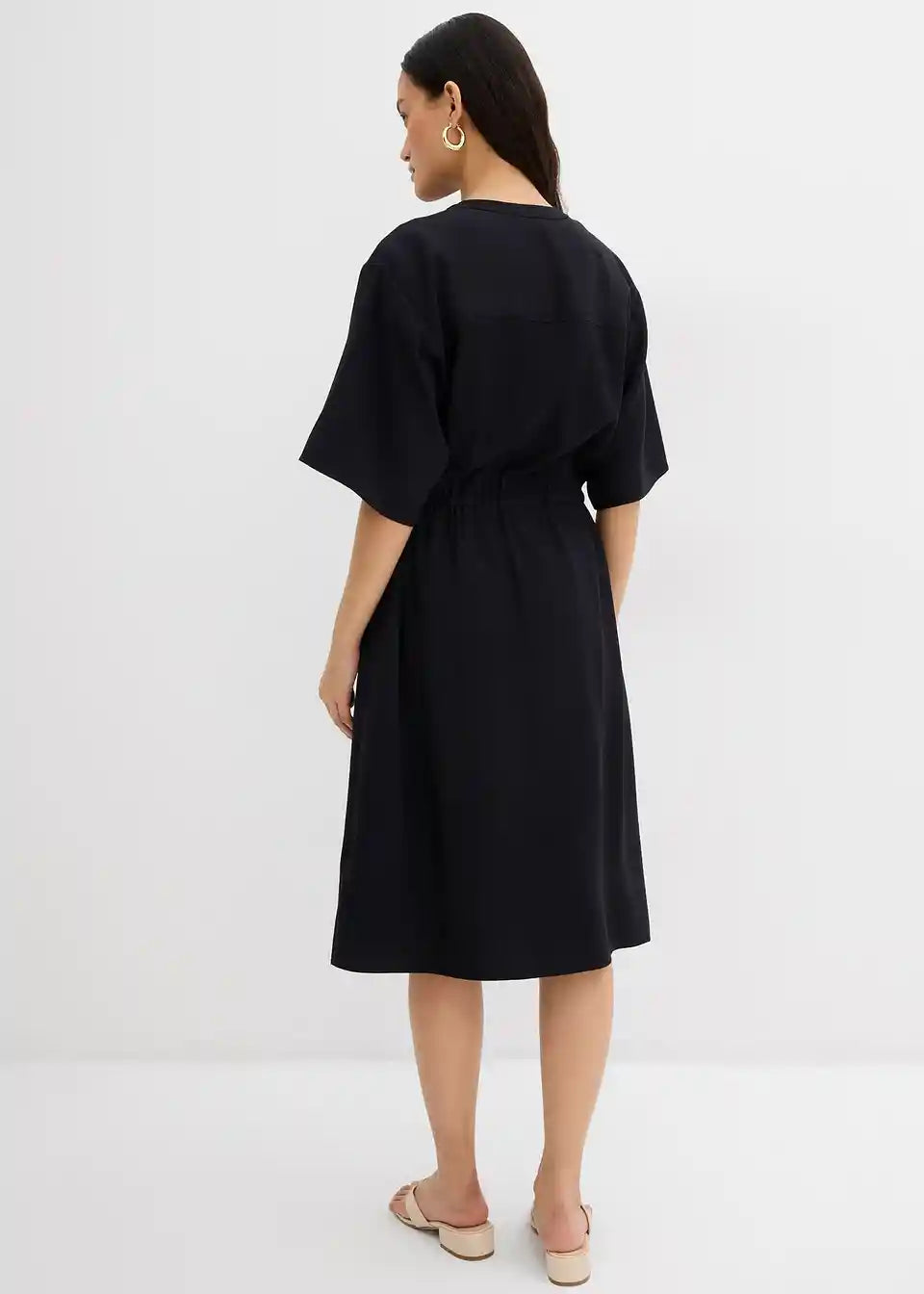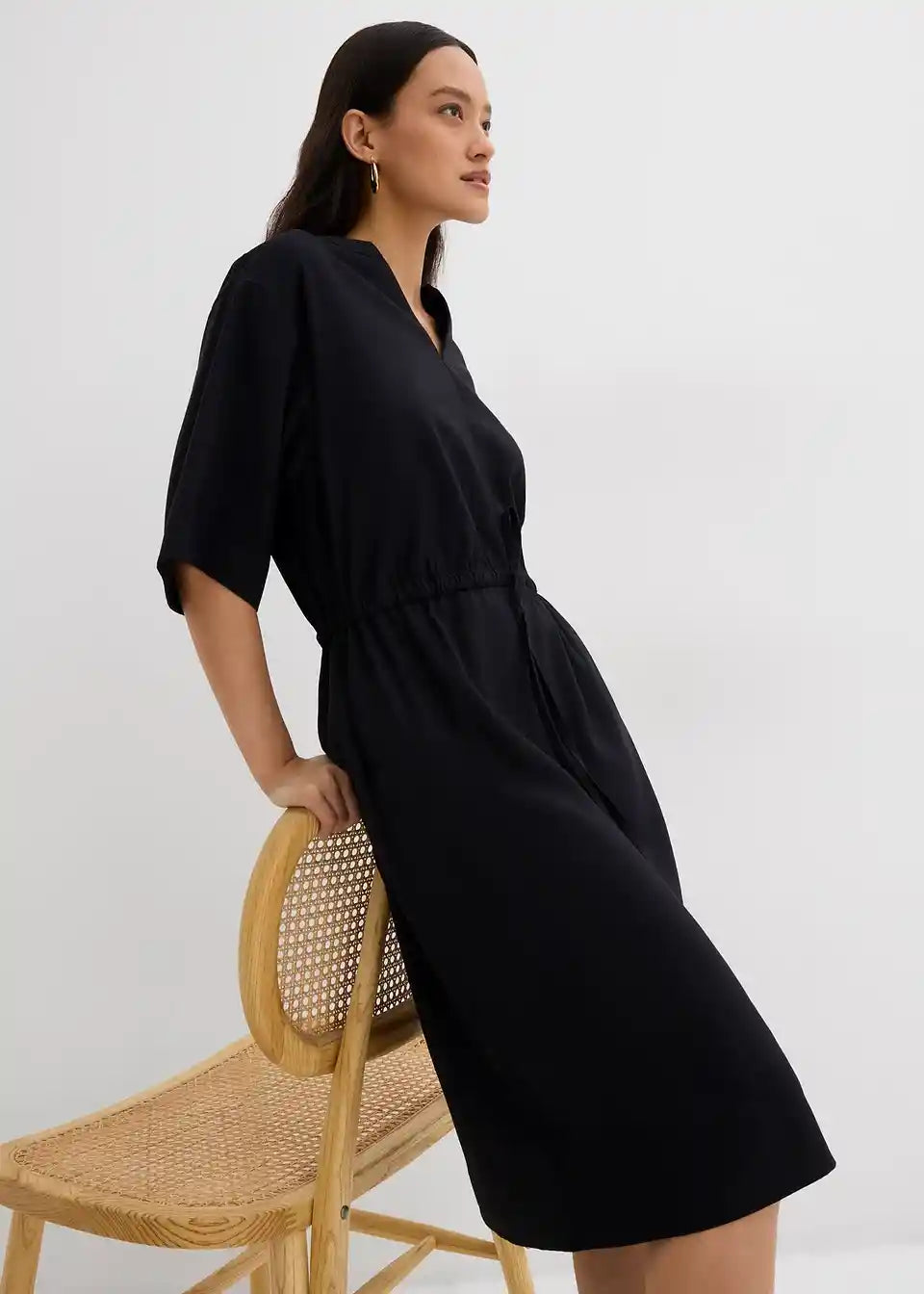 Obleka z diskretno utility estetiko s globokim V-izrezom, kratkimi rokavi ter barvno usklajeno vrvico za individualno prilagoditev pasu.