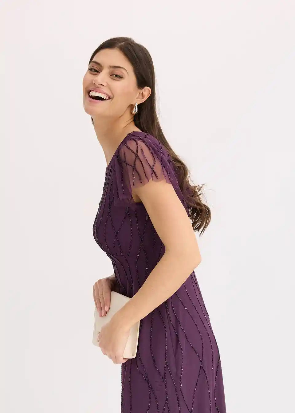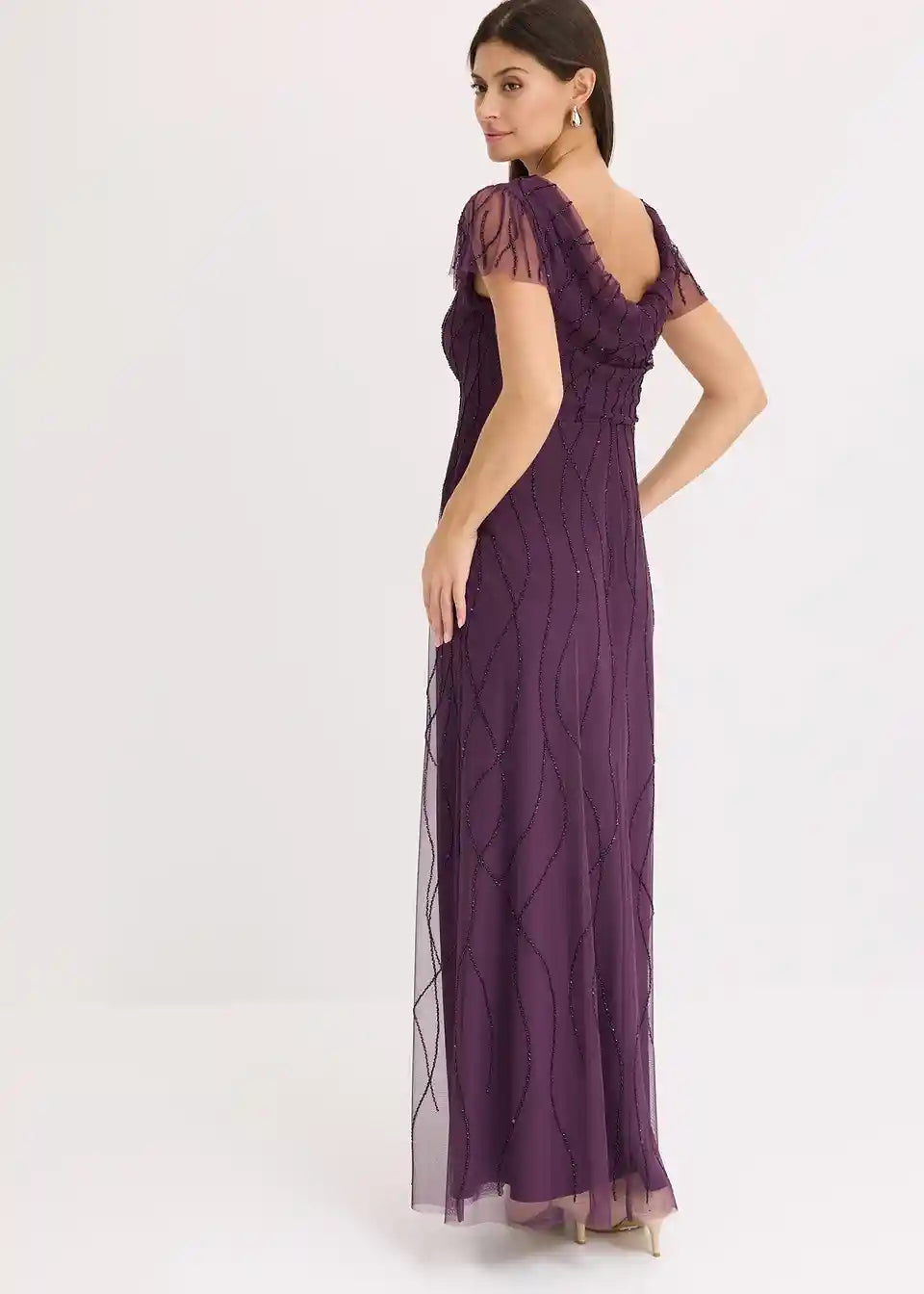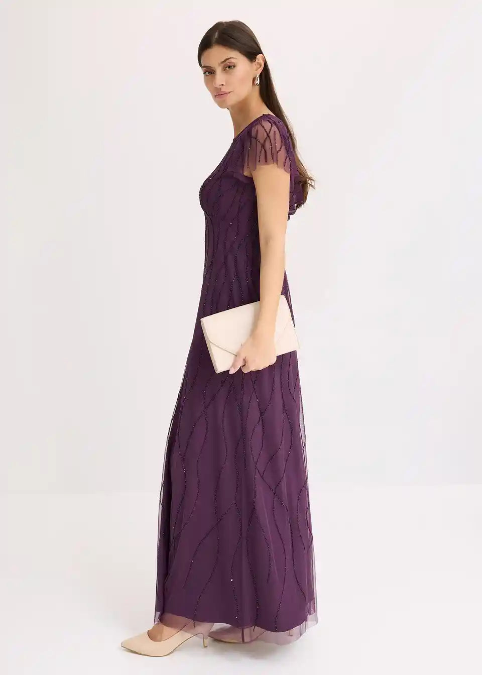 Moderna in ženstvena: večerna obleka v maksi dolžini iz nežnega tila z bisernim vezenjem