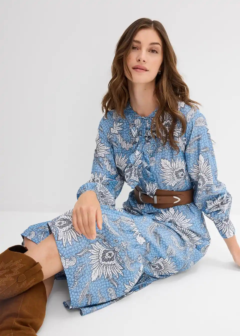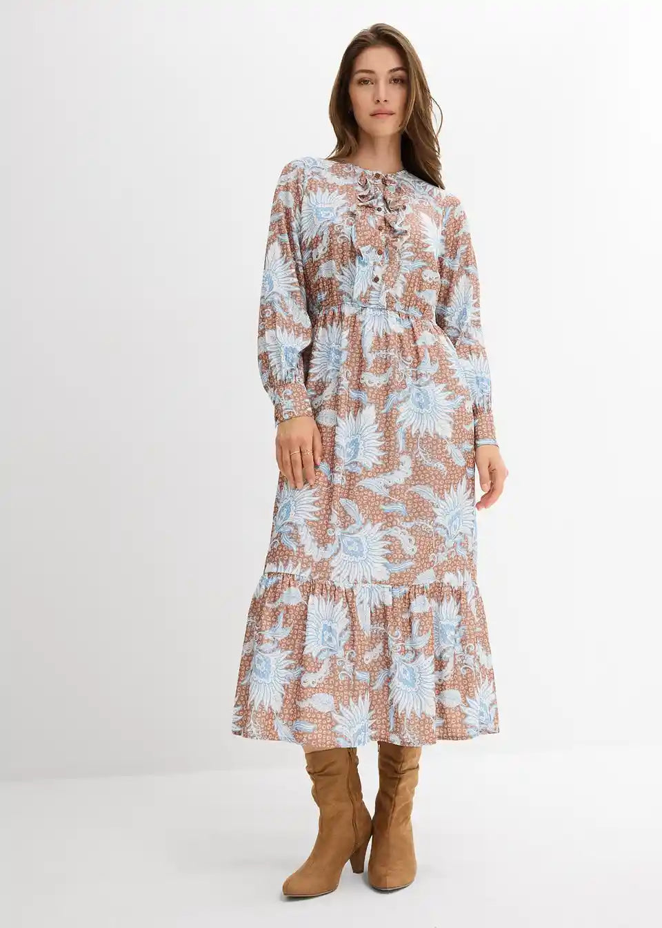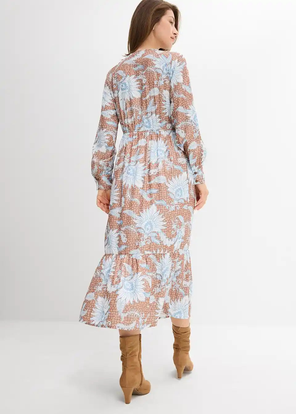 Dolga obleka z voluminoznimi rokavi in razširjenim krilnim delom