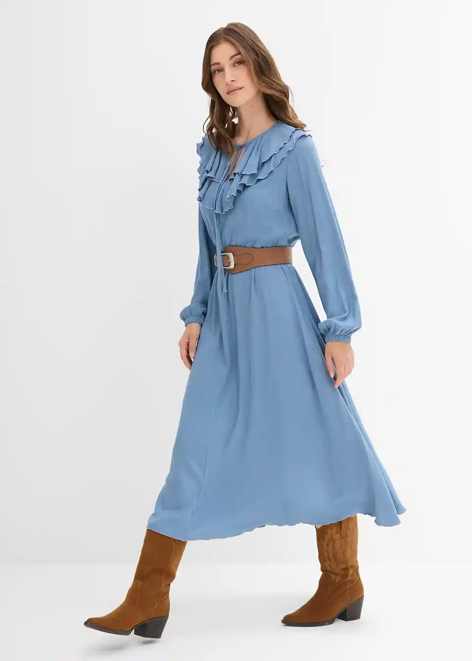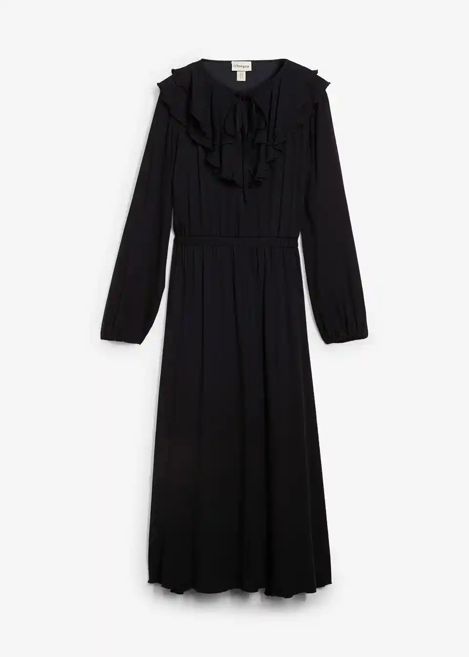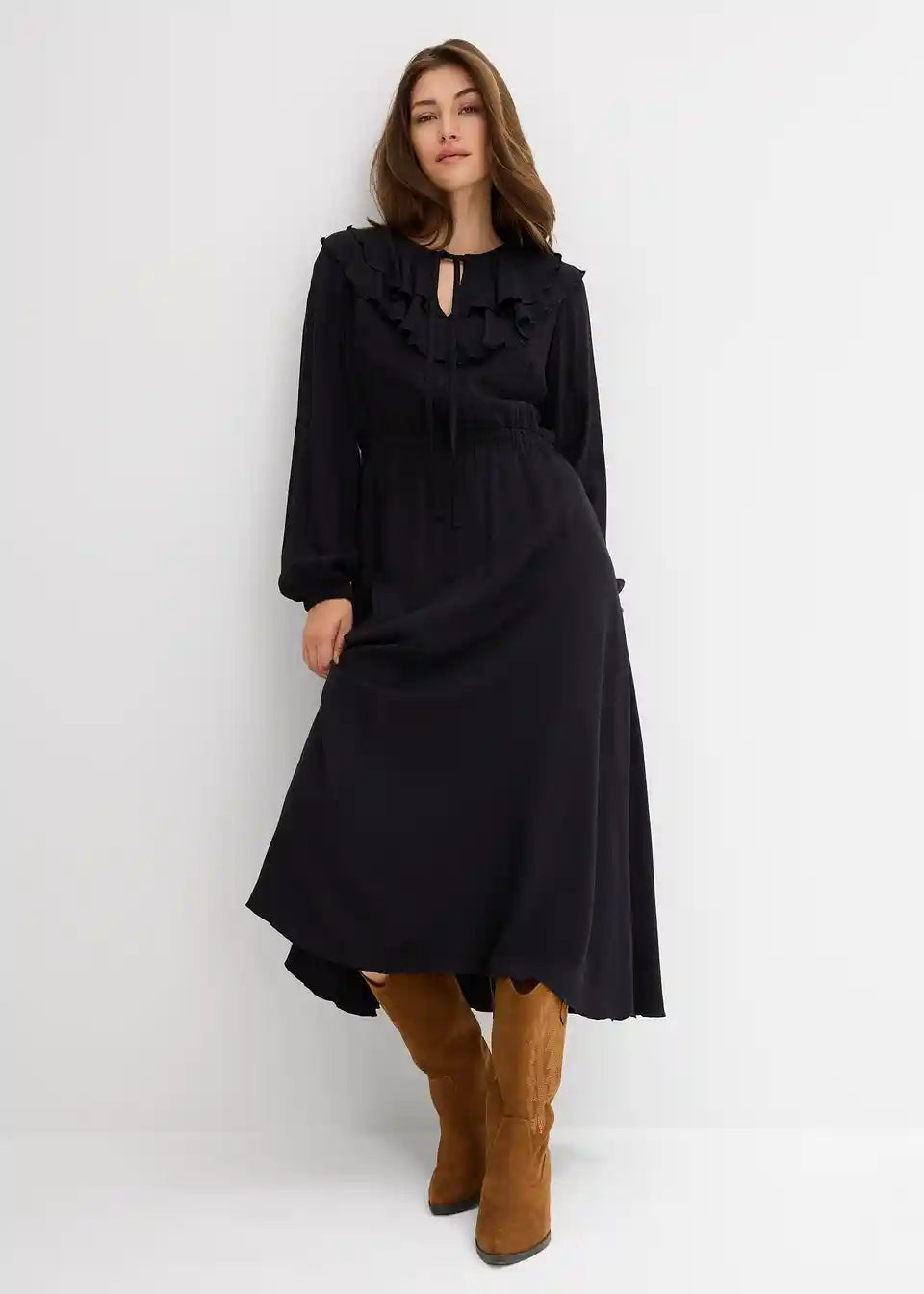 Dolga obleka z lepim ovratnikom in volanastim krilom