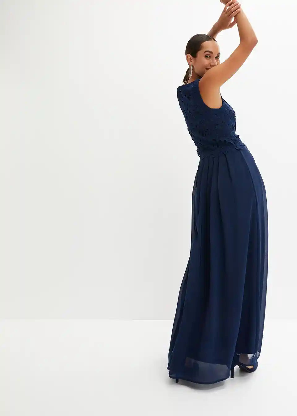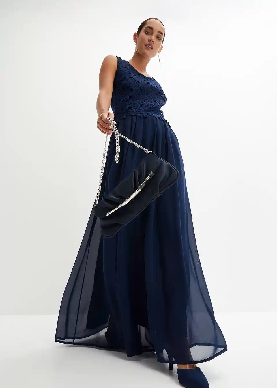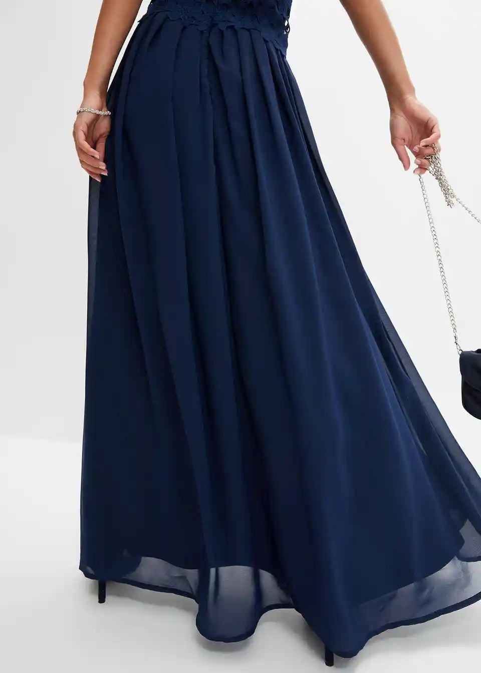 Elegantna maxi obleka z lepimi čipkami in šifonskim krilom