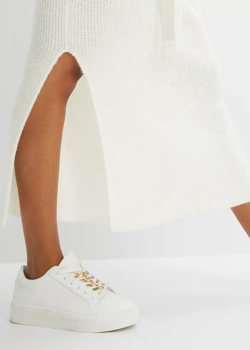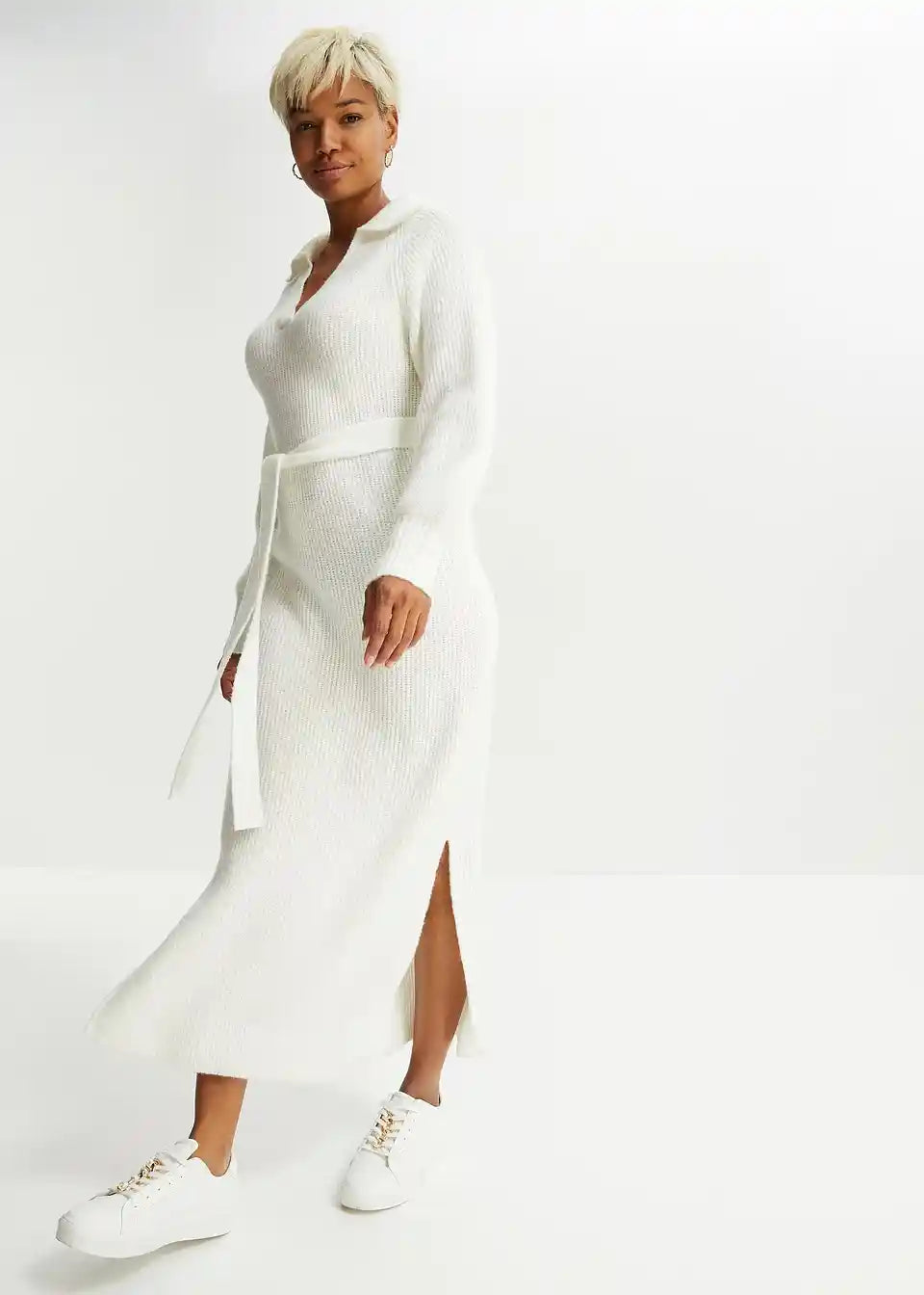 Modna pletena obleka s polo ovratnikom in balonastimi rokavi