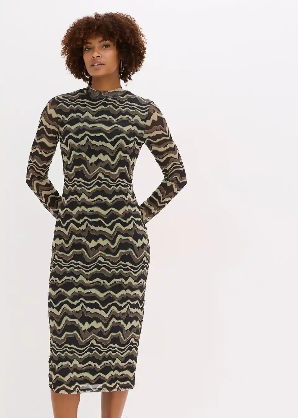 Modno potiskana midi obleka iz jerseyja iz mehke mreže s pokončnim ovratnikom