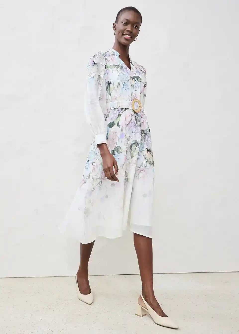 romantična midi obleka iz ramije z ujemajočim se pasom