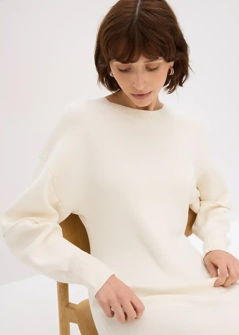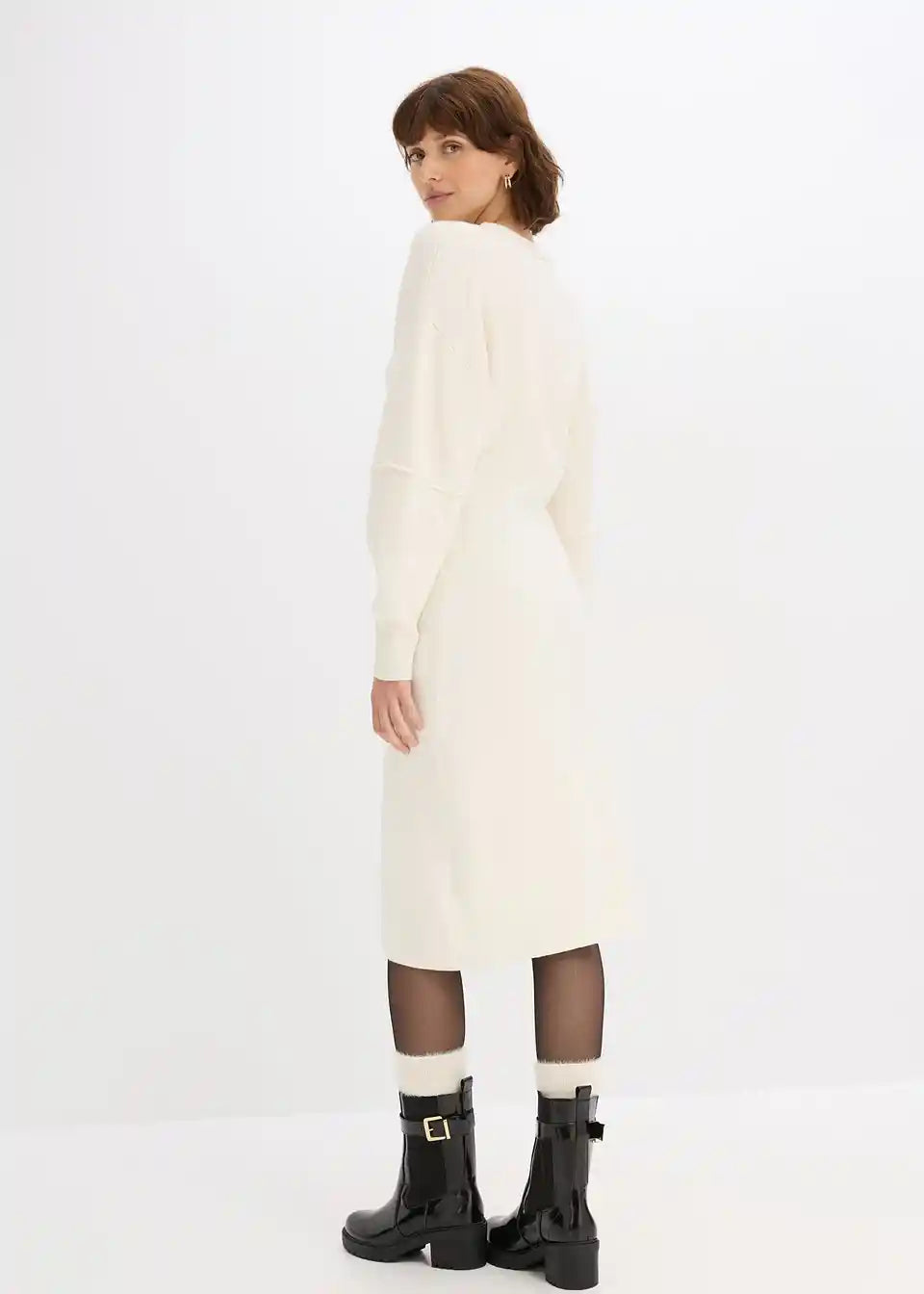 Oprijeta midi pletena obleka z voluminoznimi rokavi v klasičnem kroju