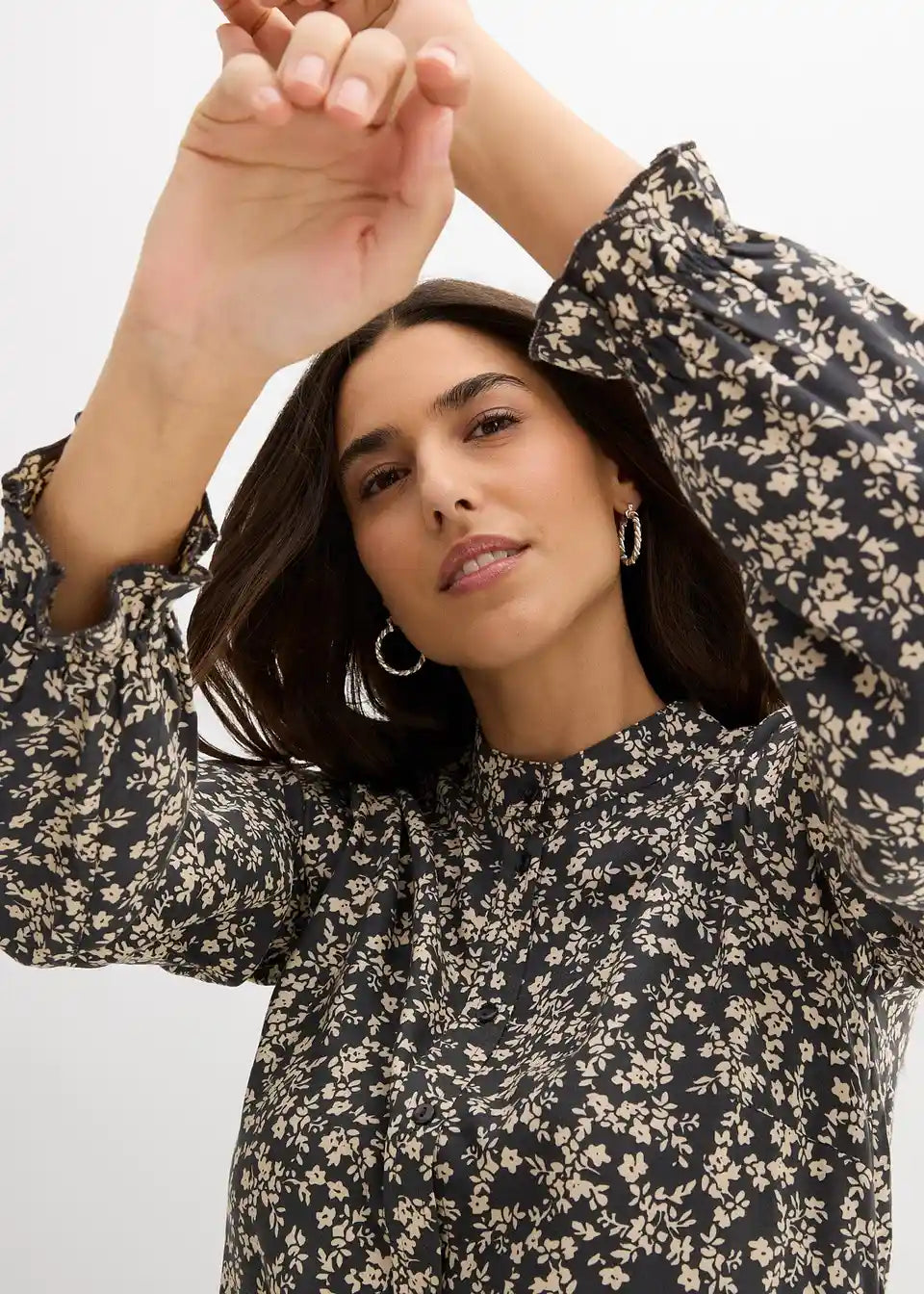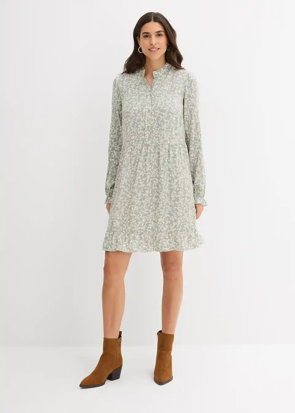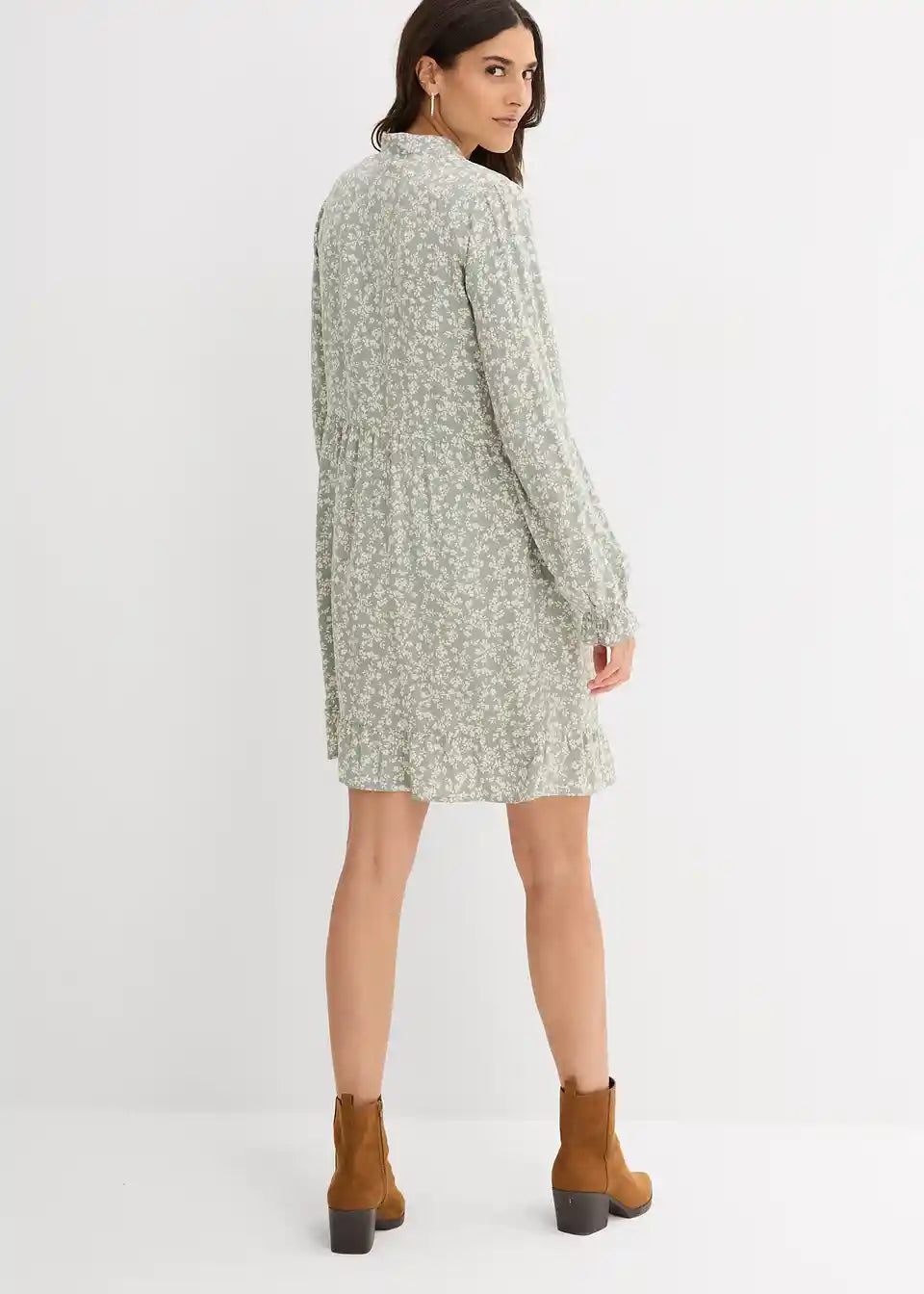 Široka kratka obleka z balonastimi rokavi in naborki na zaključkih rokavov
