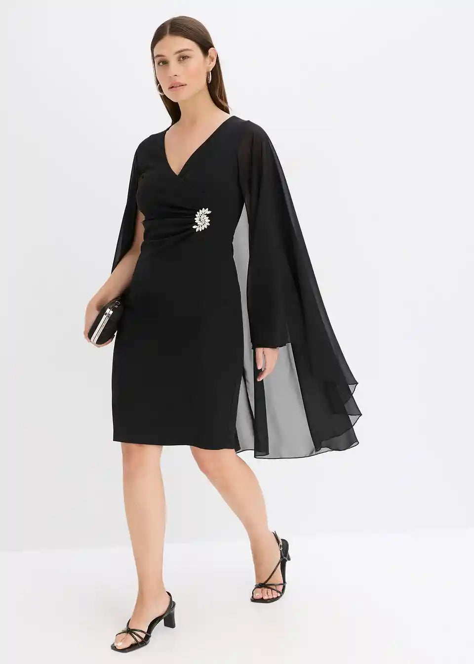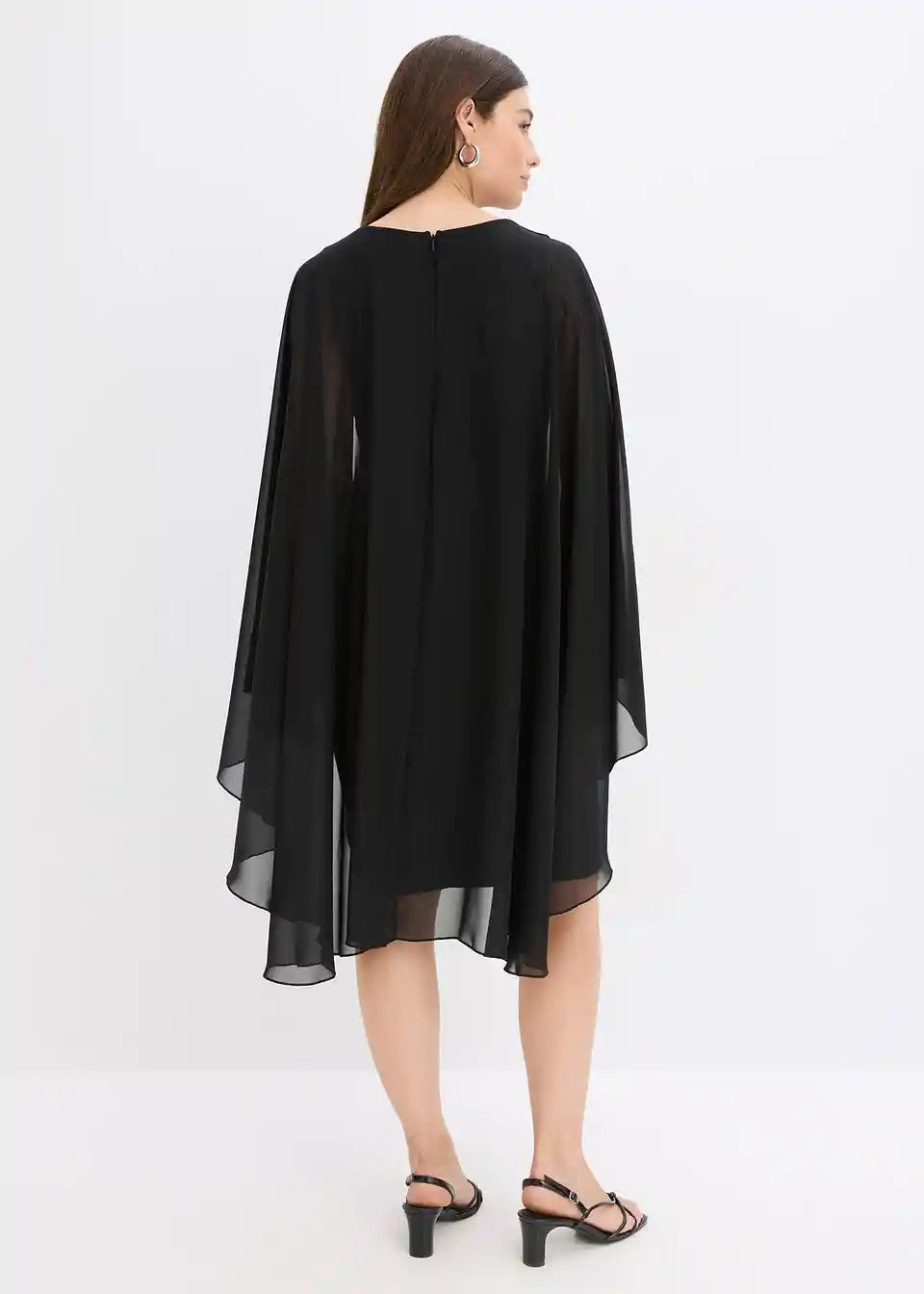 Moderno in ženstveno: mini obleka iz strukturiranega krepa s pončem iz finega šifona. Z drapiranjem in dodatkom v pasu je pravi magnet za poglede.