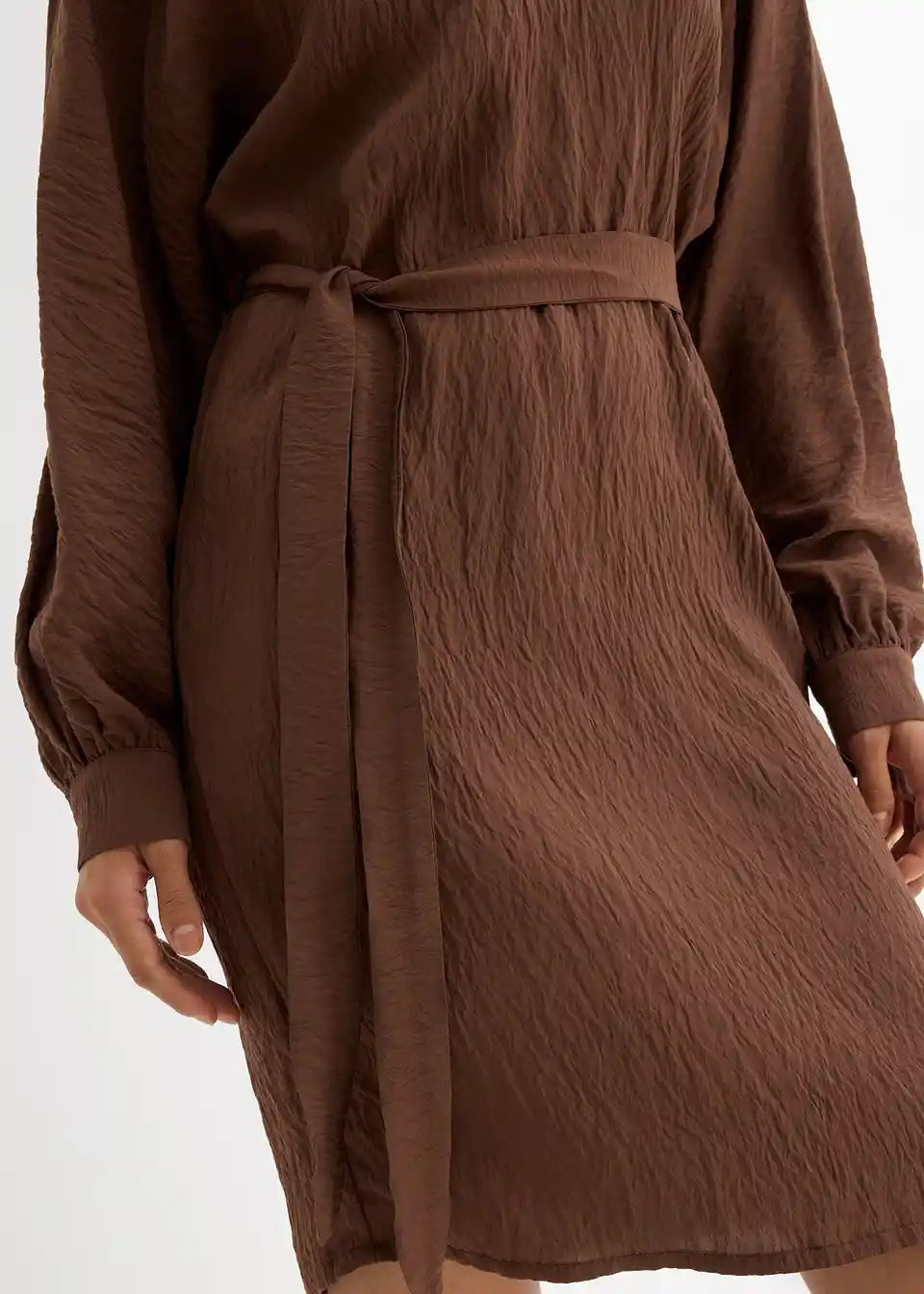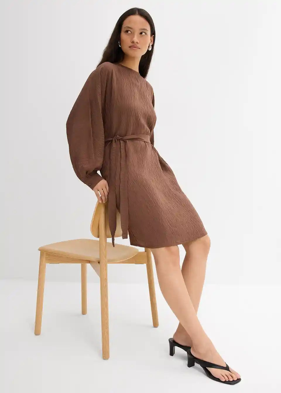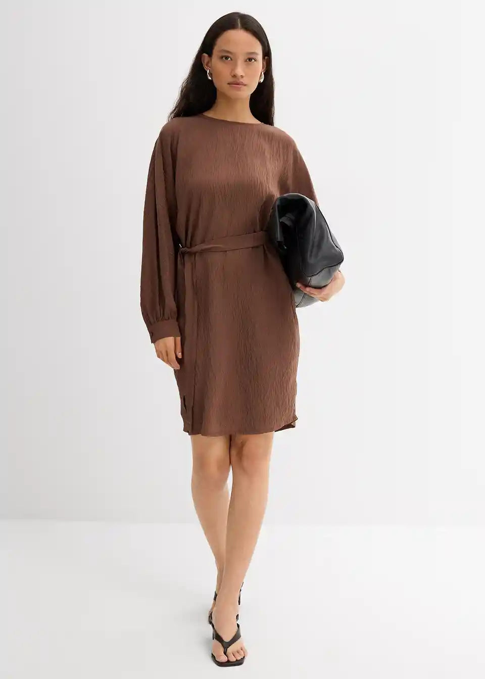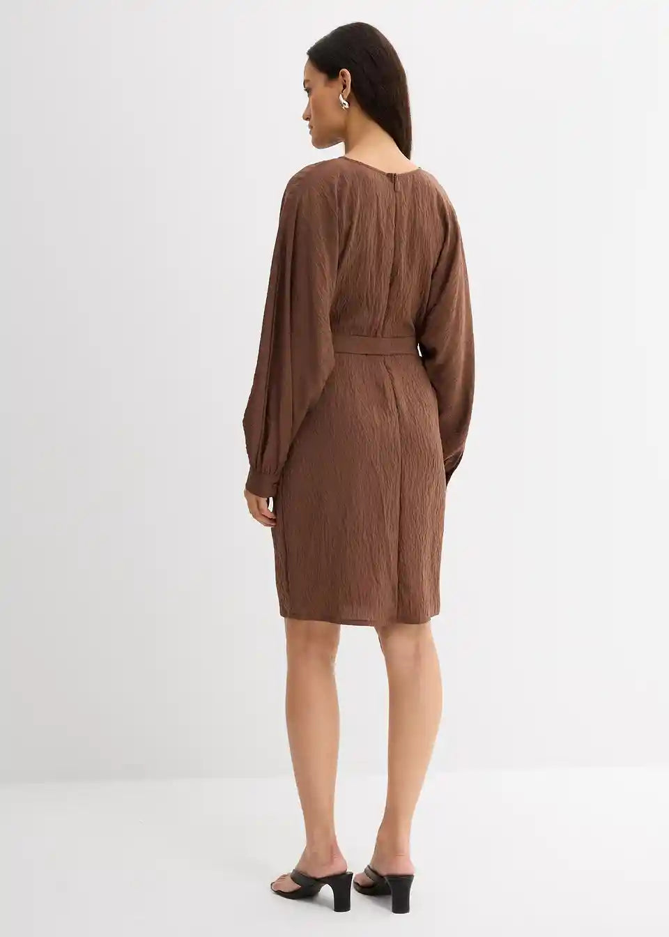 Obleka iz strukturiranega materiala s pasom v pasu ter zapenjanjem z zadrgo zadaj