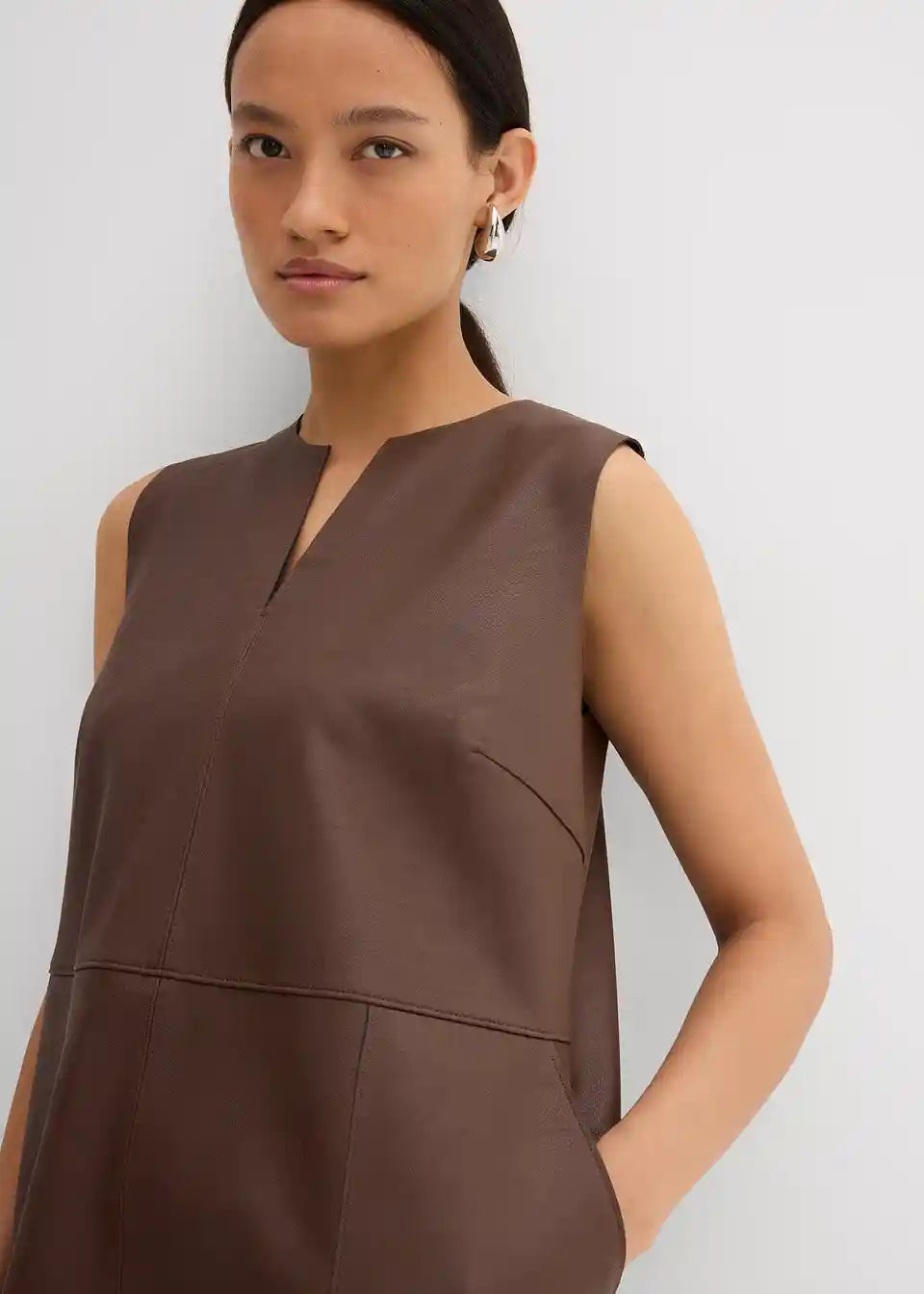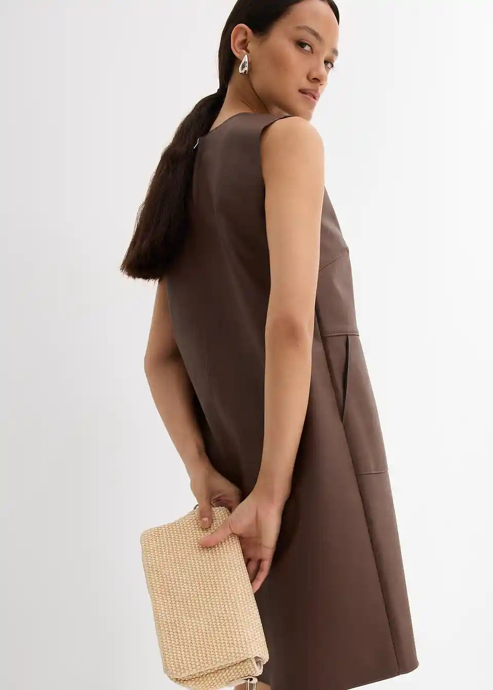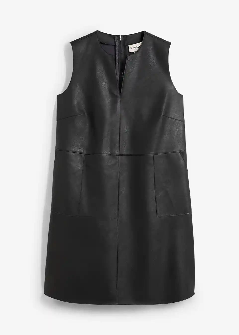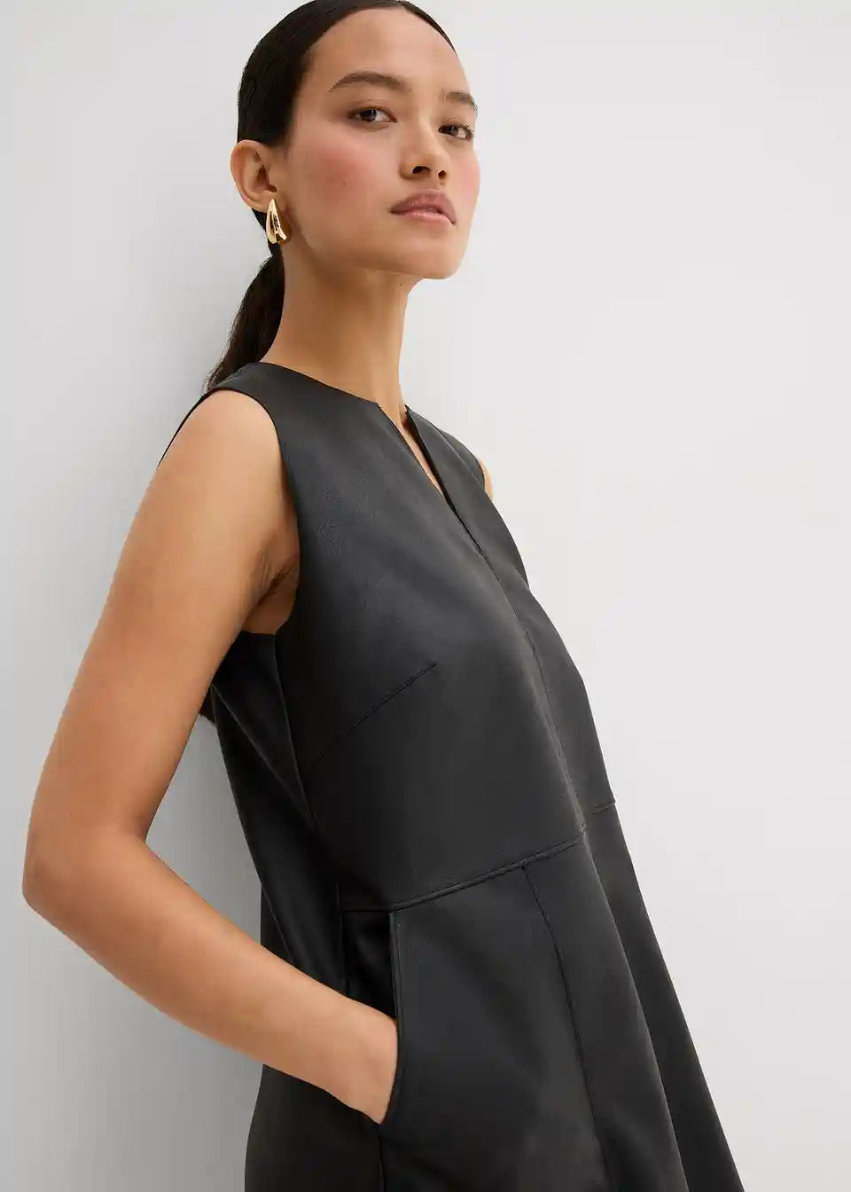 Obleka iz umetnega usnja brez rokavov z barvno skaldnimi prešivi, z našitimi žepi spredaj ter zapenjanjem z zadrgo zadaj